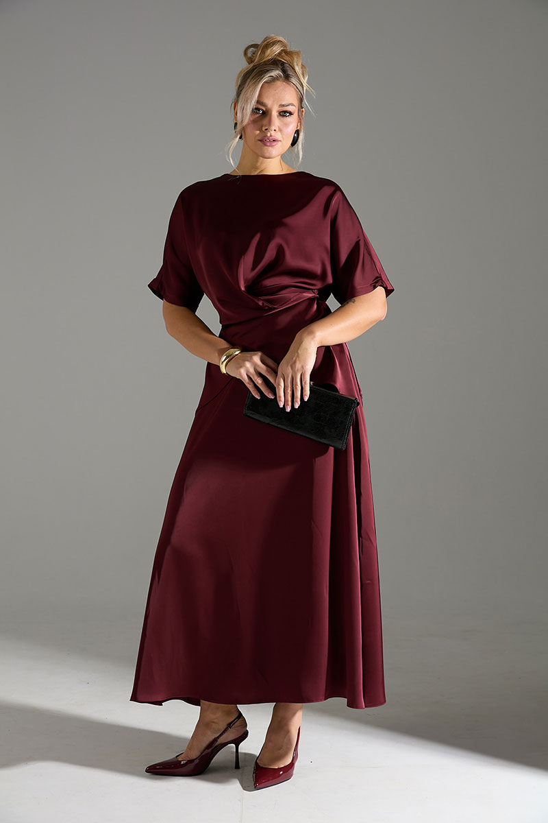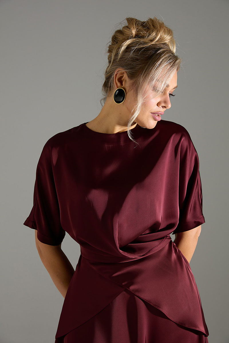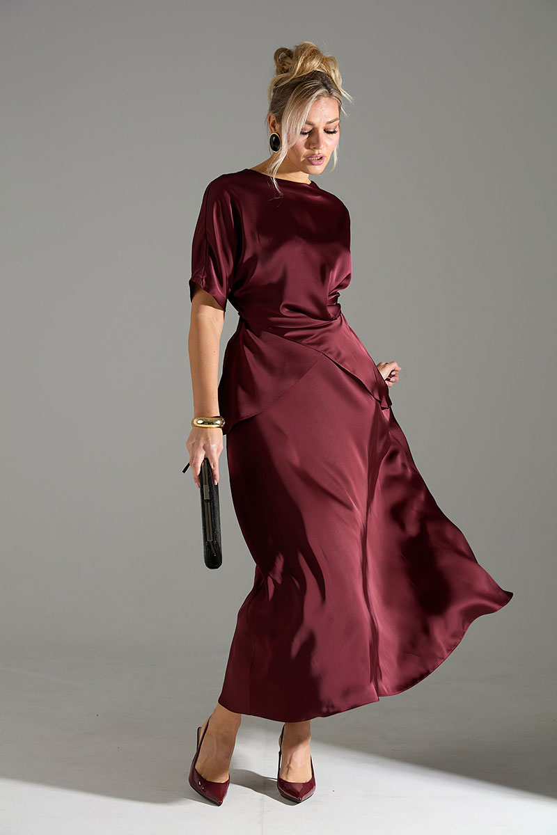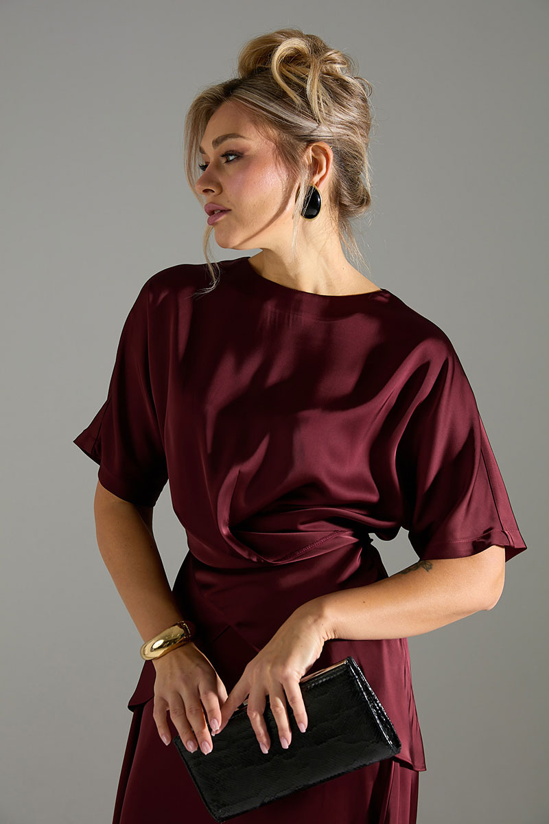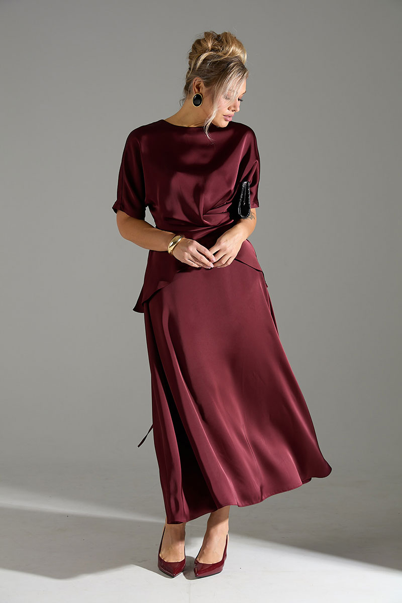 Костюм 2ка из лёгкой струящейся ткани с атласным благородным блеском, состоящий из блузки и юбки. Блузка свободного объёма, по переду имитация застежки на запАх. В комплекте шнур из основной ткани, которым можно приталить блузу, обвязав по кругу, или продеть через боковые швы и завязать по спинке. Юбка широкого объёма, длины "миди". Пояс юбки по спинке на резинке, сбоку застёжка на потайную молнию и пуговицу.