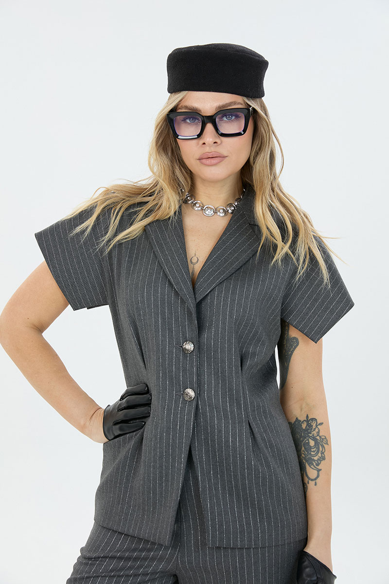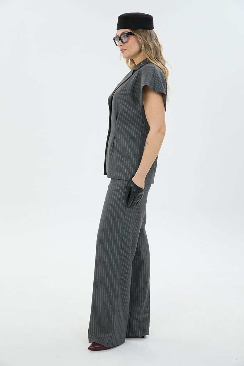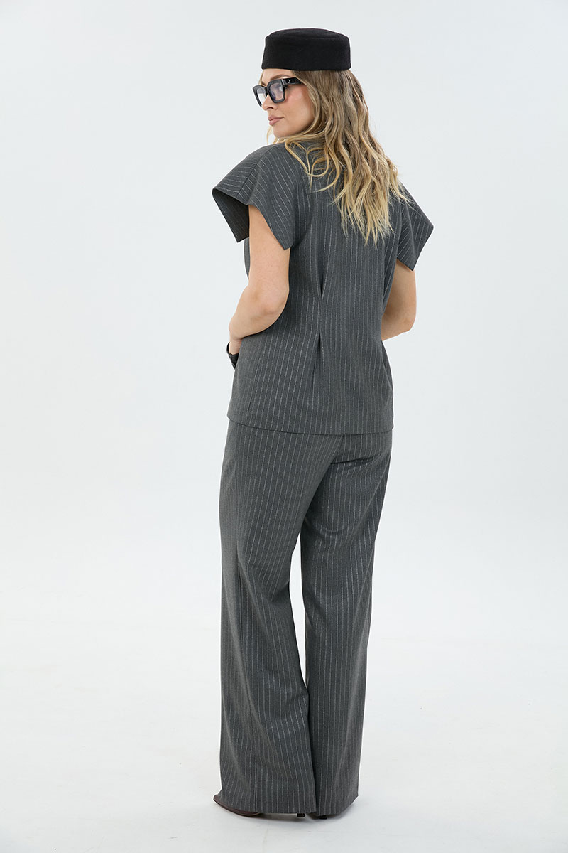 Приталенный жилет с застроченными защипами, короткими цельнокроеными рукавами-плечами и застёжкой на петлю и пуговицу. Брюки широкого объема, прямого силуэта. В боковых швах расположены карманы. Застежка-гульфик. Пояс отрезной, притачной. В задней части пояса вставлена эластичная тесьма (резинка). Пояс застегивается на петлю и крючок.
