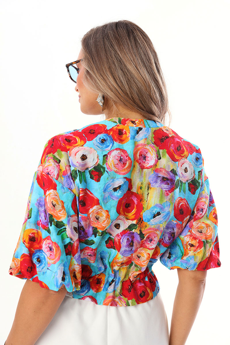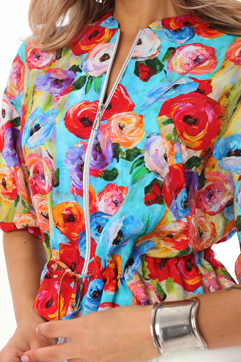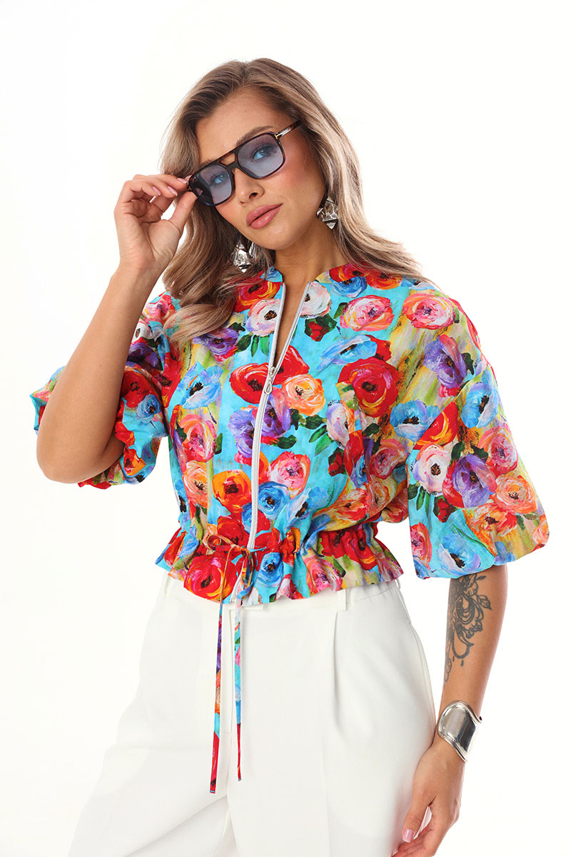 Бомбер с застёжкой на молнию и объёмными рукавами. Линия талии на кулисе и завязке из основной ткани.