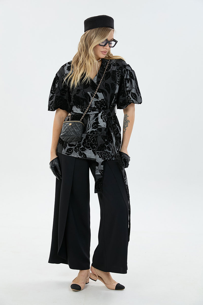 Жакет на подкладке с объёмными рукавами. Перед выполнен на запах с застежкой на кнопки, под пояс по талии. Широкие брюки-кюлоты свободного оригинального кроя с застёжкой на пуговицы. Без карманов.