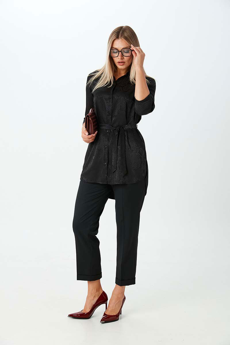Удлинённая блузка с застёжкой на пуговицы,воротник рубашечного типа,рукава 3/4. В комплекте пояс из основной ткани.