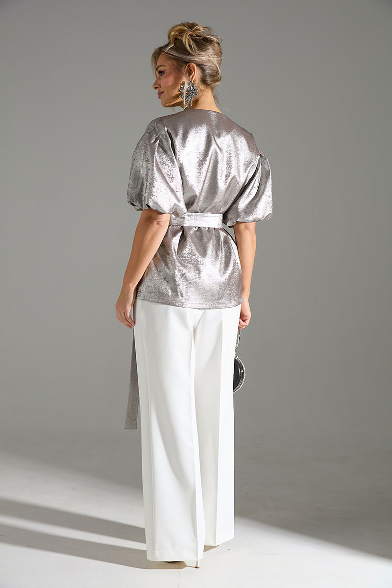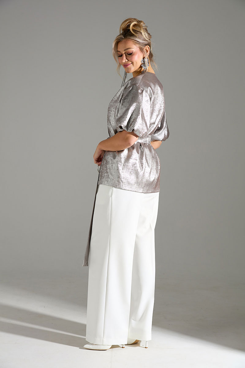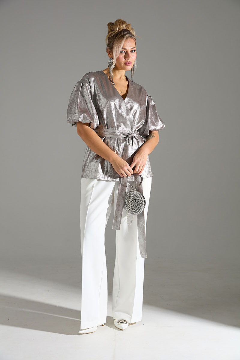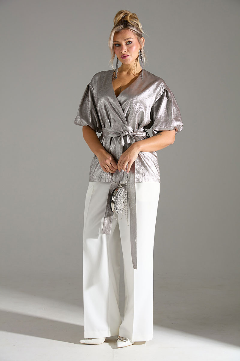 - Состав: блуза: ПЭ 70%; вискоза 30%; брюки: полиэстер 64%; вискоза 33%; эластан 3%Комплект 2ка; состоящий из жакета и брюк. Легкий жакет на подкладке с объёмными рукавами. Перед на запах с застежкой на кнопки; под пояс по талии. Длина жакета 72-78 см. Брюки широкого объема; прямого силуэта. На передних половинках брюк заутюжены стрелки; переходящие в складки по линии талии. На задних половинках также заутюжены стрелки. В боковых швах расположены карманы. Застежка-гульфик. Пояс отрезной; притачной. В задней части пояса вставлена эластичная тесьма (резинка). На пояс настрочены шлевки. Выступающая часть пояса застегивается на петлю и крючок