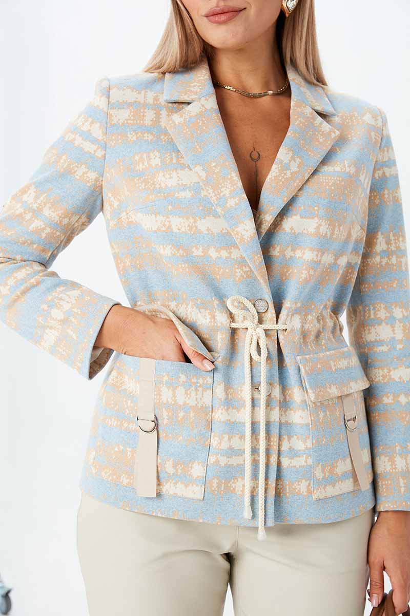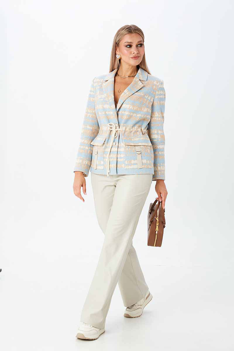 Однобортный жакет на подкладке прямого силуэта с застёжкой на две петли и пуговицы. По талии расположена кулиса и шнурок для приталивания жакета. По переду расположены накладные карманы с клапаном и декором.