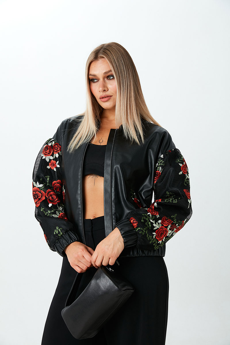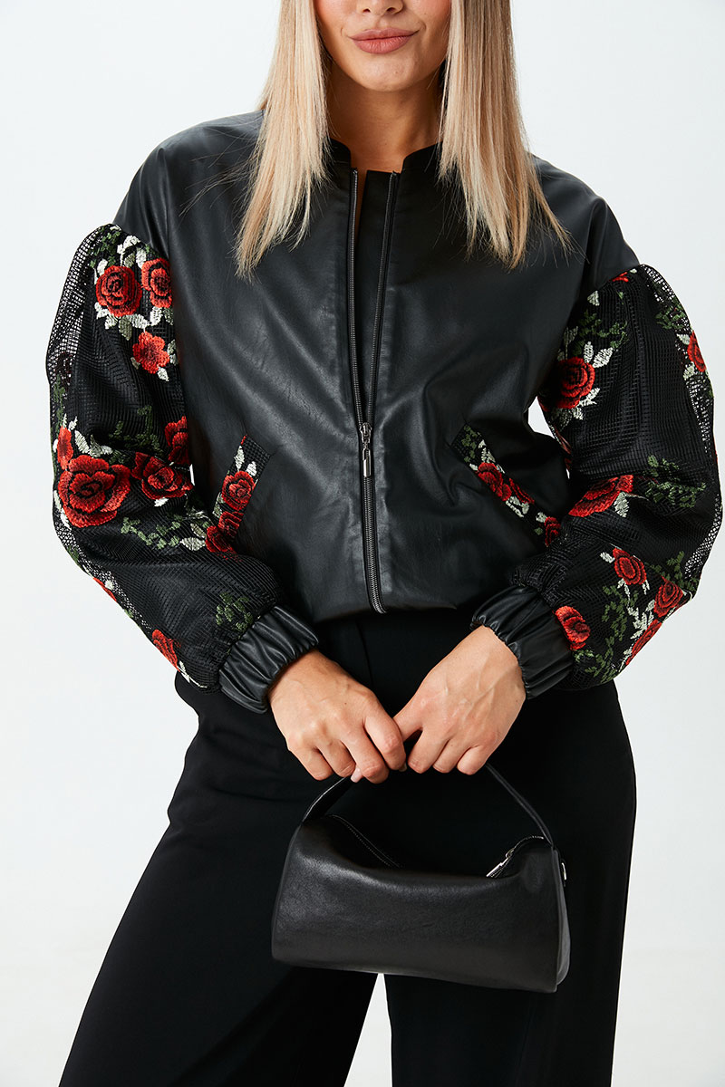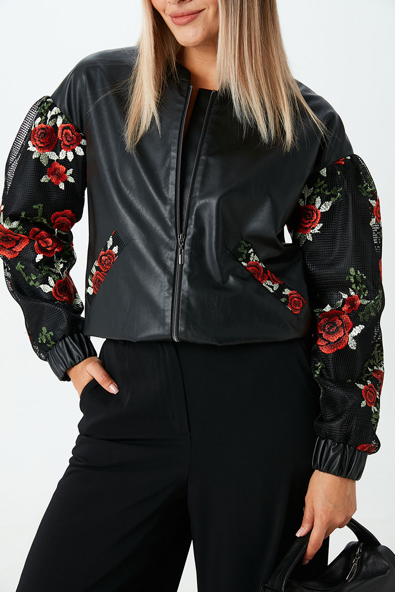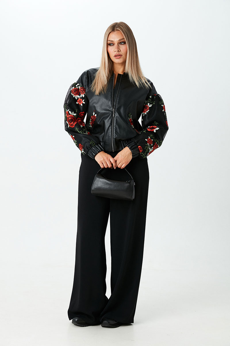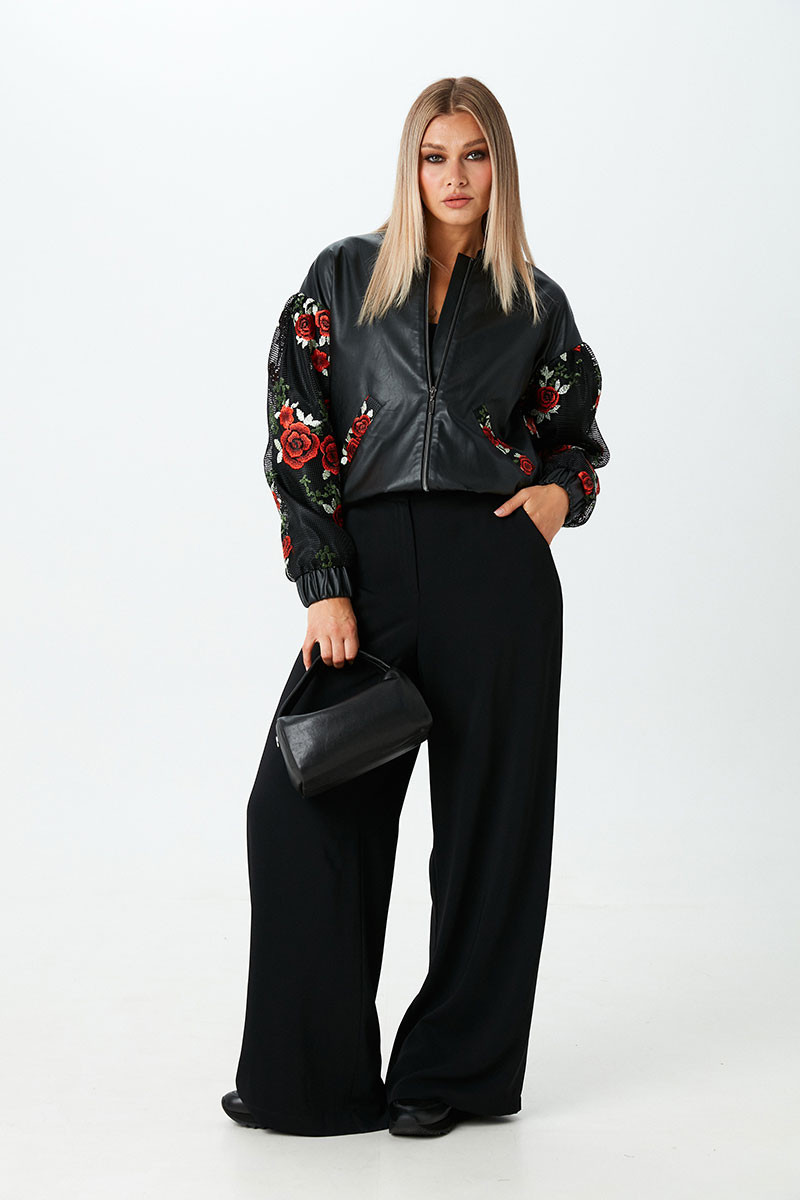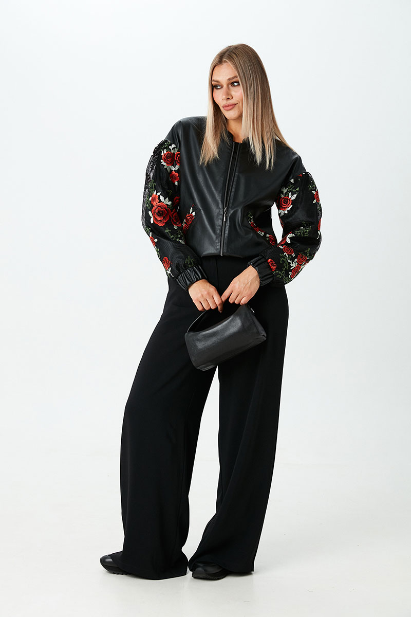 Бомбер из экокожи с объёмными рукавами и застёжкой на молнию. Манжеты и низ бомбера на резинке. Карманы и рукава бомбера декорированы сеткой с цветочной вышивкой. Брюки широкого объема, прямого силуэта. В боковых швах расположены карманы. Застежка-гульфик. Пояс отрезной, притачной. В задней части пояса вставлена эластичная тесьма (резинка). Пояс застегивается на петлю и крючок.