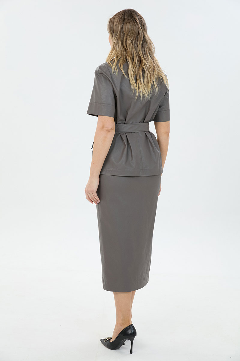 Юбка-карандаш из экокожи длины ниже колена, на подкладке. По переду юбка расположена застёжка на пуговицы. По бокам карманы.