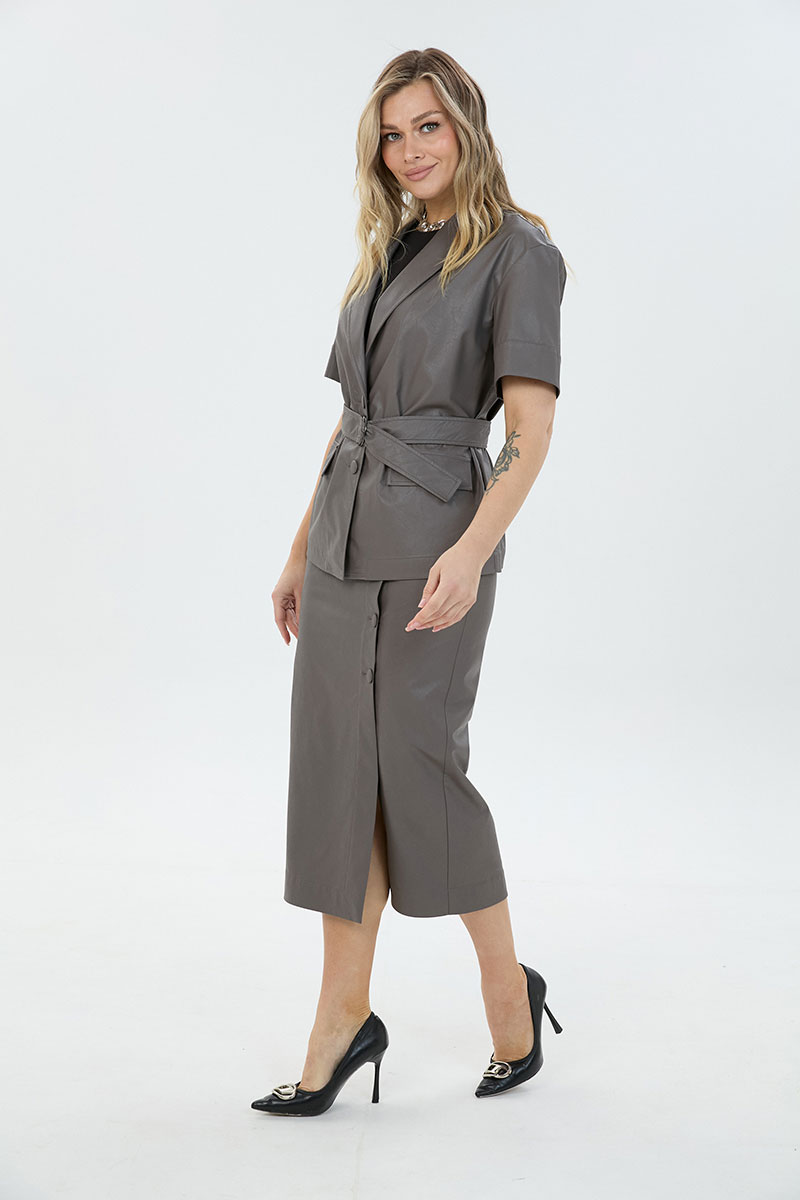 Жакет из экокожи на вискозе с короткими рукавами, без подкладки. Застёжка на пуговицы по центру. По переду имитация карманов с клапанами. В комплекте идёт пояс с пряжкой.