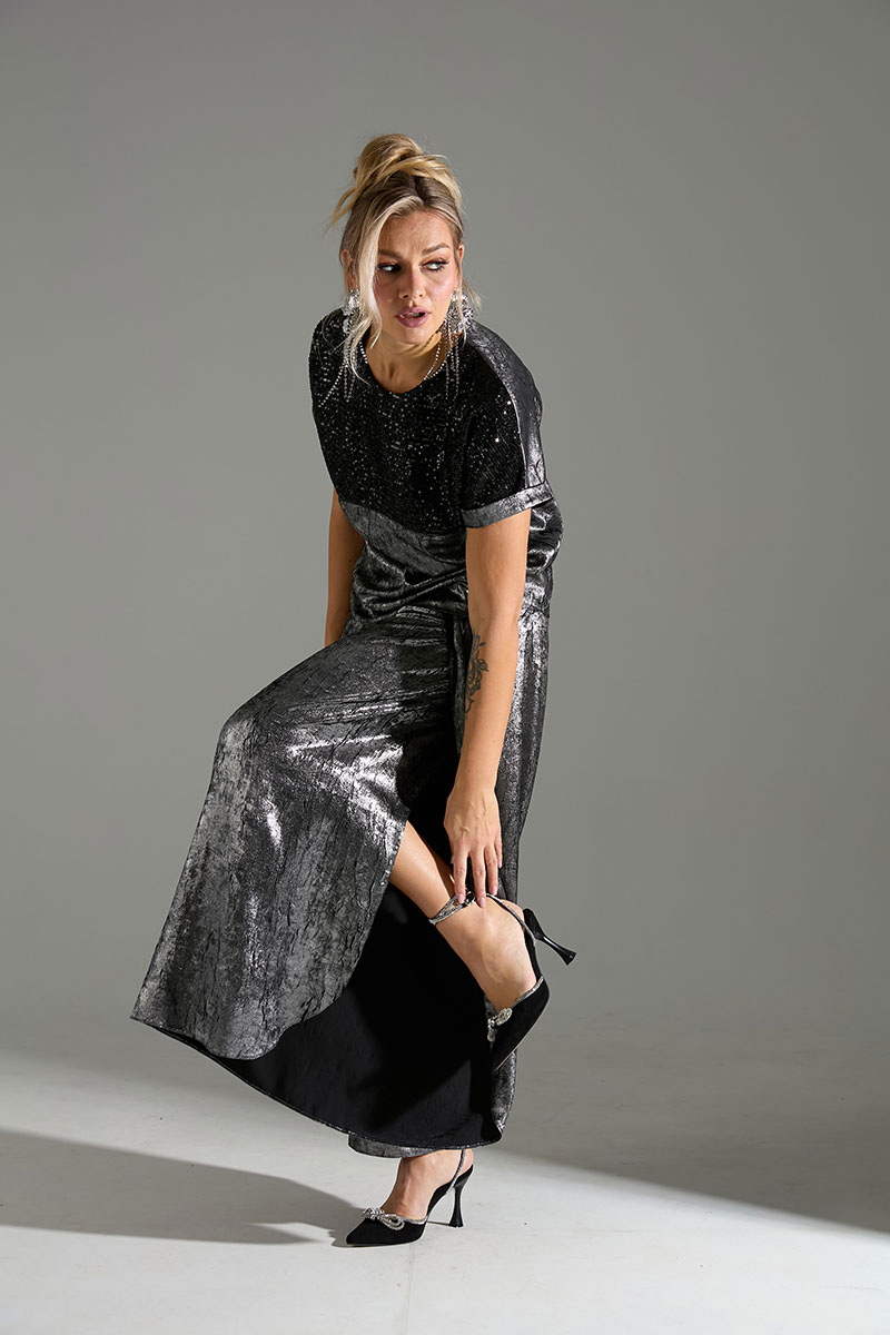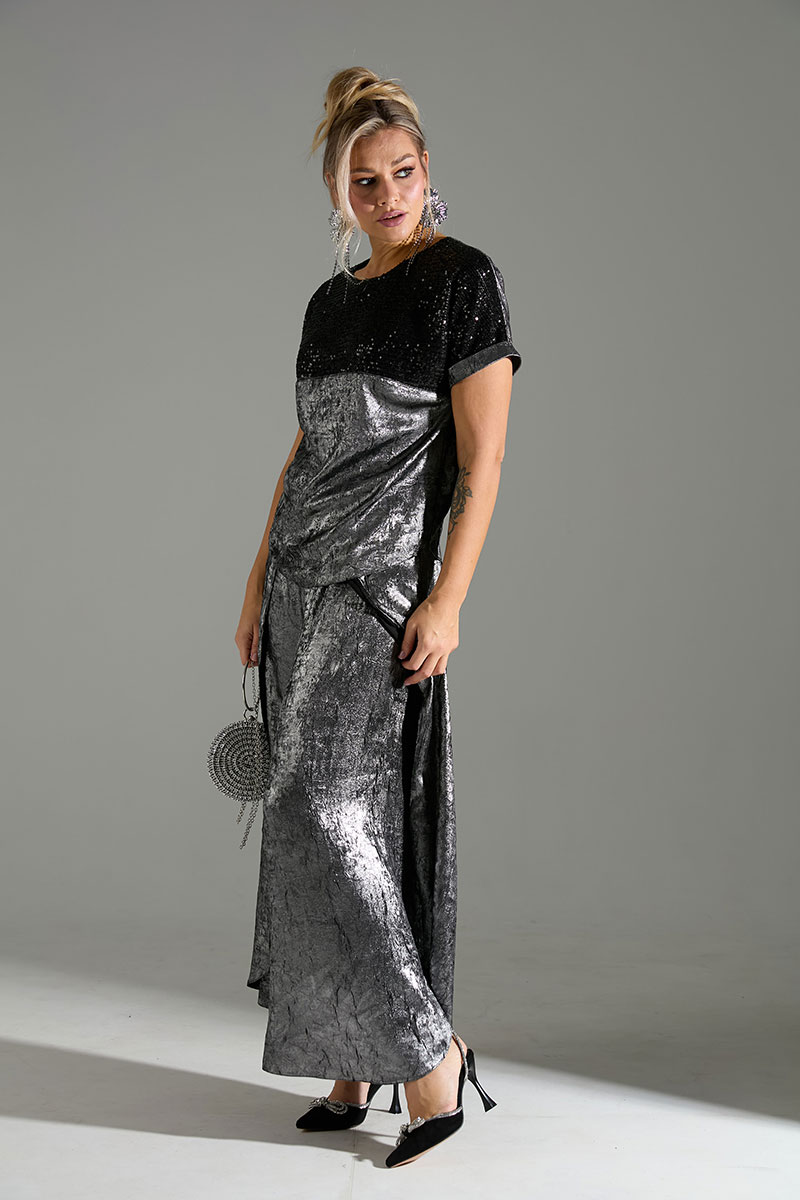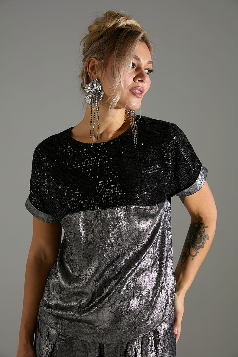 Блузка свободного объёма с короткими цельнокроеными рукавами с подворотами. Вырез горловины круглый. По переду подрез ниже линии груди. Верх блузки по переду выполнен из ткани