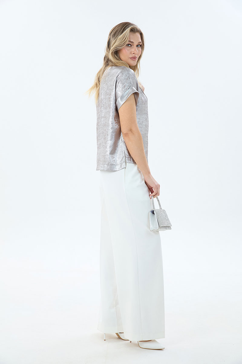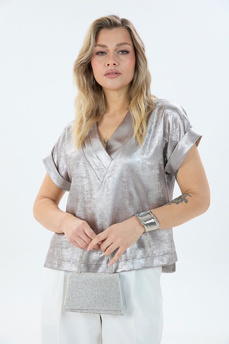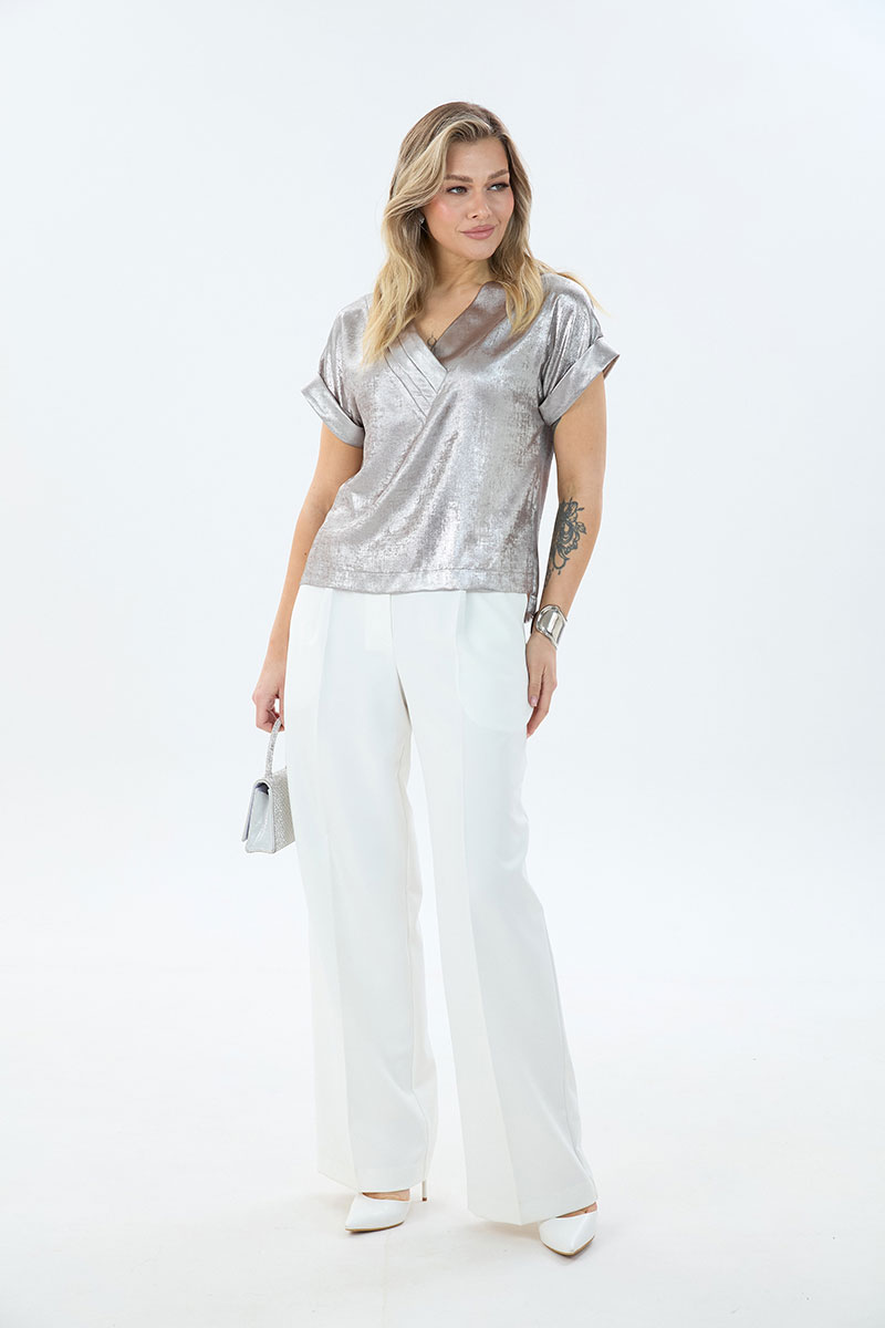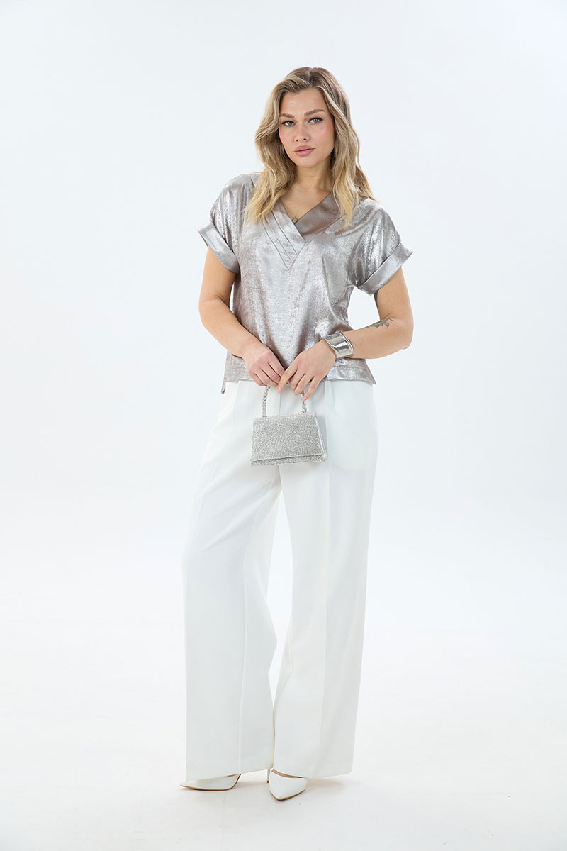 Комплект 2ка состоит из блузки и брюк. Блузка прямого силуэта свободного кроя из приятной к телу ткани с вискозной изнанкой и блестящей лицевой стороной. Спинка блузки удлинённая, горловина V-образная, на рукавах выполнены подвороты. Брюки из джинсовой ткани свободного объёма от бедра с застёжкой на молнию и пуговицу. По переду и сзади расположены карманы.