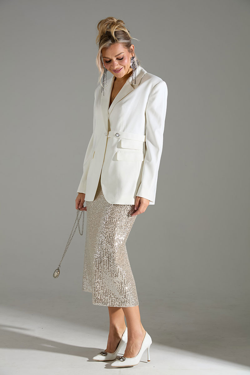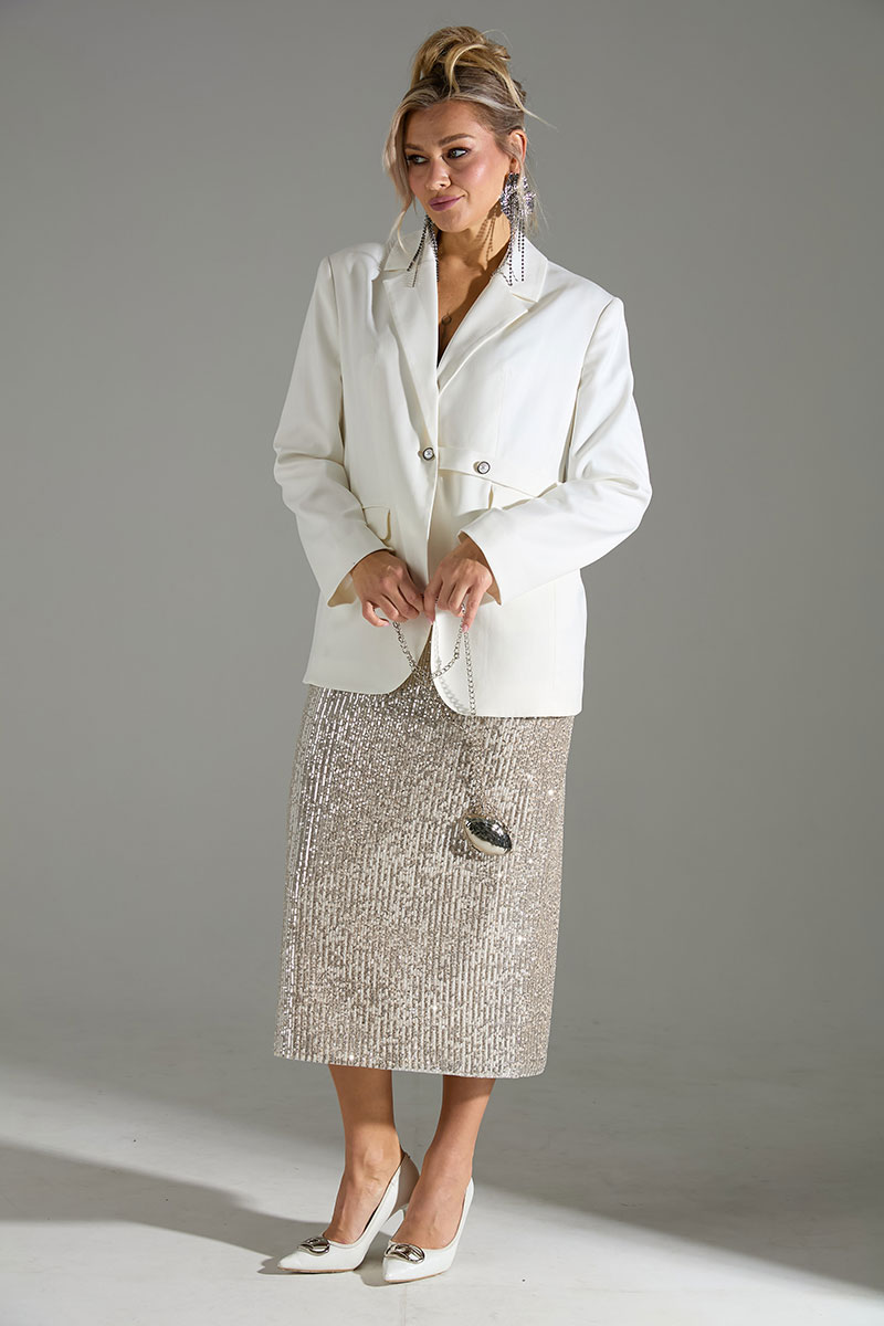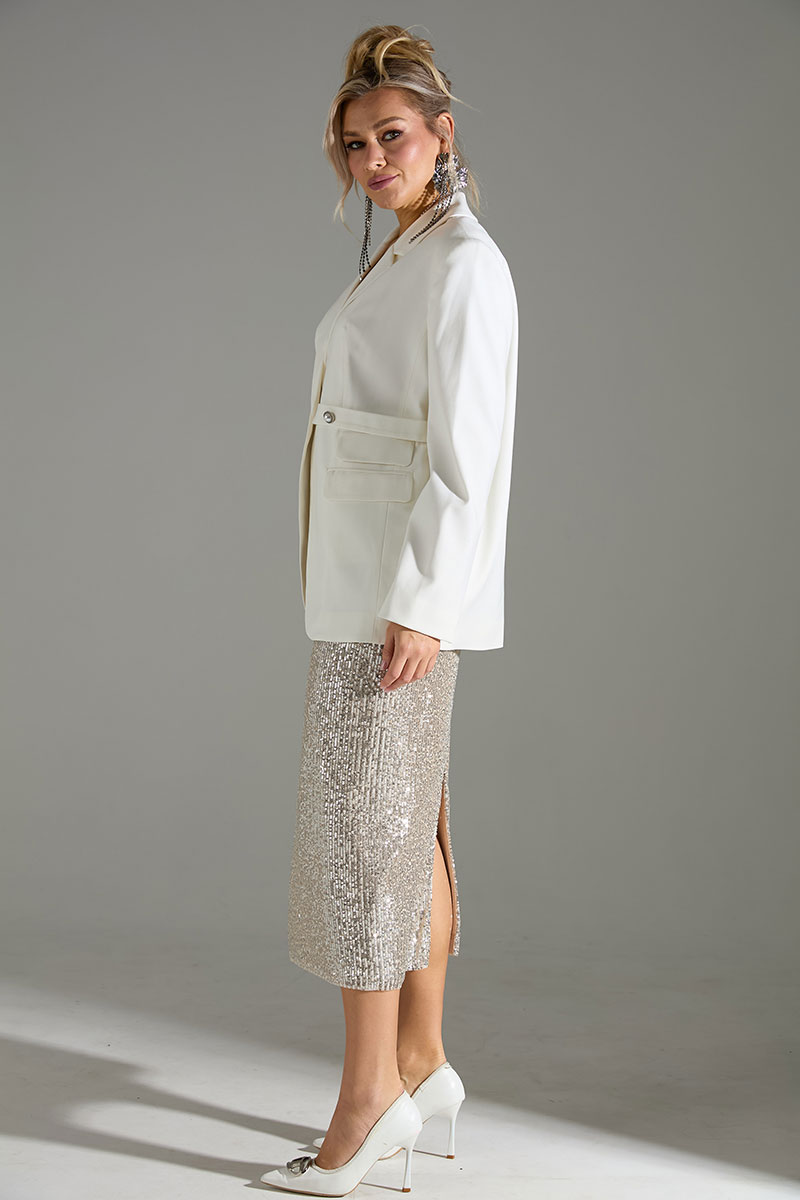 Комплект 2-ка, состоящий из жакета и юбки. Жакет однобортный объёмного силуэта с расширенным плечевым поясом. Застёжка на одну пуговицу. Из бокового шва выходит декоративная пата. По полочки распложены три прорезных кармана с клапанами, два из которых функциональные. Юбка- карандаш длиной ниже колена прямого силуэта. Пояс юбки и подкладка выполнены из эластичного трикотажа. Верхний слой юбки из лёгкой ткани расшитой пайетками. Застёжка на потайную молнию в среднем шве по спинке, разрез расположен внизу среднего шва.