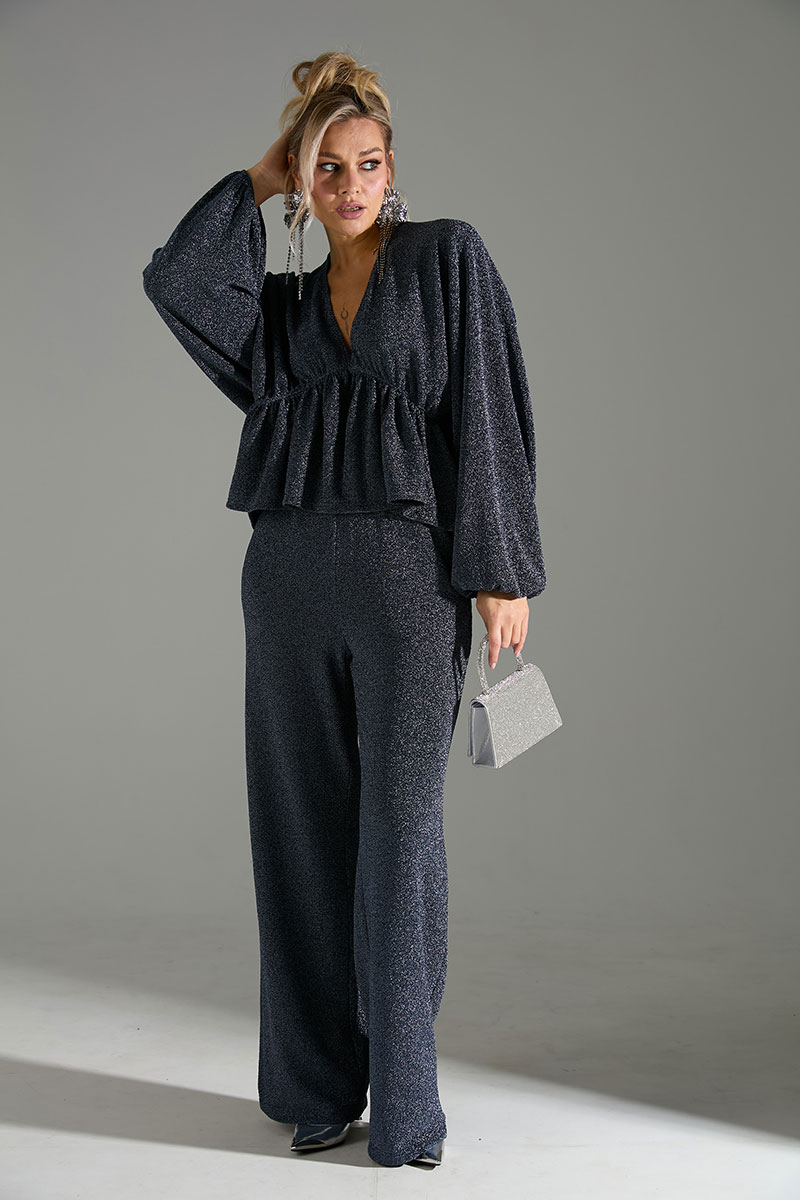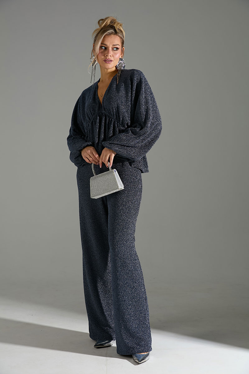 Костюм 2ка, состоящий из блузки и брюк. Блузка свободного силуэта с V-образным вырезом горловины. Рукав блузки цельнокроеный, по низу собранный на резинку. По линии груди вставлена эластичная резинка. Брюки прямого силуэта с резинкой по талии.
