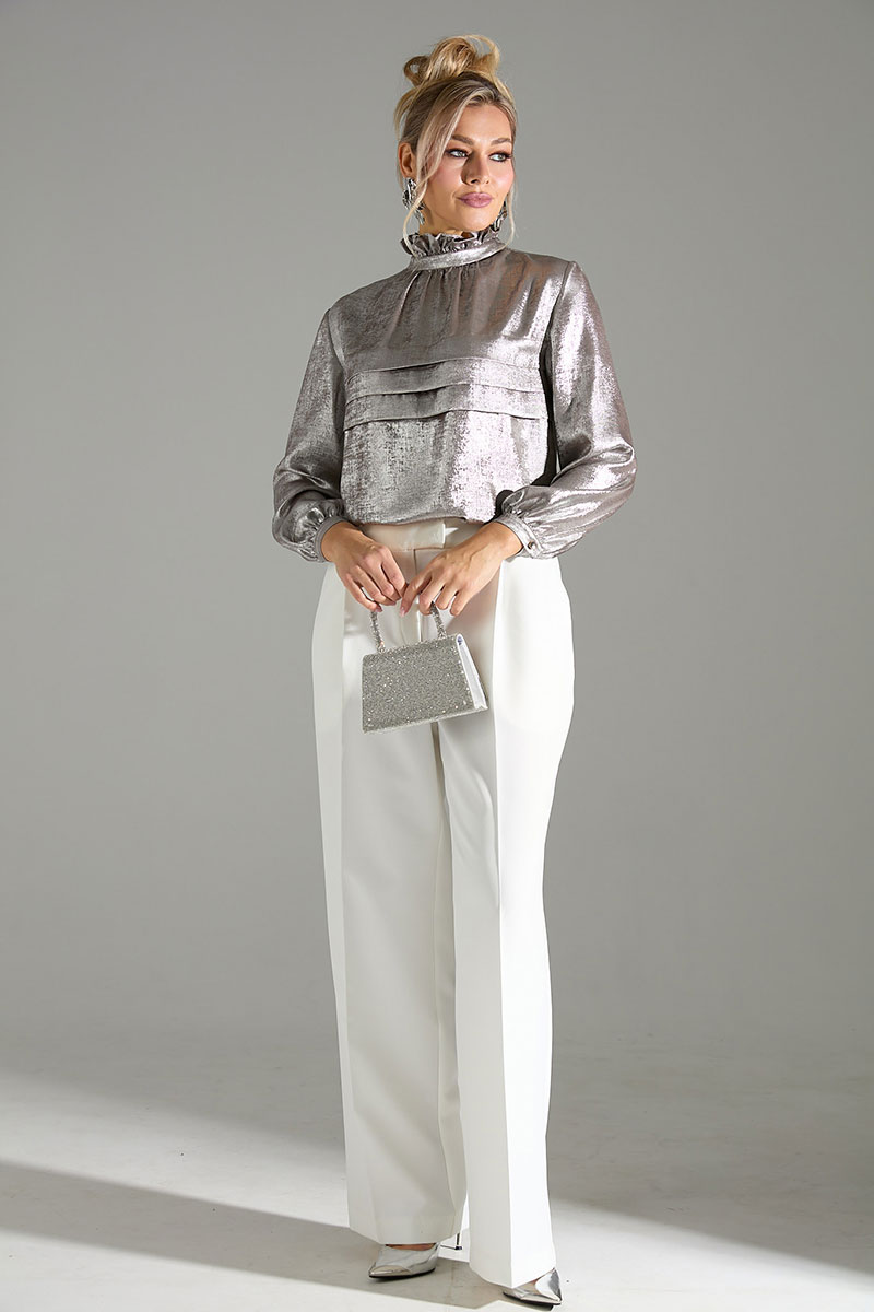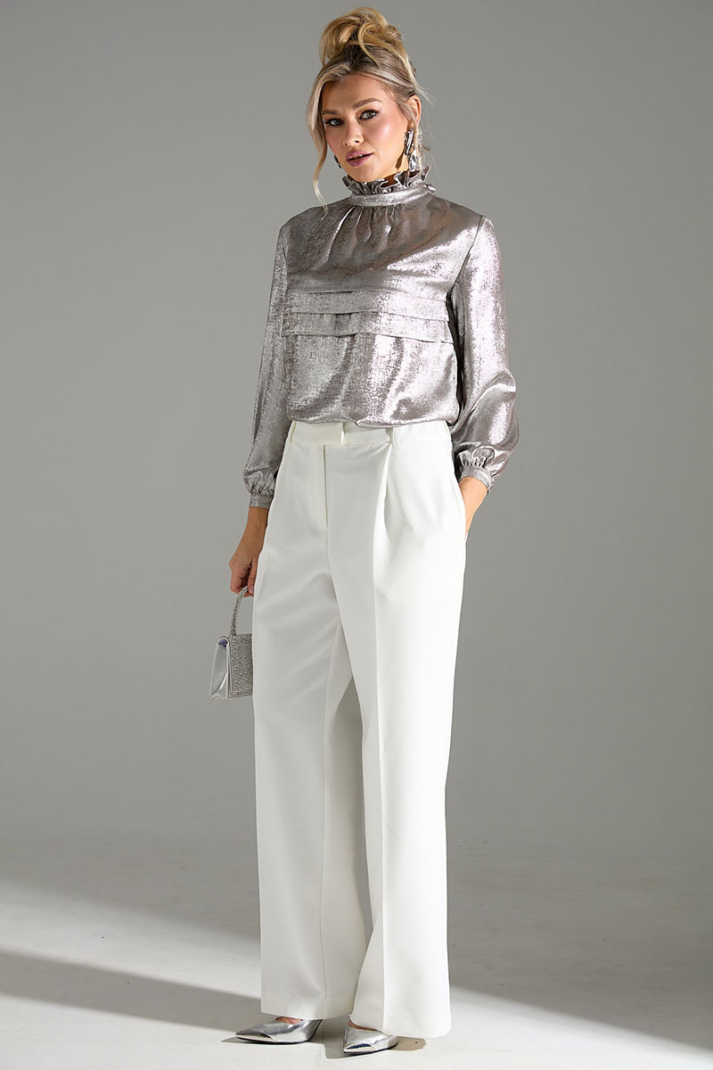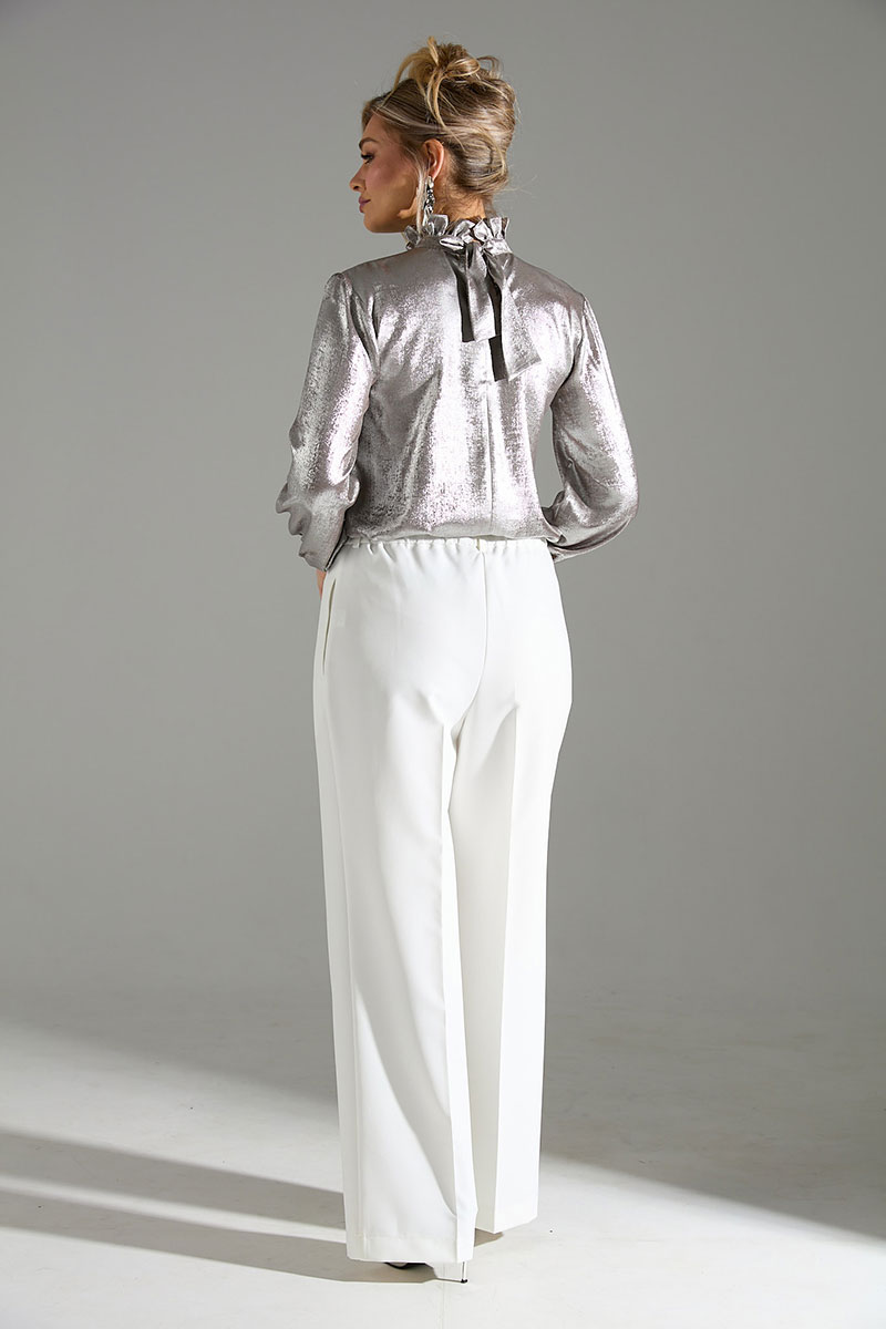 Комплект 2-ка, состоящий из блузы и брюк. Элегантная блуза из легкой ткани свободного силуэта. По переду блузки добавлен оригинальный элемент в виде складок.Отделка горловины рюшами и красивым бантом по спинке делает блузку отличным вариантом для нарядного и романтичного образа! Рукава блузки объёмные, на манжетах выполнена застежка на пуговицу. Брюки широкого объема, прямого силуэта. На передних половинках брюк заутюжены стрелки, переходящие в складки по линии талии. На задних половинках также заутюжены стрелки. В боковых швах расположены карманы. Застежка-гульфик. Пояс отрезной, притачной. В задней части пояса вставлена эластичная тесьма (резинка). На пояс настрочены шлевки. Выступающая часть пояса застегивается на петлю и крючок.