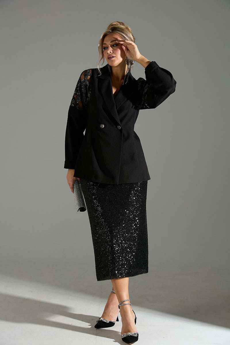 Комплект 2ка, состоящий из жакета и юбки. Двубортный жакет полуприлегающего силуэта с застёжкой на две пуговицы без карманов. Рукава жакета объёмные, заканчиваются манжетой с застёжкой на пуговицу. В качестве декора в районе плеча присутствуют вставки из кружевной ткани с пайетками. Юбка- карандаш длиной ниже колена прямого силуэта. Пояс юбки и подкладка выполнены из эластичного трикотажа. Верхний слой юбки из лёгкой ткани расшитой пайетками. Застёжка на потайную молнию в среднем шве по спинке, разрез расположен внизу среднего шва.