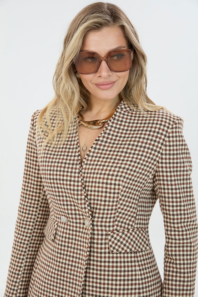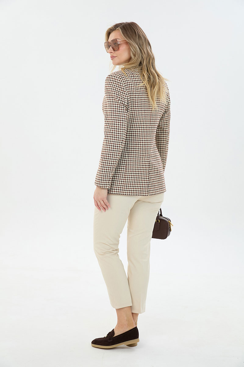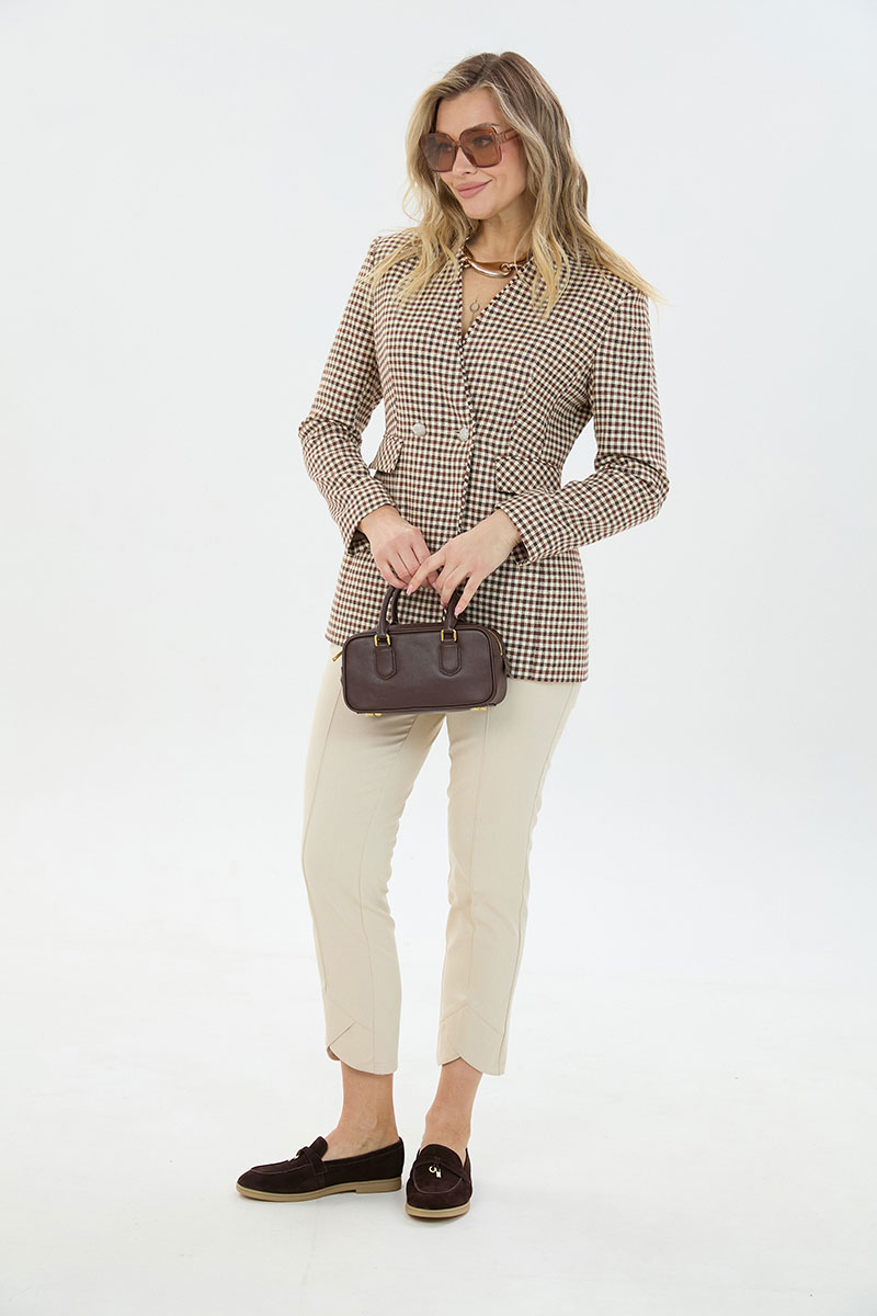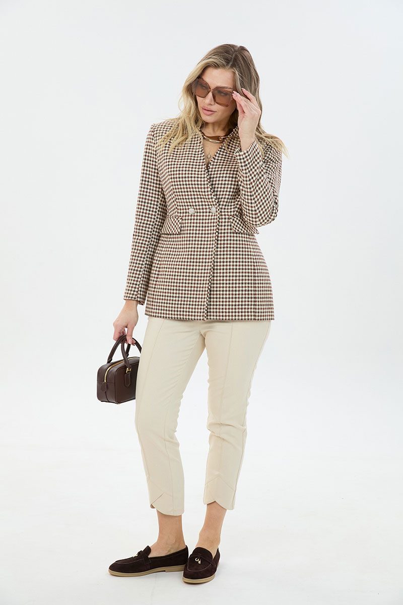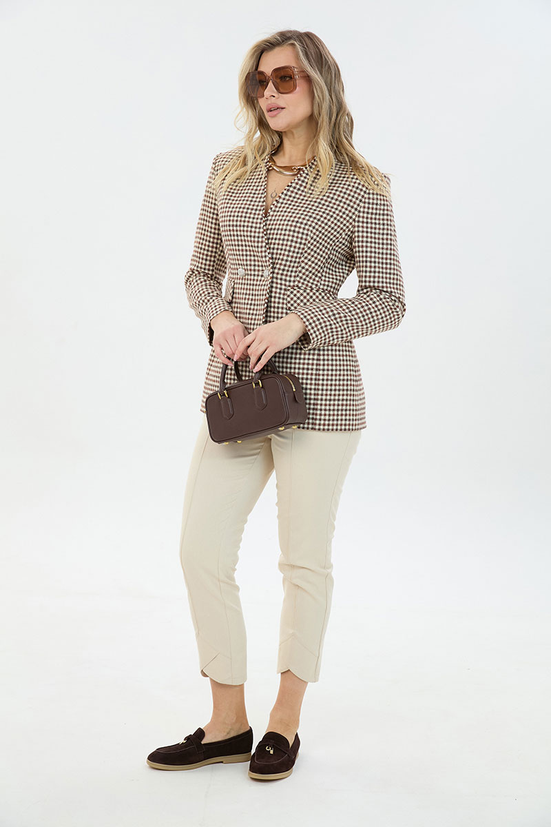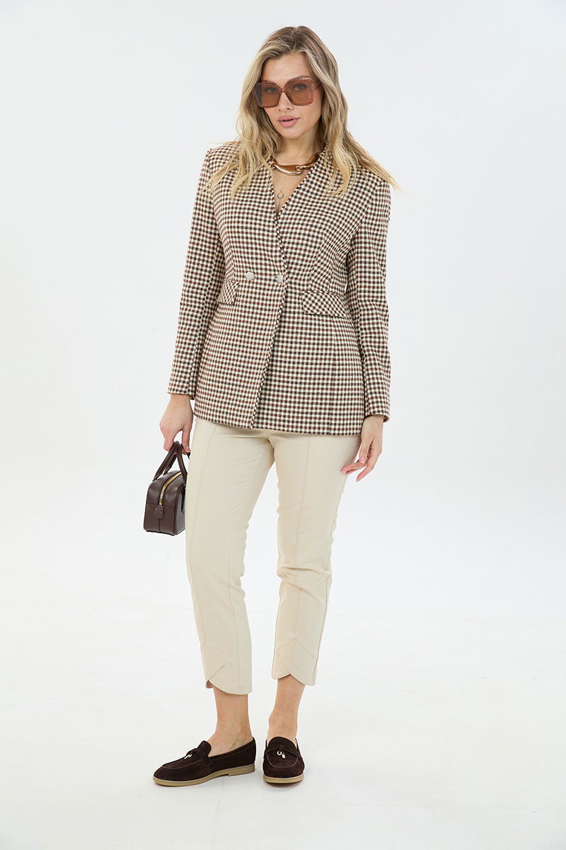 Двубортный жакет полуприлегающего силуэта с застёжкой на две пуговицы. Нагрудные вытачки на полочках расположены вертикально и совмещены с талиевыми, заканчиваются входом в карман. Карманы прорезные, в рамку с клапаном. Спинка имеет плечевые вытачки, средний шов со шлицей. Воротник – стойка переходит в край борта, имеющий V-образную форму. Застежка на прорезные петли и пуговицы. Жакет полностью обработан притачной подкладкой. Брюки зауженные к низу, длинной 7/8. Пояс брюк на эластичной тесьме с кулиской и декоративными шнурами-завязками. Вход в карман фигурный, наклонный к боковому шву. Низ брючин по переду имеет фигурный подрез.