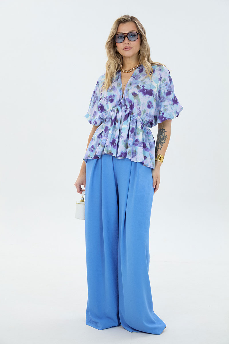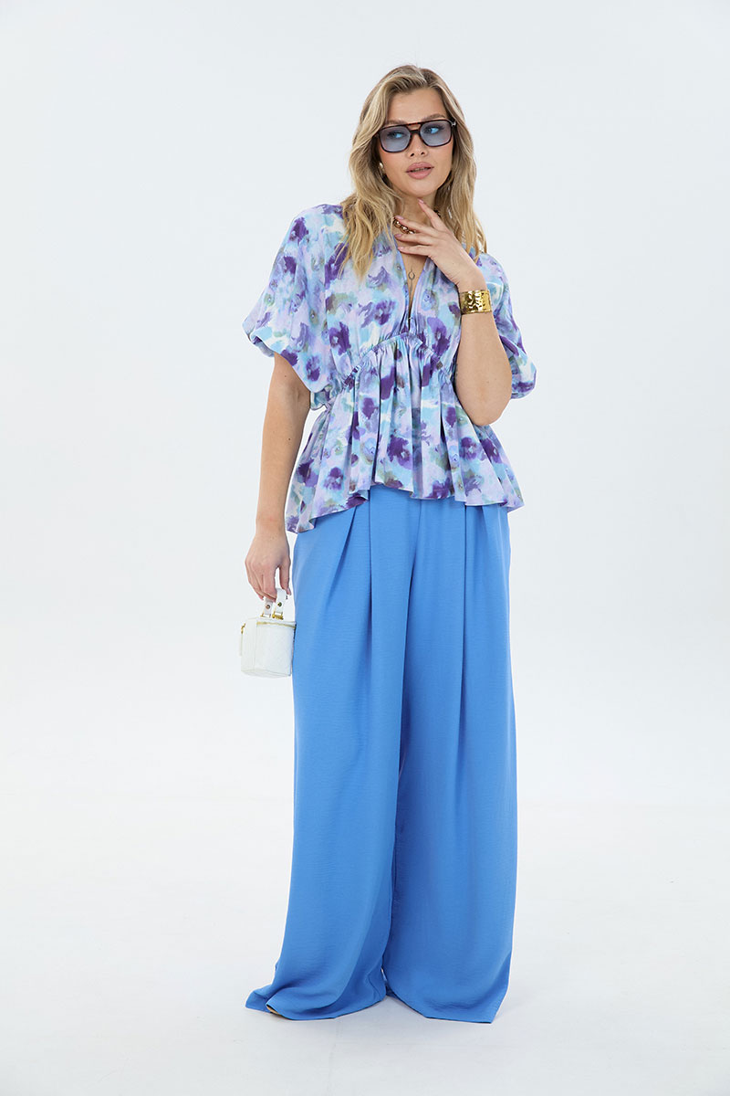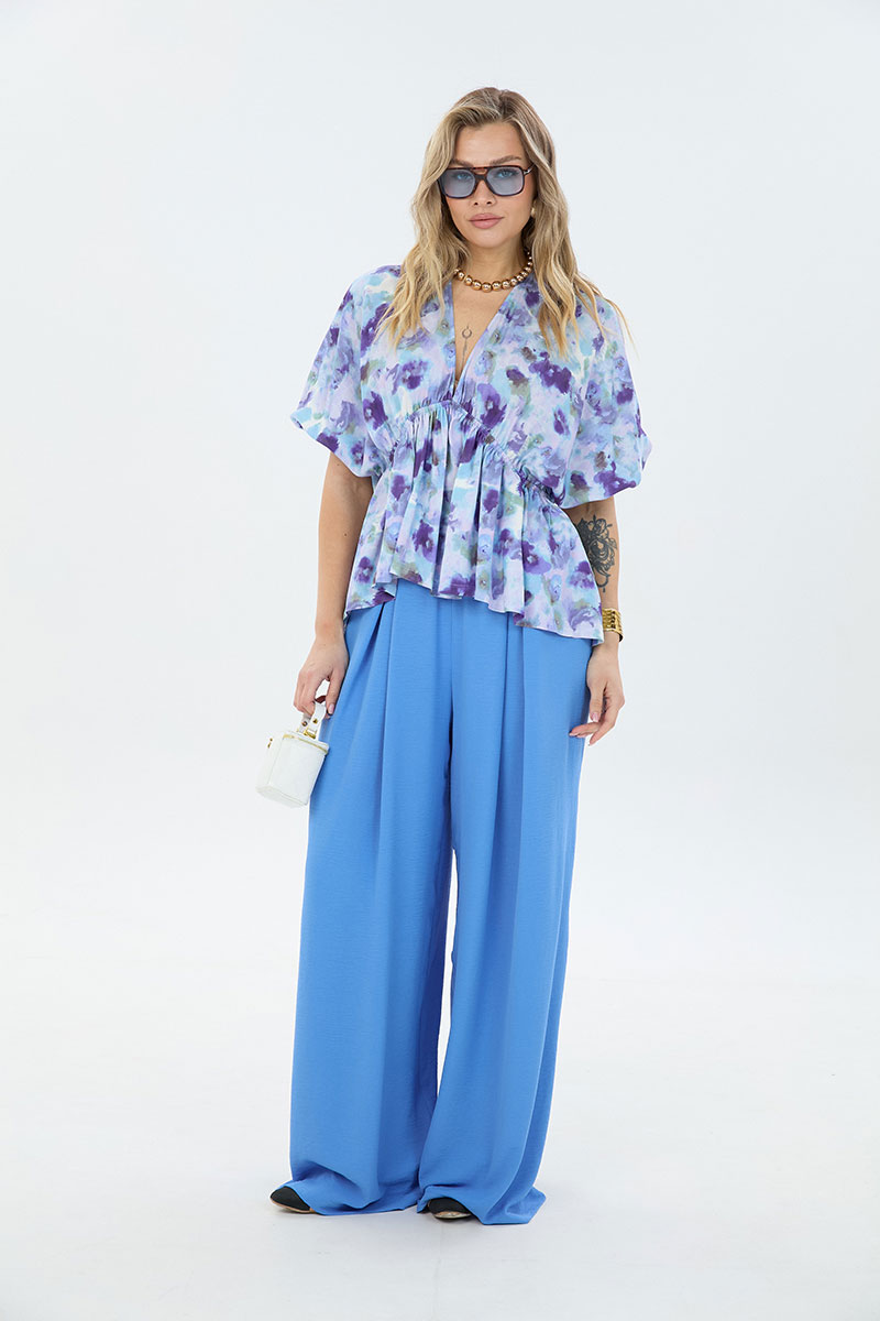 Комплект 2-ка, состоящий из лёгкой туники и брюк. Туника свободного силуэта с V-образным вырезом горловины. Рукав блузки цельнокроеный. Ниже линии груди вставлена эластичная резинка. Брюки широкого объема. По центру переда заложены две широкие встречные складки на каждой половинке. В боковых швах расположены карманы с наклонным входом. Пояс на резинке.