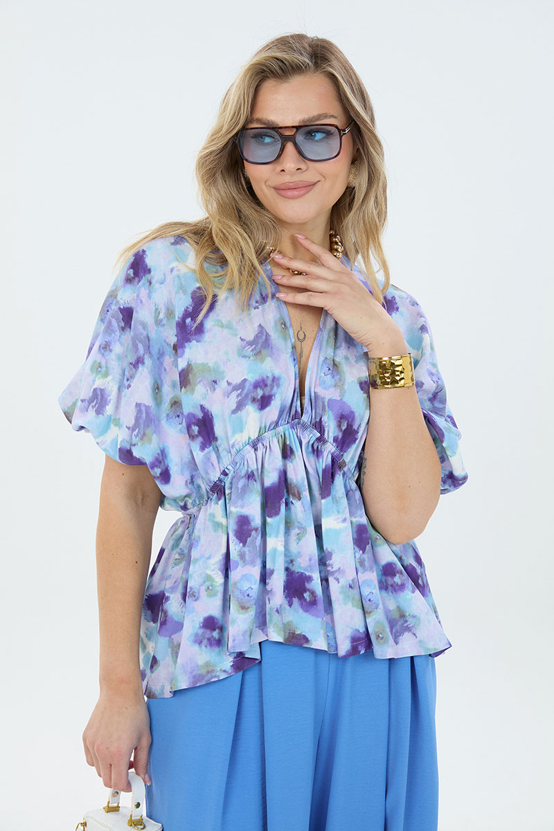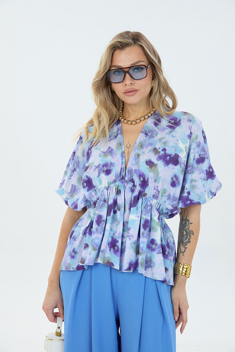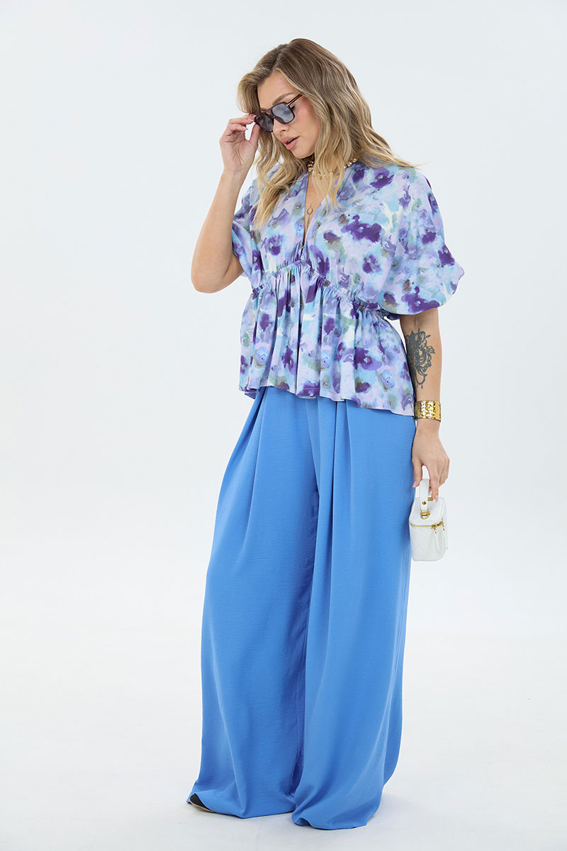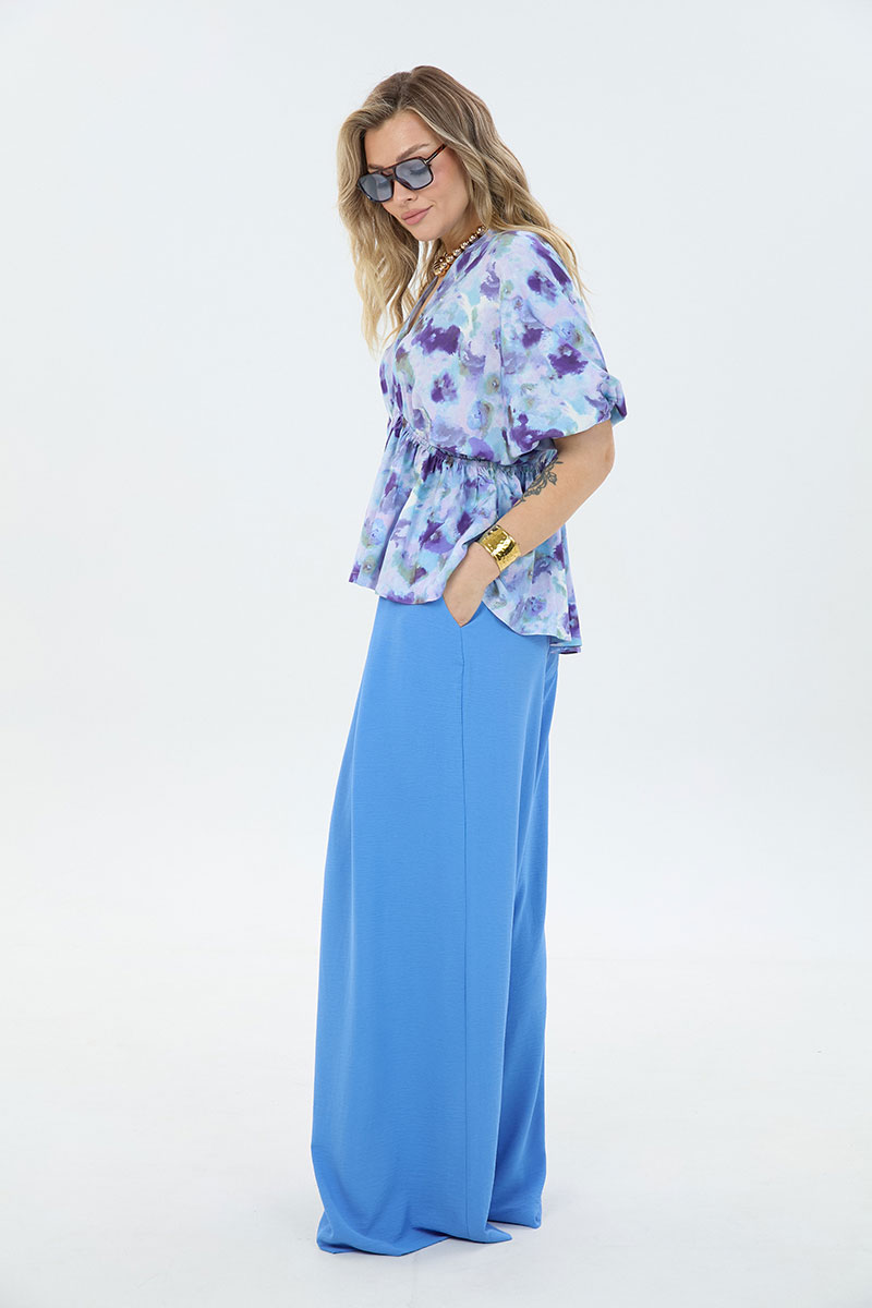 Комплект 2-ка, состоящий из лёгкой туники и брюк. Туника свободного силуэта с V-образным вырезом горловины. Рукав блузки цельнокроеный. Ниже линии груди вставлена эластичная резинка. Брюки широкого объема. По центру переда заложены две широкие встречные складки на каждой половинке. В боковых швах расположены карманы с наклонным входом. Пояс на резинке.