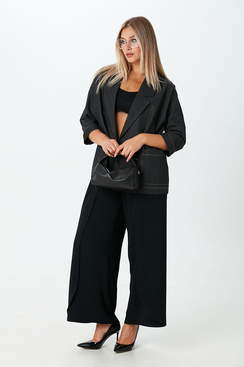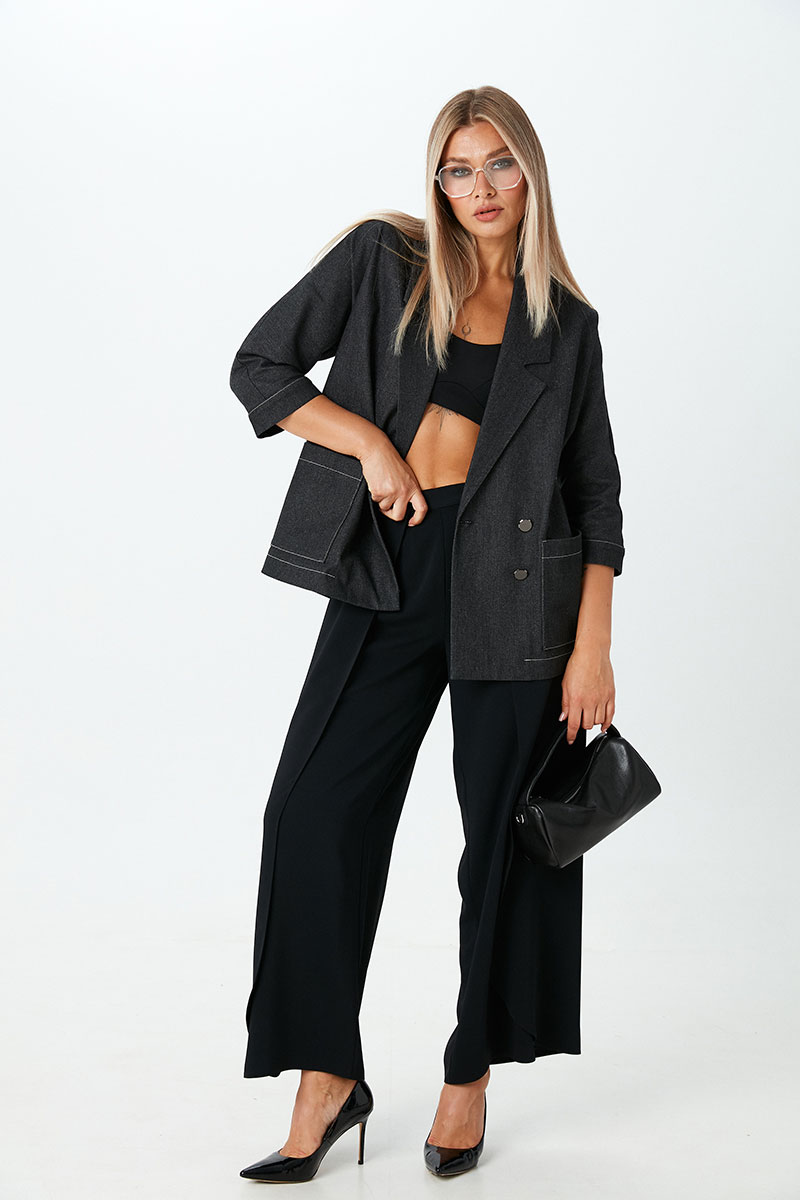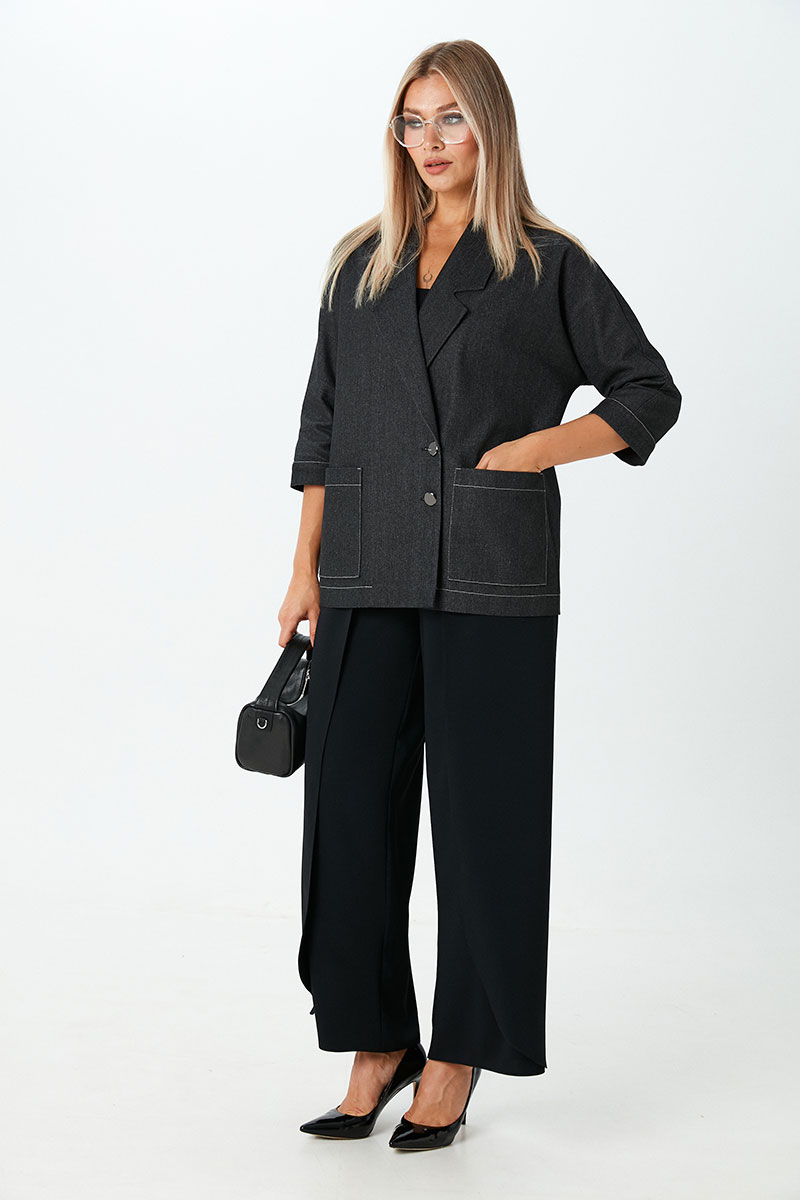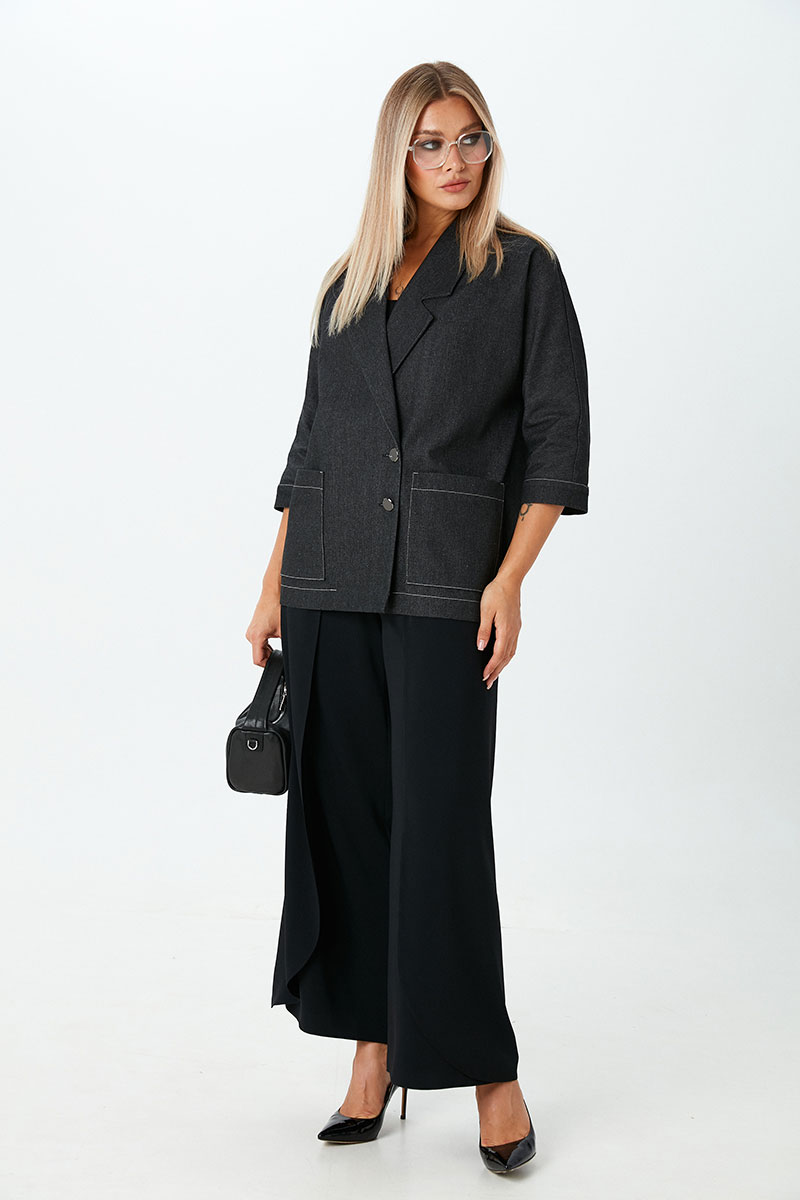 Жакет большого объёма с двубортной застежкой по одной стороне на петли и пуговицы. Рукава 3/4 с манжетами. Жакет без подкладки. По переду расположены накладные карманы.