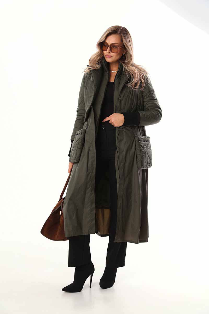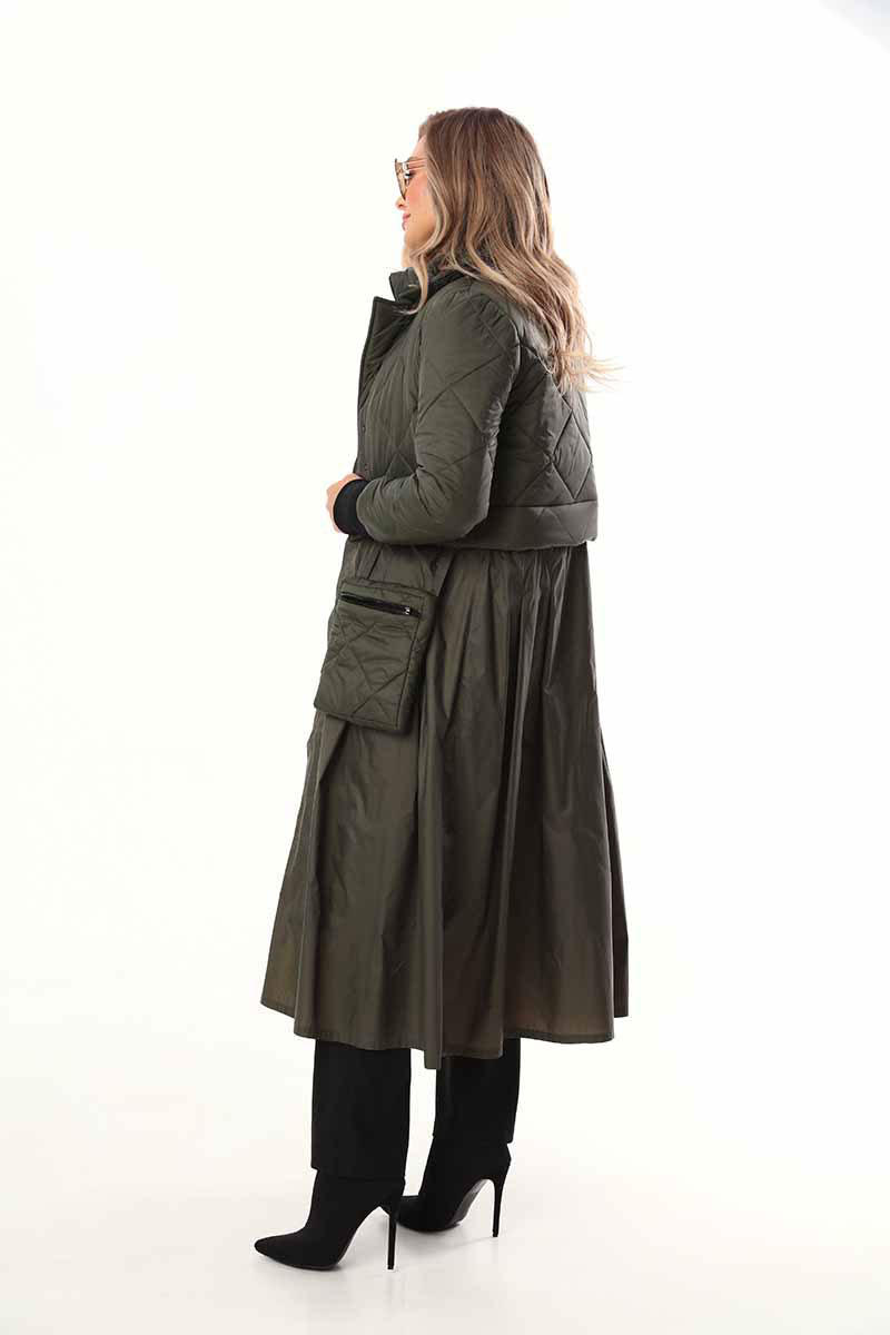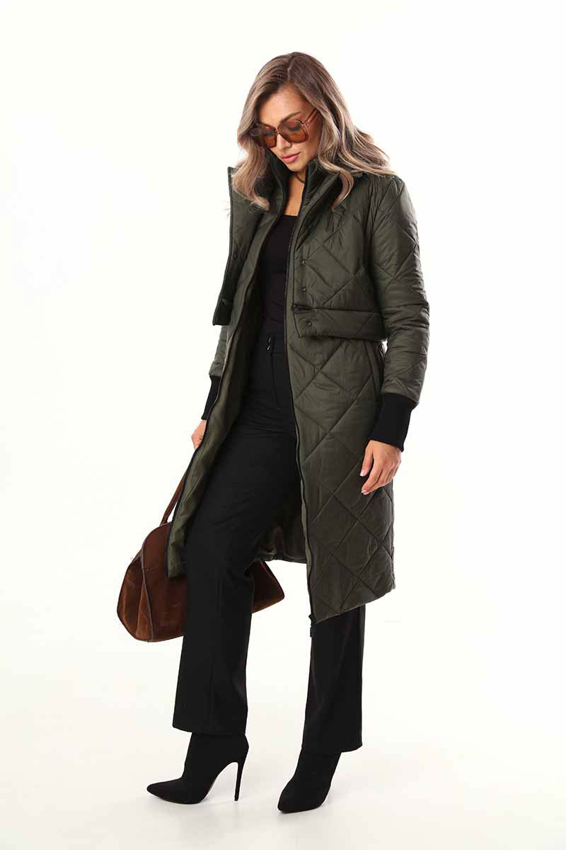 Верхний слой комплекта составляет укороченная куртка с застёжкой на кнопки в сочетании с объёмной юбкой длины миди из тонкой плащевой ткани. Юбка съёмная, пристёгивается к куртке на молнию, что позволяет носить куртку как отдельный элемент одежды. Куртка также дополнена съёмными карманами-сумочками с застёжкой на молнию. Нижний слой состоит из удлинённого жилета на молнии с карманами и воротником-стойкой.