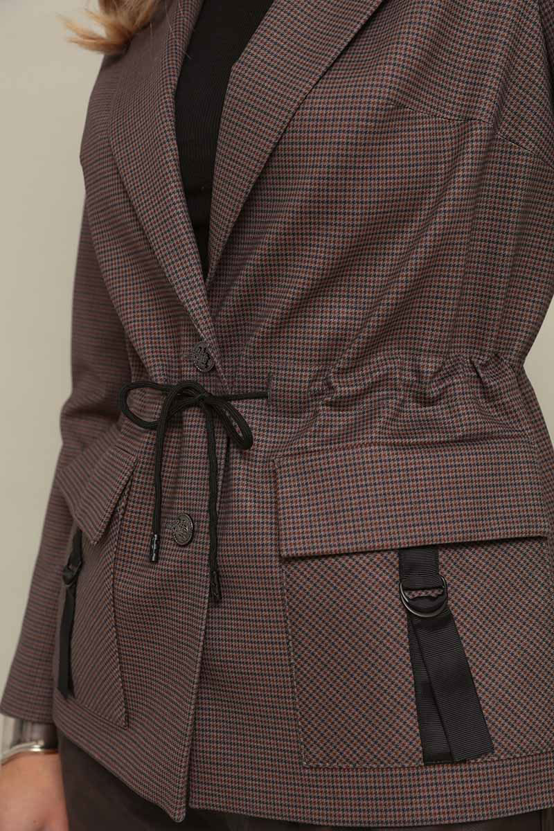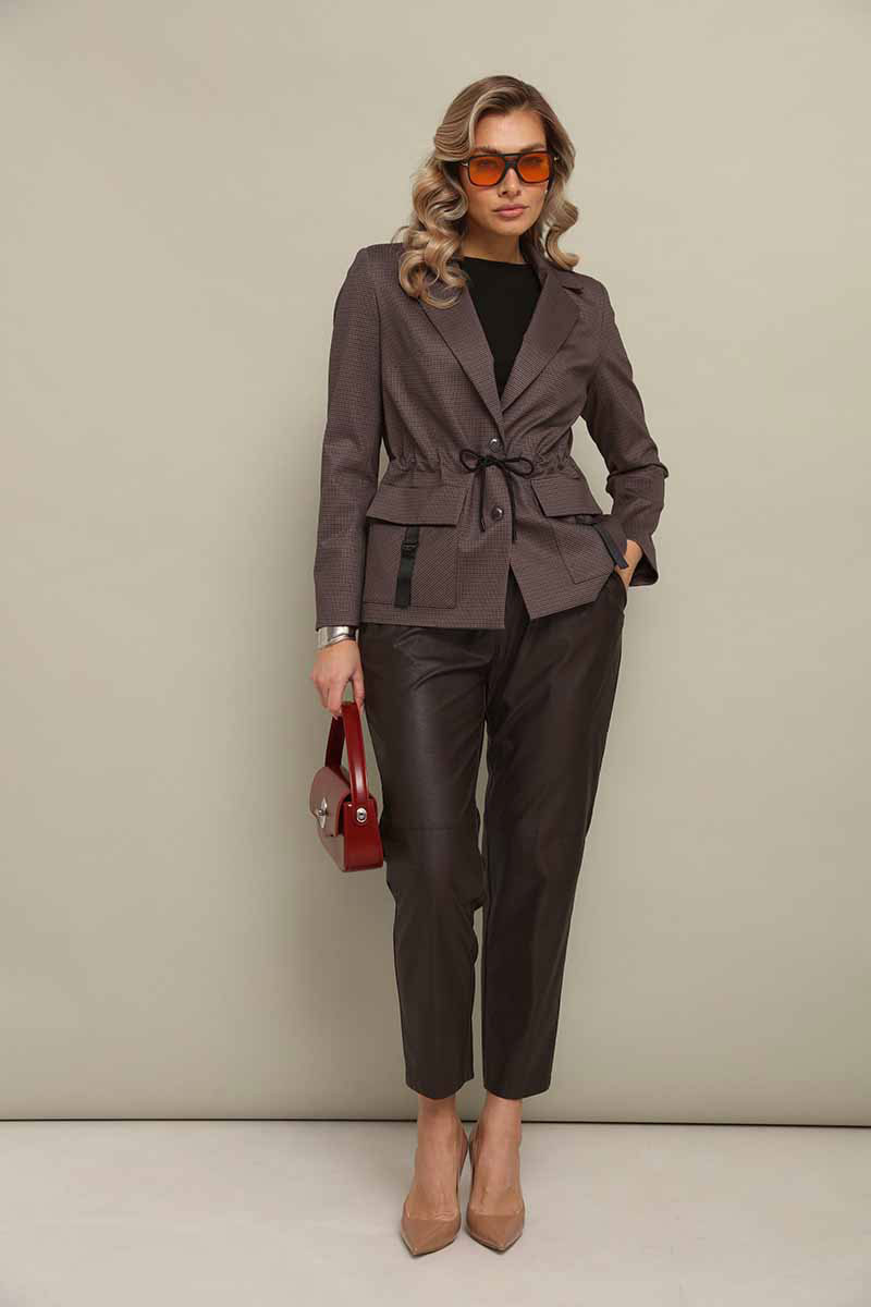 Однобортный жакет на подкладке прямого силуэта с застёжкой на две петли и пуговицы. По талии расположена кулиса и шнурок для приталивания жакета. По переду расположены накладные карманы с клапаном и декором.