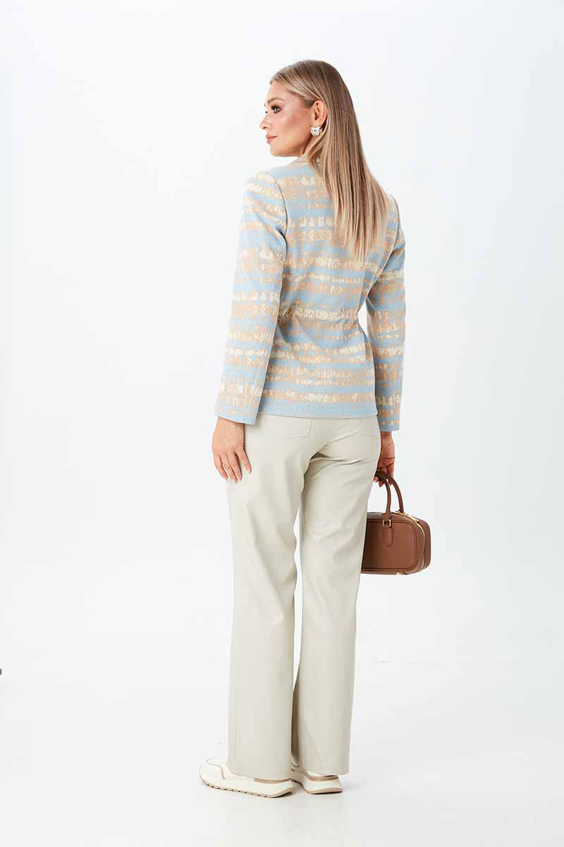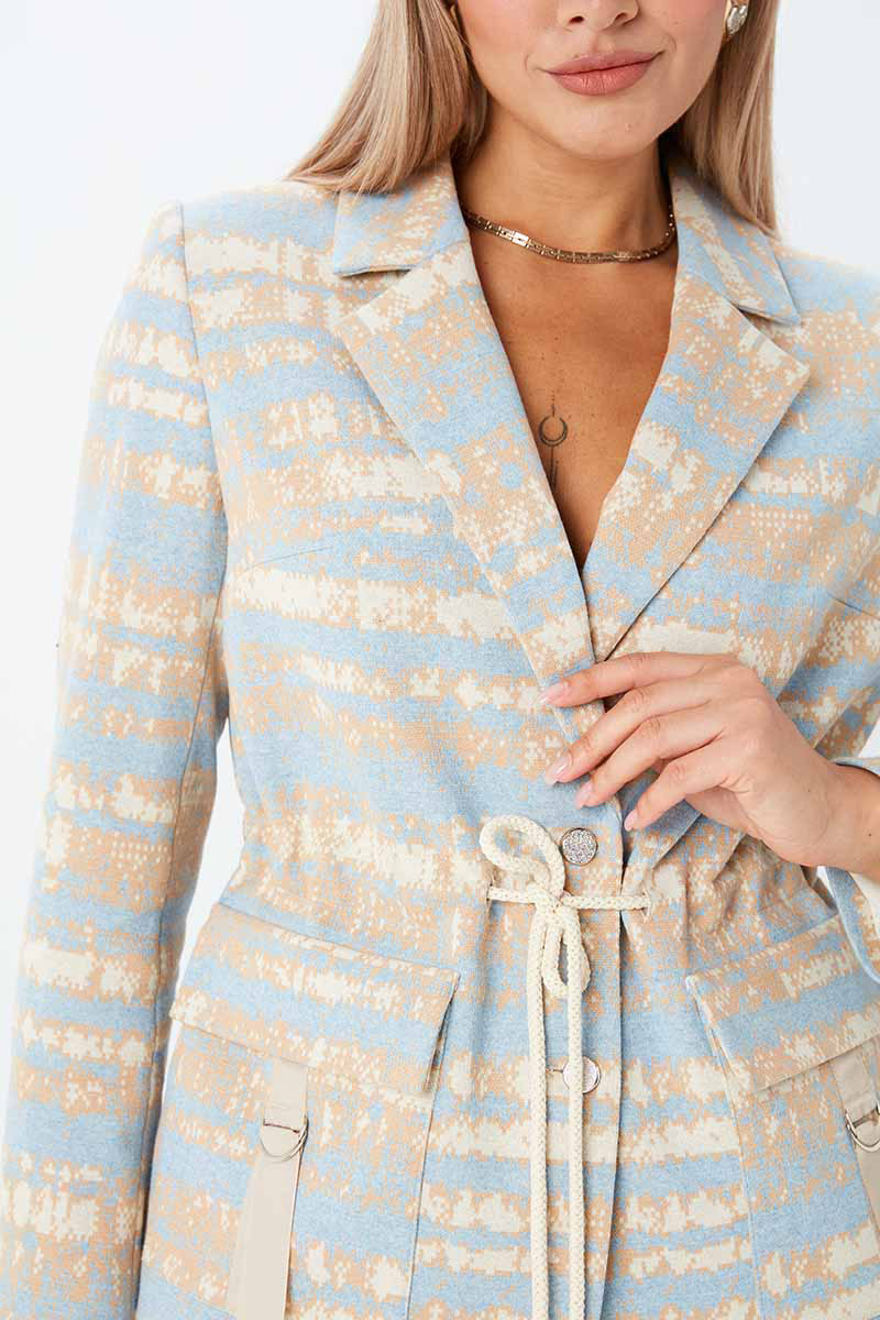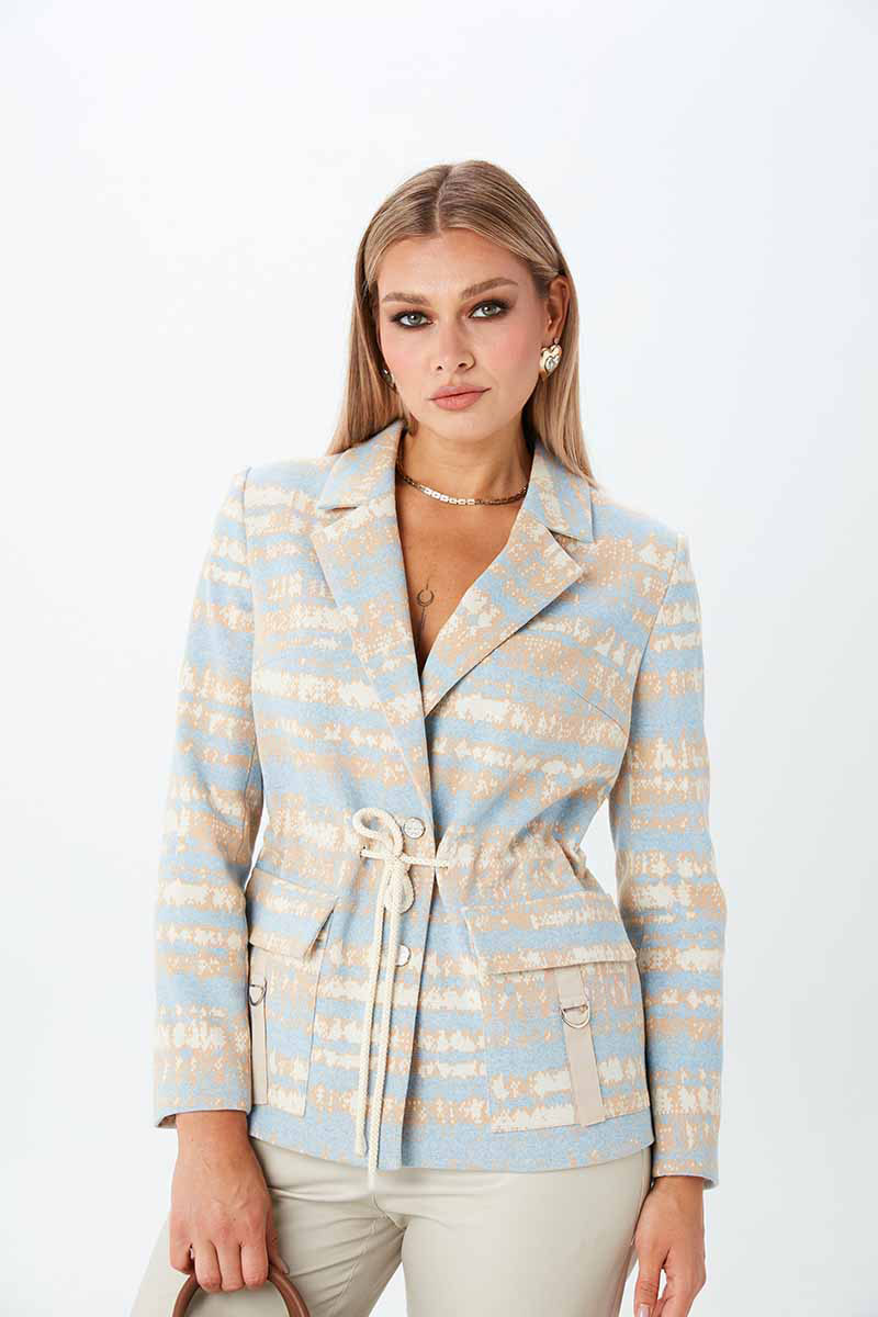 Однобортный жакет на подкладке прямого силуэта с застёжкой на две петли и пуговицы. По талии расположена кулиса и шнурок для приталивания жакета. По переду расположены накладные карманы с клапаном и декором.