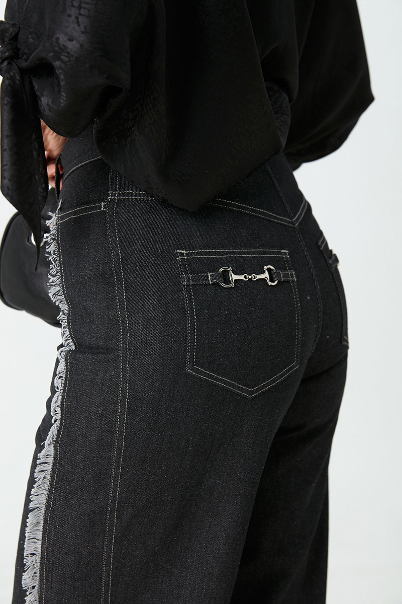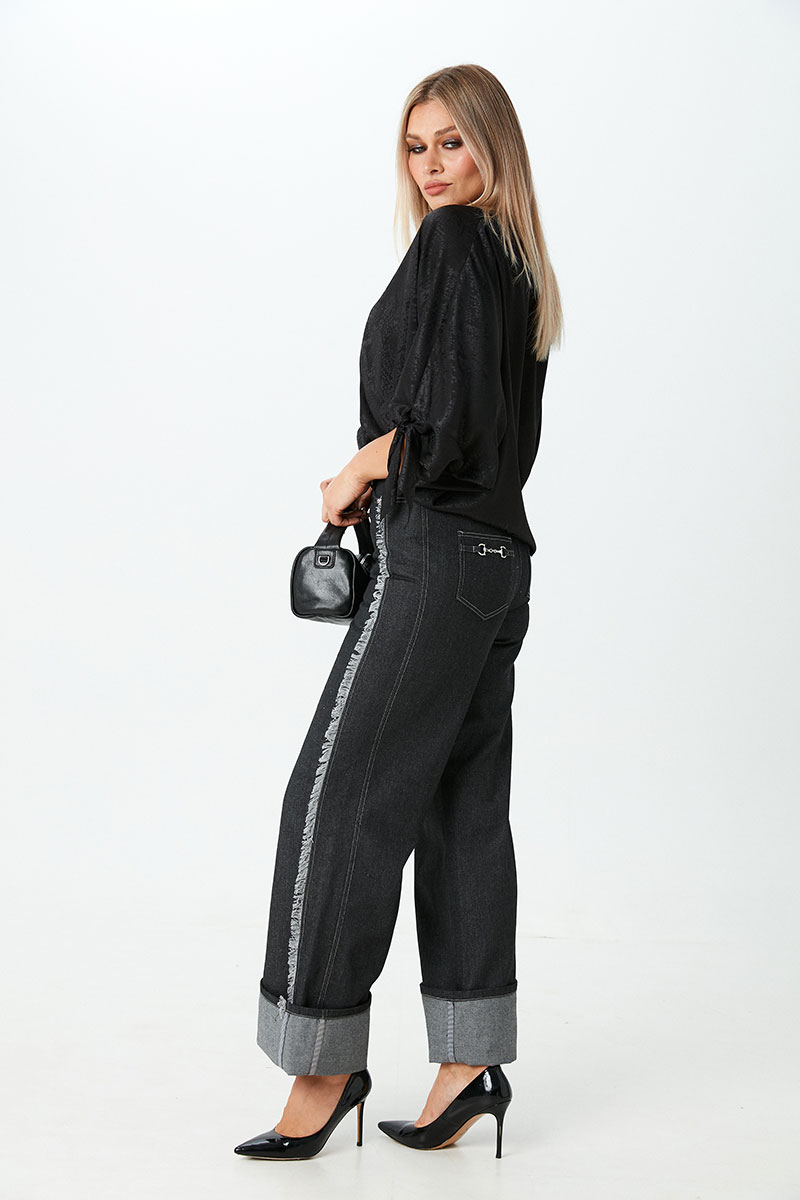 Комфортные плотные брюки из джинсовой ткани свободнго объёма от бедра с подворотами по низу, которые позволяют регулировать длину брюк.