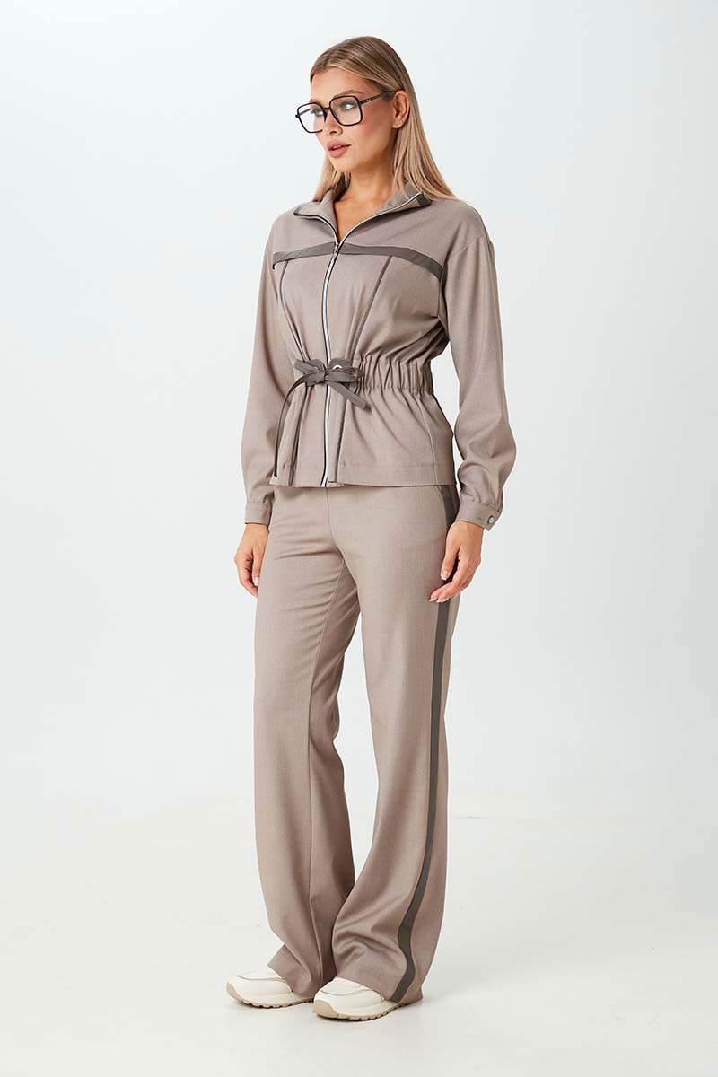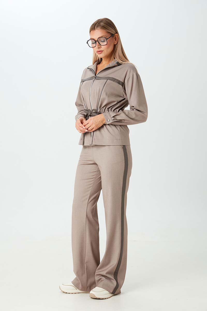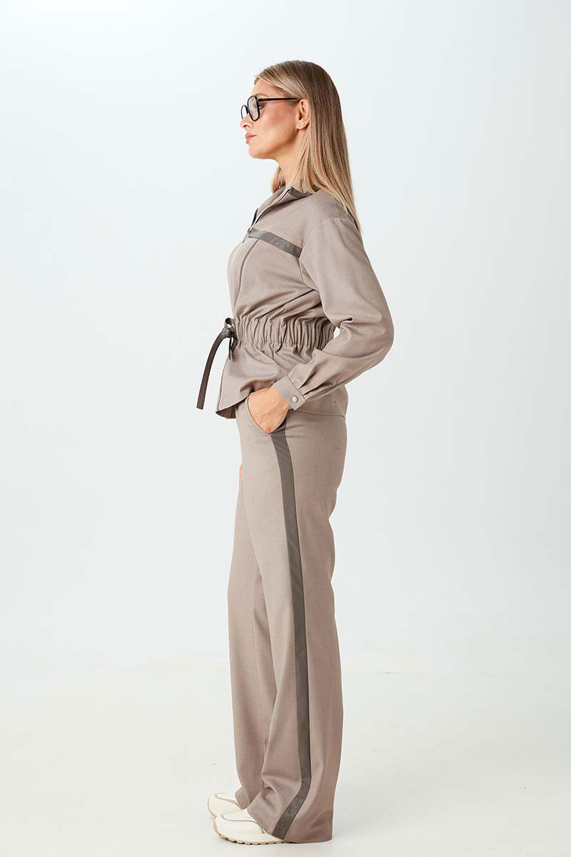 Брюки прямого силуэта на эластичной резинке по талии. По переду расположены карманы с наклонным входом. По бокам лампасы из отделочной кожи.