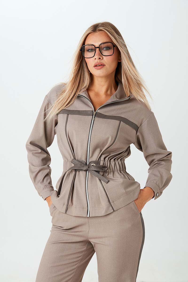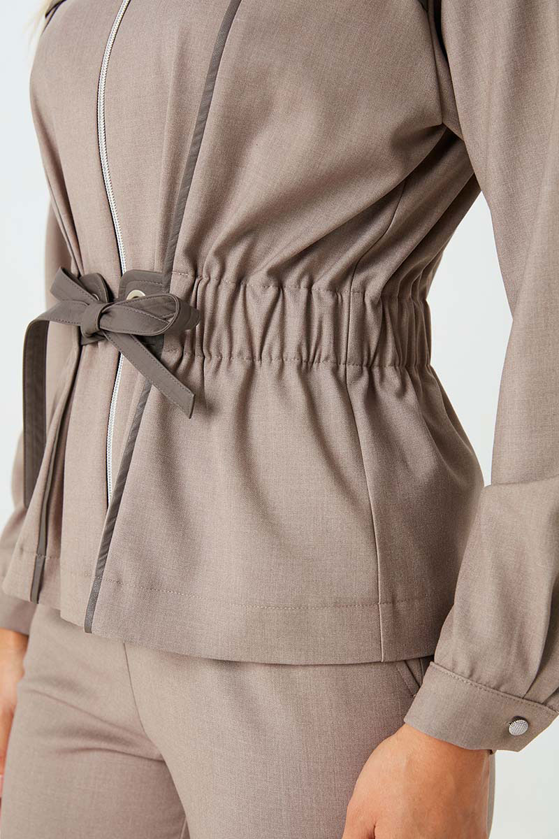 Рубашка с застёжкой на молнию и воротником - стойкой. По талии рубашки расположена резинка и люверсы для декоративной отделочной тесьмы из кожи. Декоративные элементы по переду рубашки выполнены из искусственной кожи. Манжеты на пуговицах.