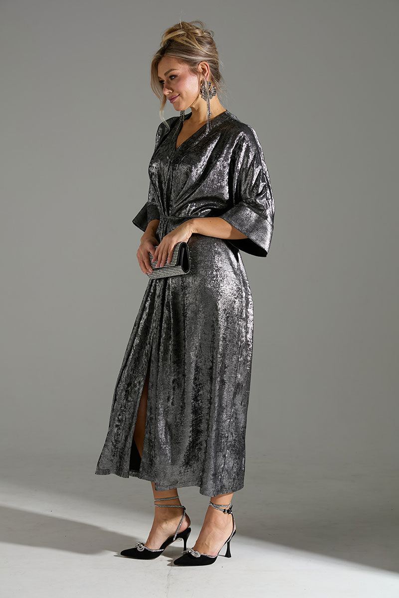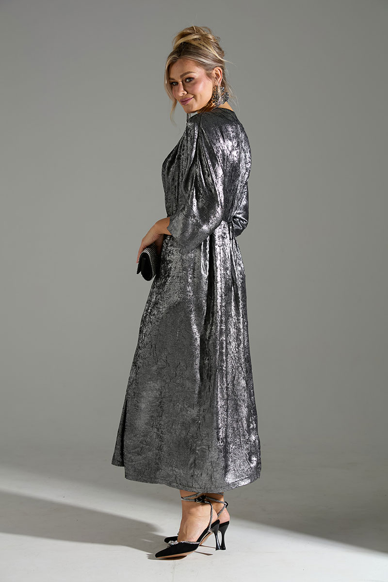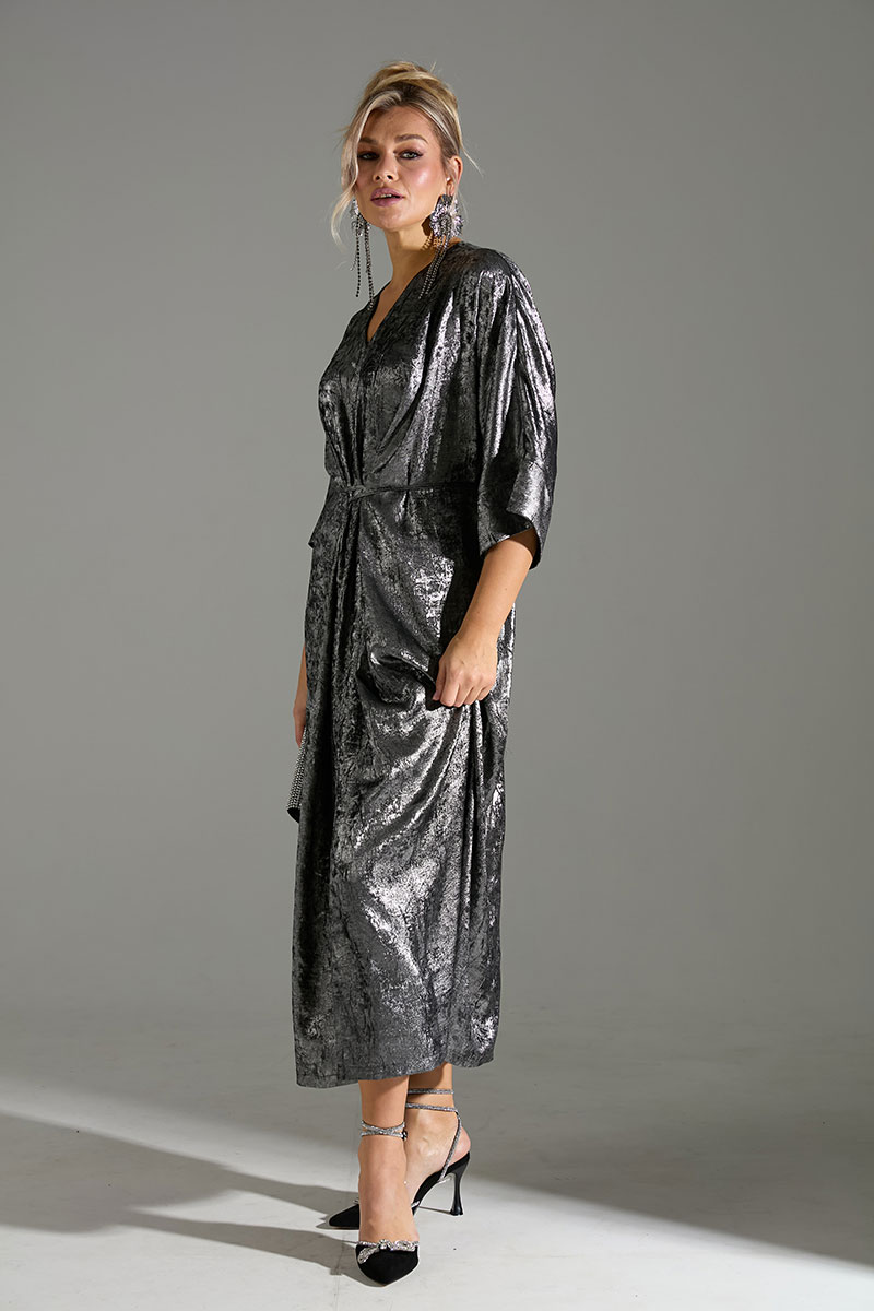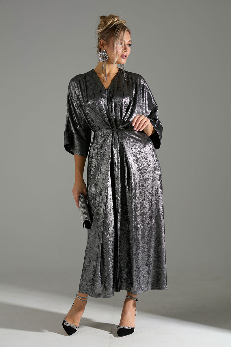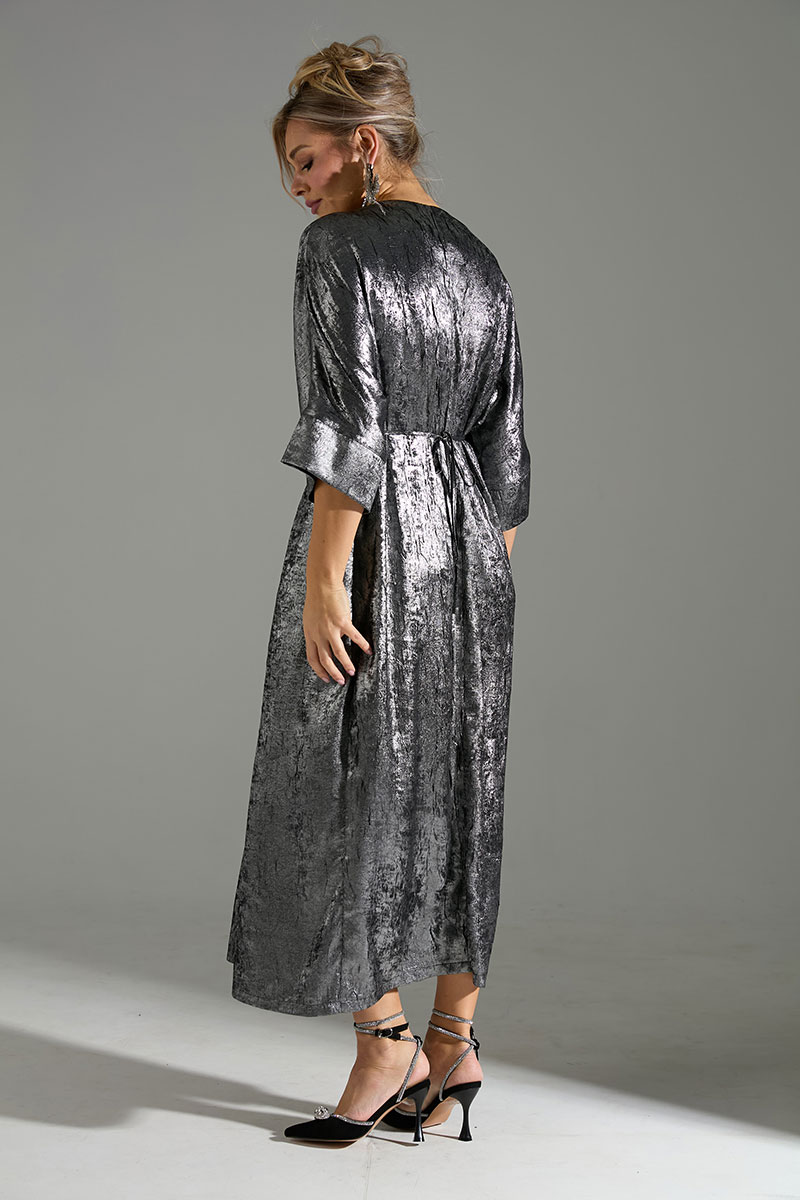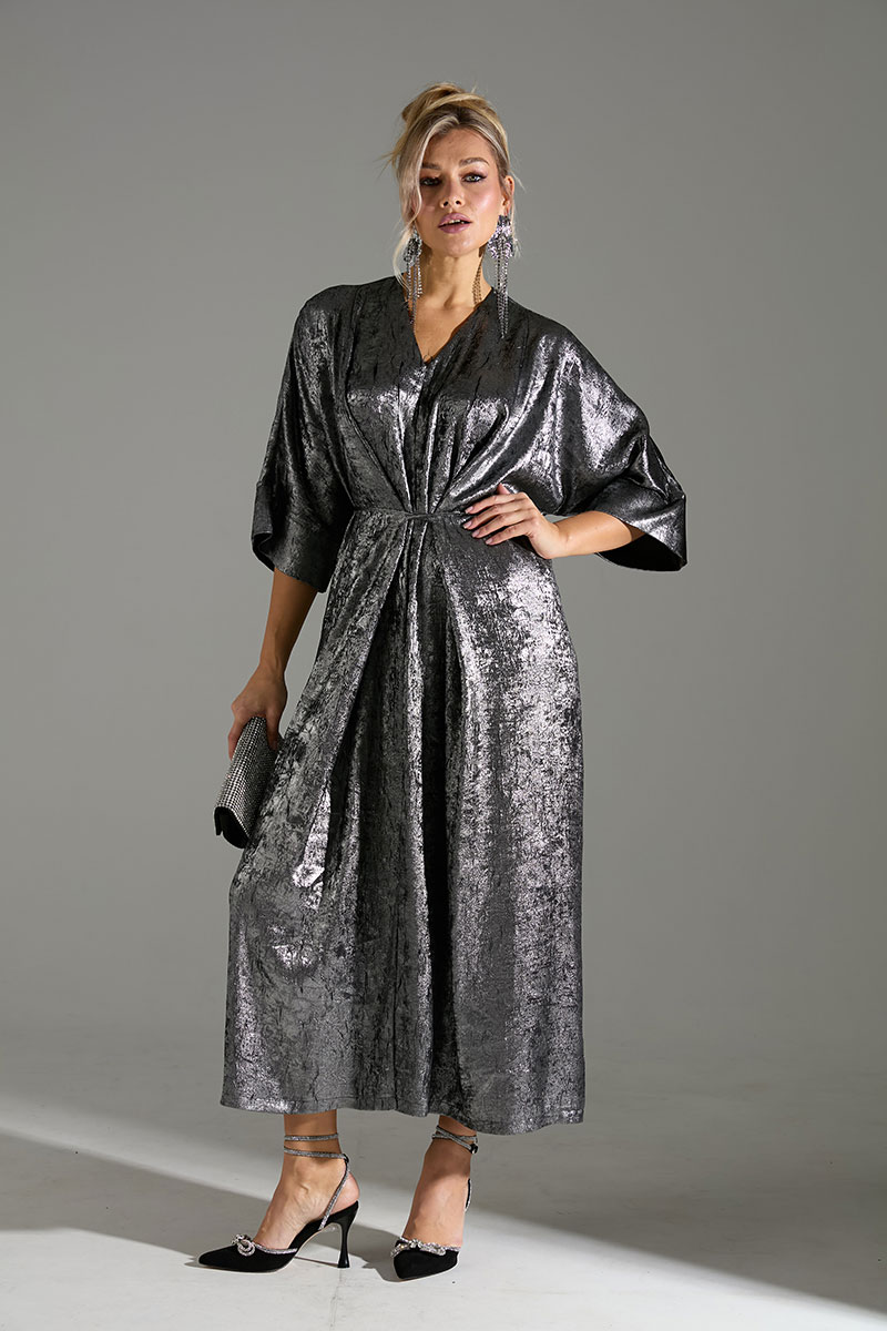 Платье большого объёма с цельнокроеными рукавами. По переду расположены 2 тесьмы из основной ткани, который завязываются на запах, что позволяет регулировать обхват талии.
