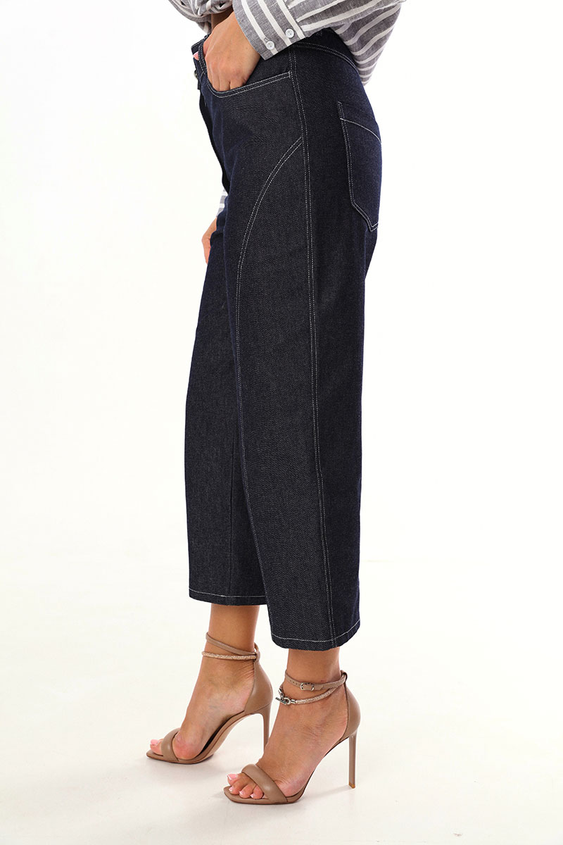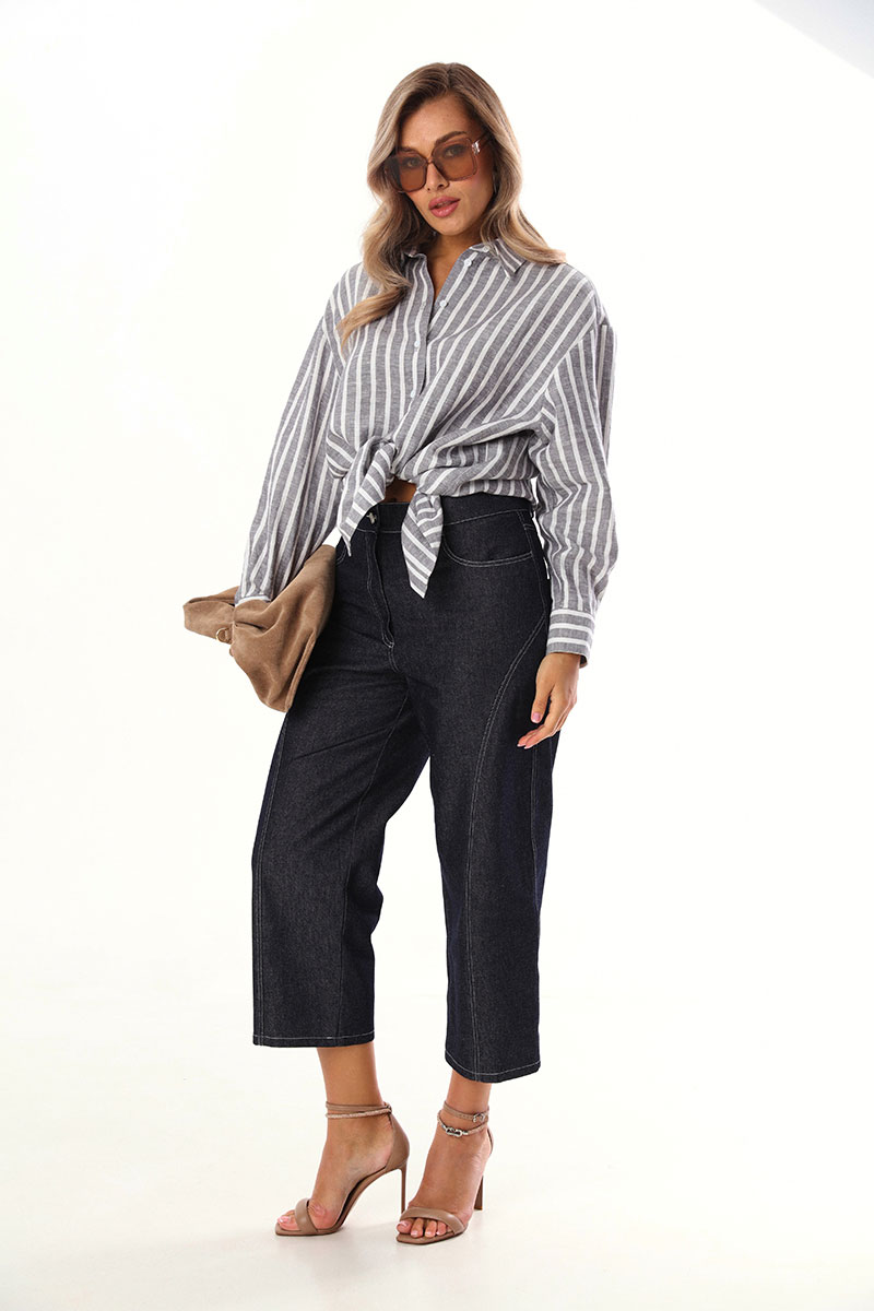 Брюки-капри, зауженные и укороченные к низу, выполнены из джинсовой ткани. По переду и сзади расположены карманы. Застежка на пуговицу и молнию.