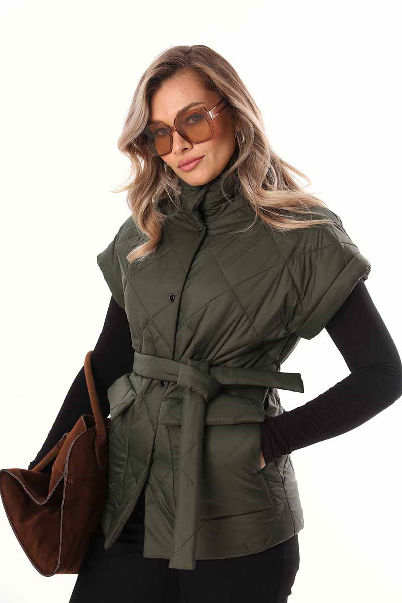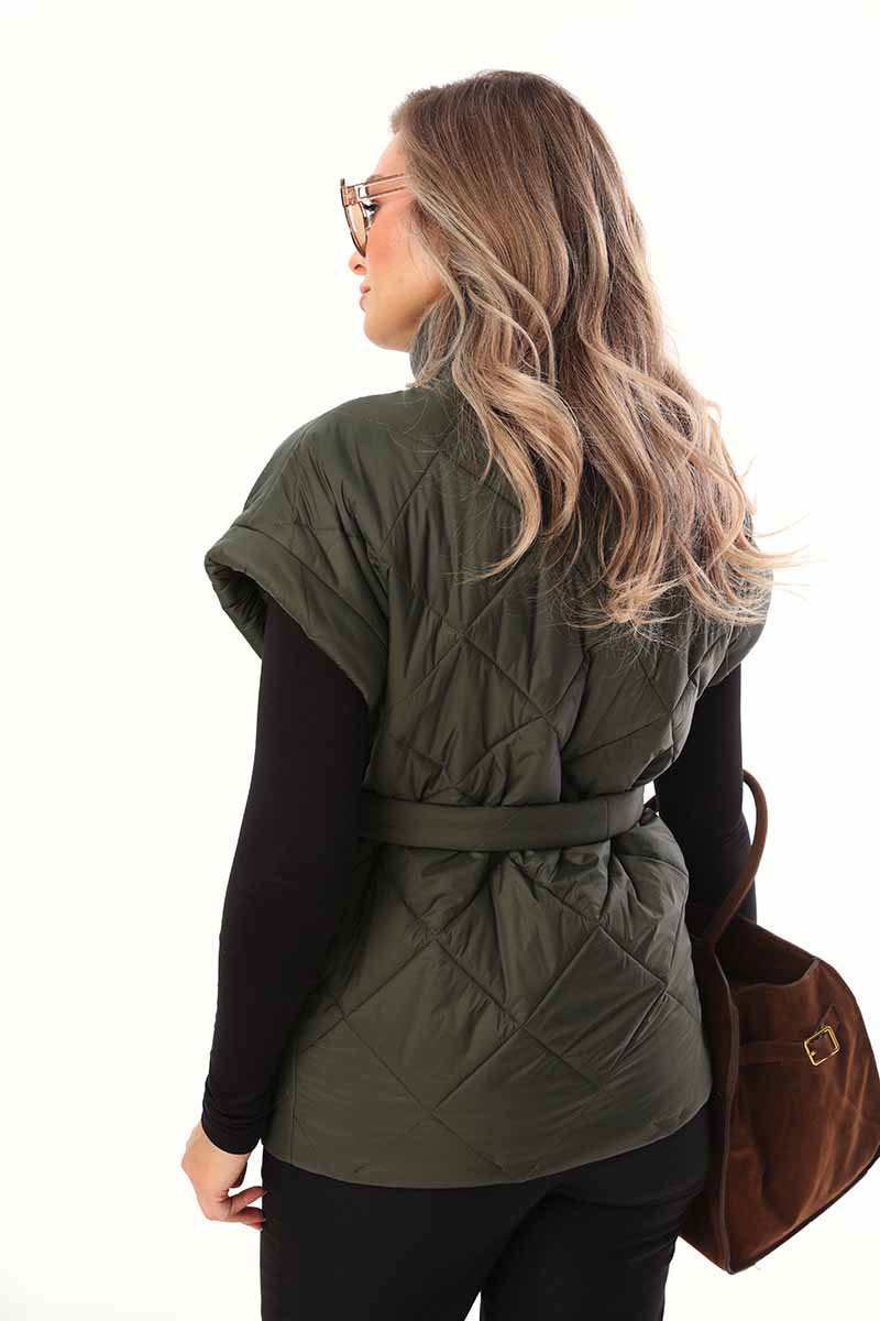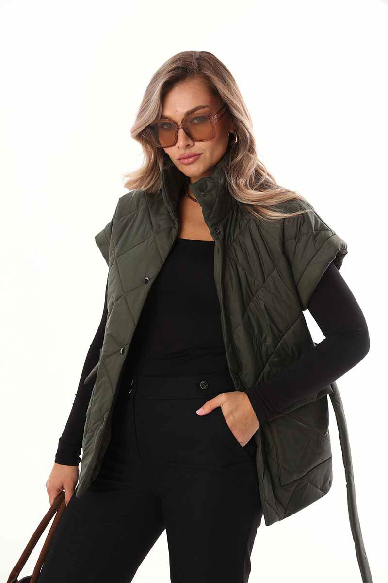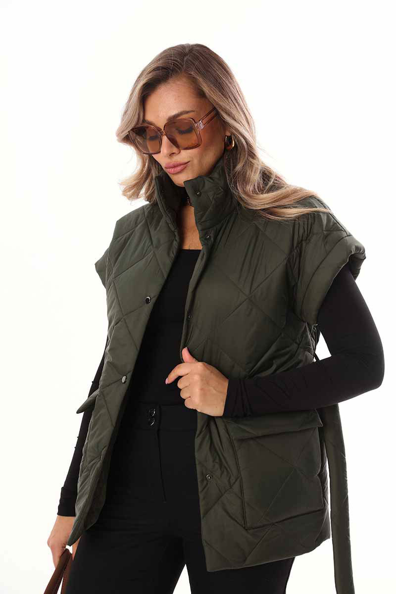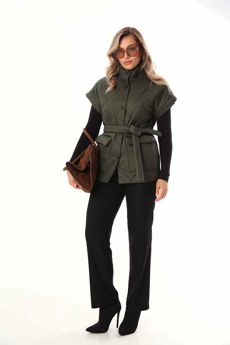 Жилет свободного силуэта из объемной стеганой ткани. Жилет на подкладке. Спущенная линия плеча, застёжка на кнопки. По переду широкие накладные карманы с клапаном с боковым входом для удобства. В комплекте идёт пояс из основной ткани.
