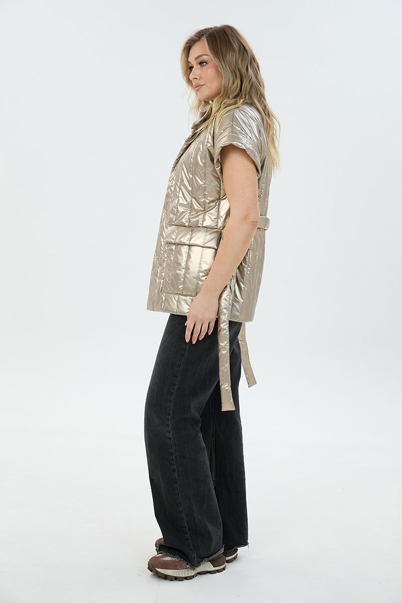 Жилет свободного силуэта из объемной стеганой ткани. Жилет на подкладке. Спущенная линия плеча, застёжка на кнопки. По переду широкие накладные карманы с клапаном с боковым входом для удобства. В комплекте идёт пояс из основной ткани.