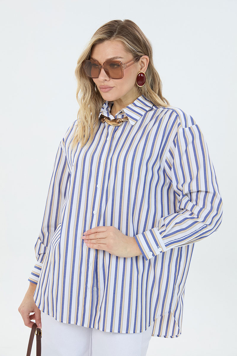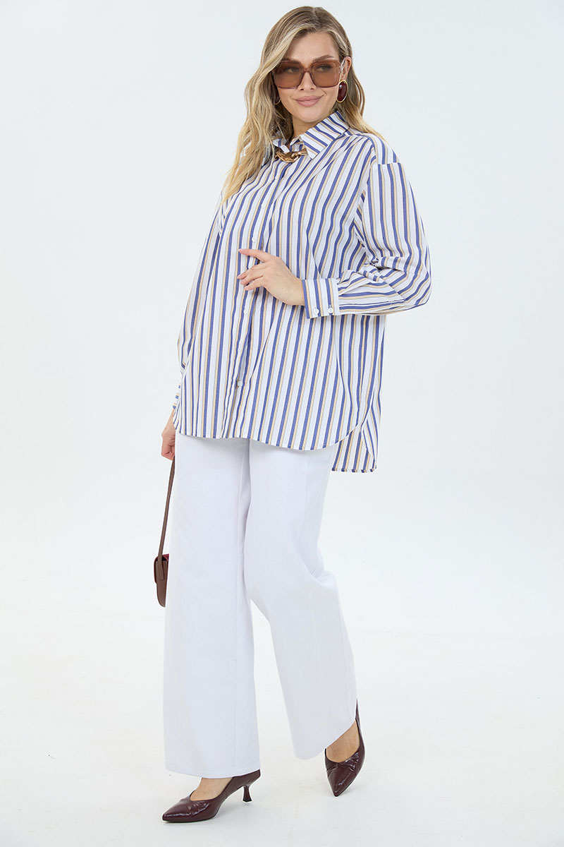 Рубашка женская большого объема, прямого силуэта. На детали спинки расположена двойная кокетка, переходящая на деталь полочки. Под кокеткой на спинке встречная складка. Воротник рубашечный отложной на стойке. Застежка планка центральная на прорезные петли и пуговицы. Линия плеча спущенная, рукав рубашечный, длинный. В нижней части рукава заложены складки, заканчивается манжетой с двумя прорезными петлями и пуговицами. Низ блузки разноуровневый: спереди короче, сзади длиннее.
