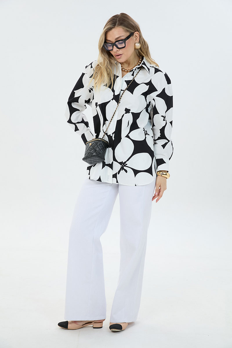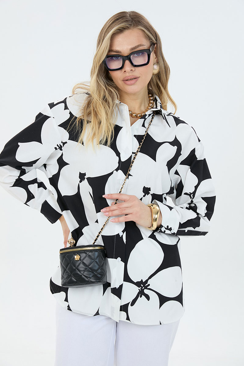 Рубашка женская большого объема, прямого силуэта. На детали спинки расположена двойная кокетка, переходящая на деталь полочки. Под кокеткой на спинке встречная складка. Воротник рубашечный отложной на стойке. Застежка планка центральная на прорезные петли и пуговицы. Линия плеча спущенная, рукав рубашечный, длинный. В нижней части рукава заложены складки, заканчивается манжетой с двумя прорезными петлями и пуговицами. Низ блузки разноуровневый: спереди короче, сзади длиннее.