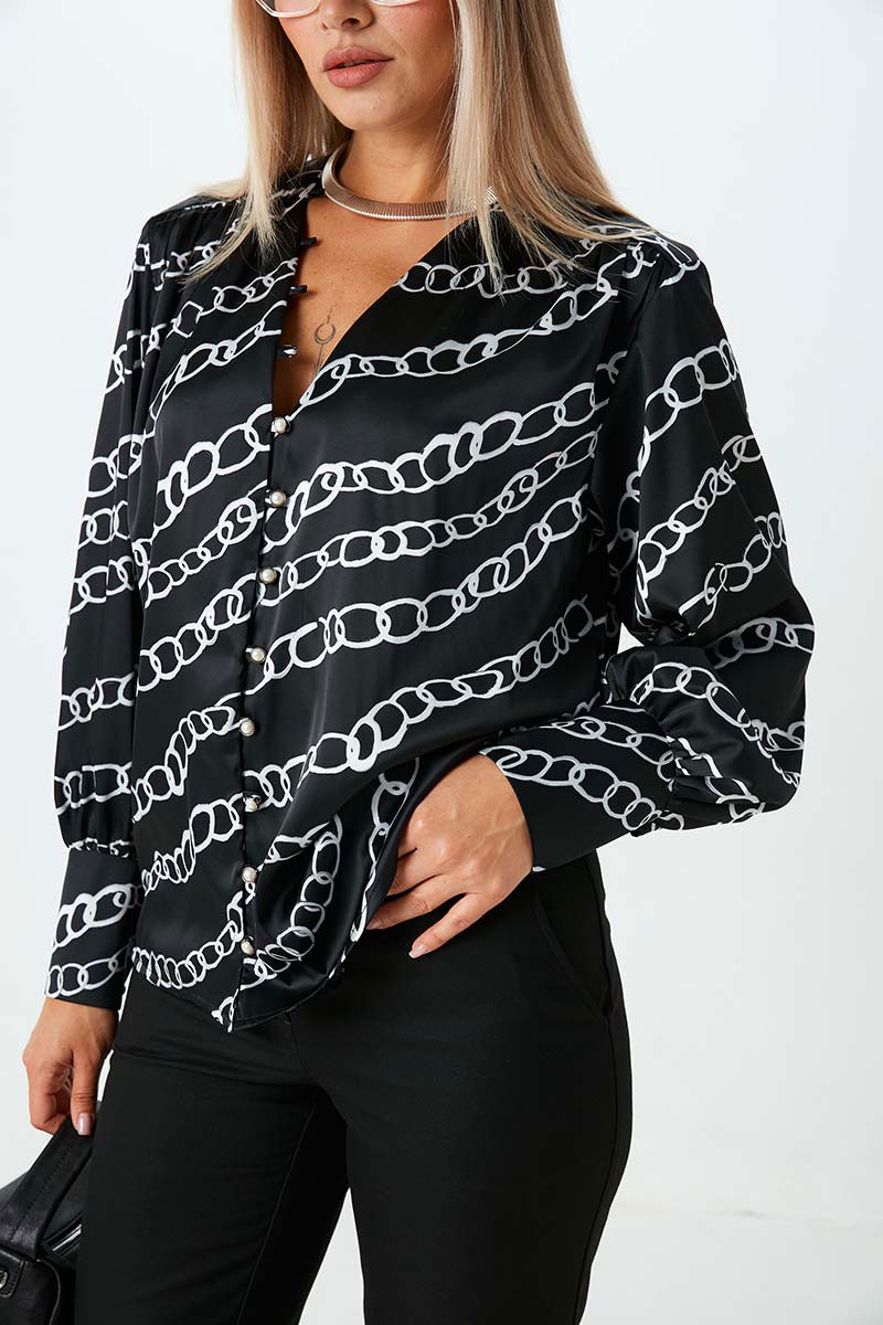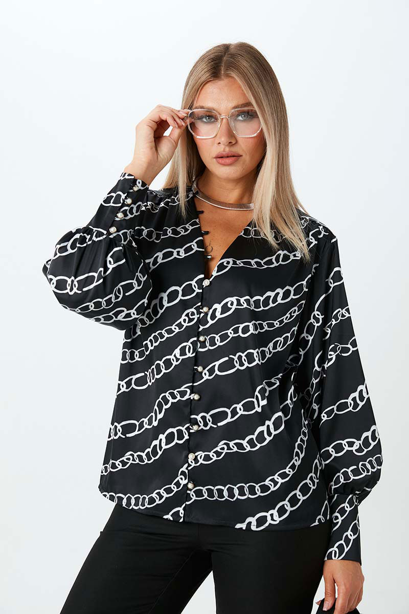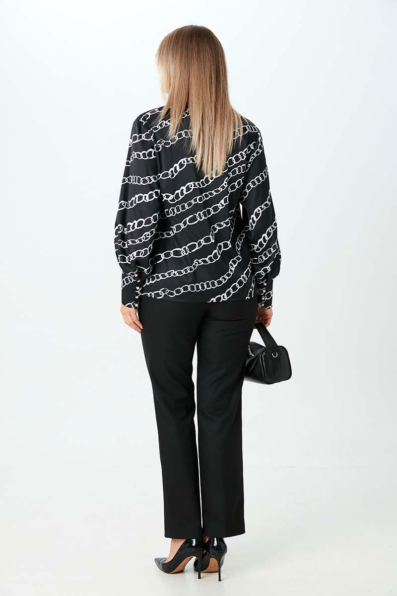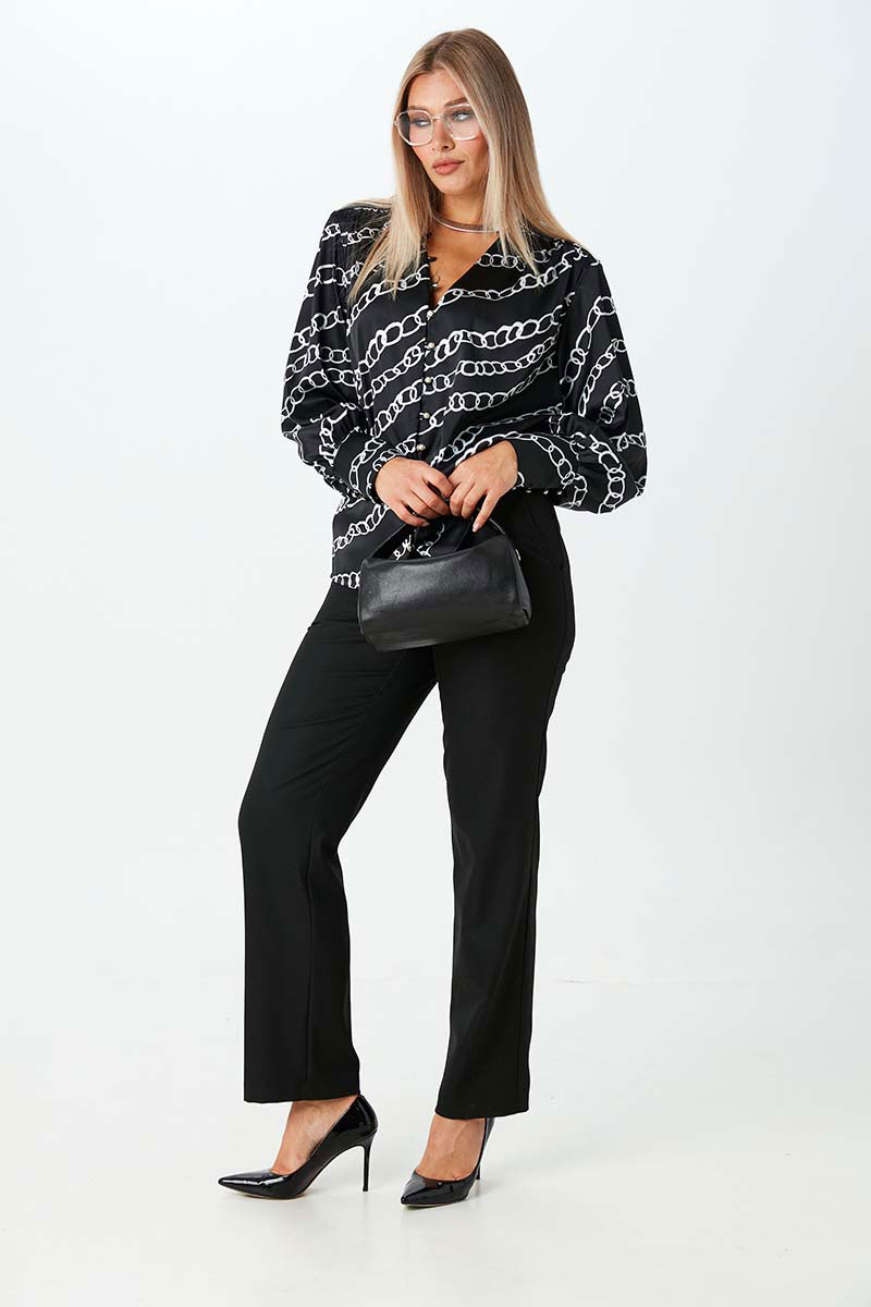 Блуза из тонкой ткани с атласным эффектом, свободного силуэта с V-образным вырезом. Это довольно глубокий вырез, который прекрасно подчёркивает декольте и линию шеи. Застежка на навесные петли и пуговицы. Рукава длинные объёмные втачные заканчиваются широкой манжетой с застёжкой на навесные петли с пуговицами.