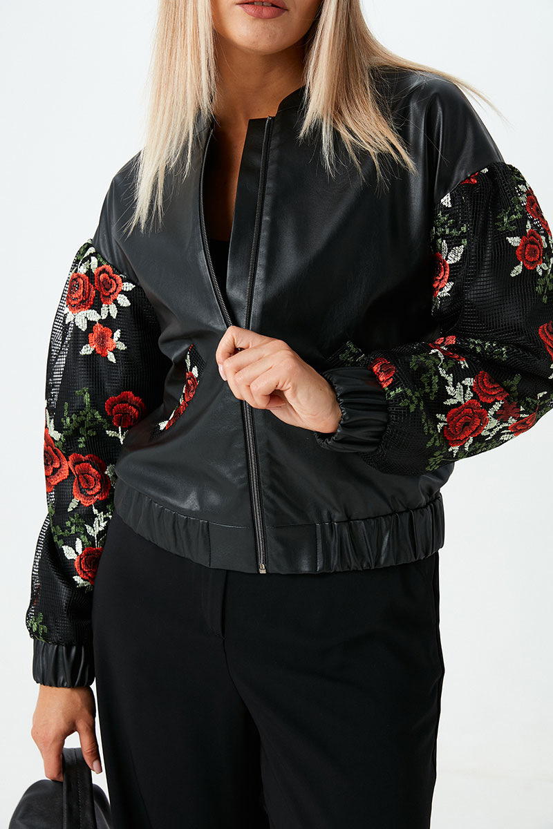 Бомбер из экокожи с объёмными рукавами и застёжкой на молнию. Манжеты и низ бомбера на резинке. Карманы и рукава бомбера декорированы сеткой с цветочной вышивкой.