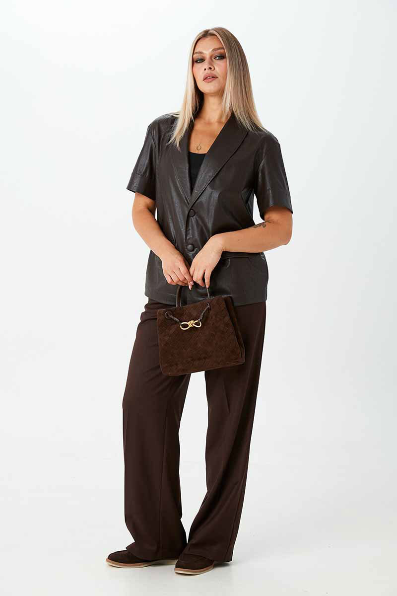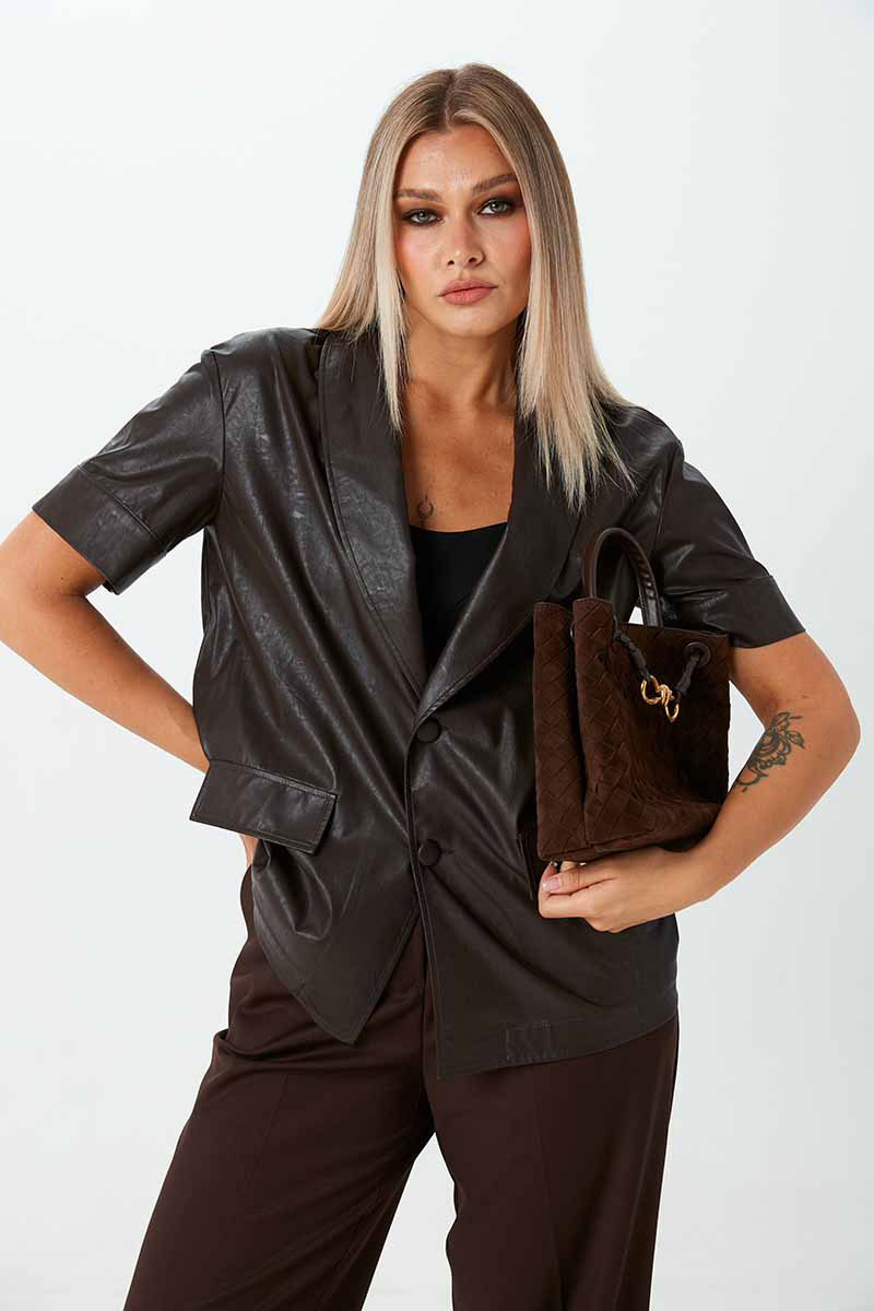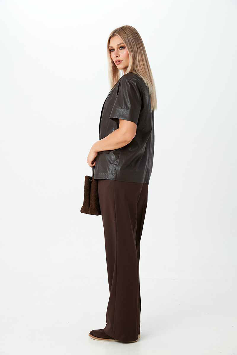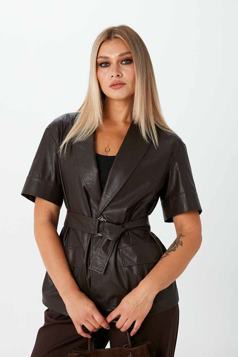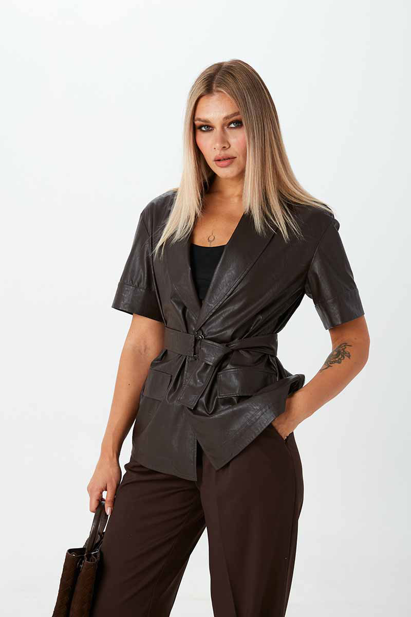 Жакет из экокожи на вискозе с короткими рукавами, без подкладки. Застёжка на пуговицы. По переду имитация карманов с клапанами. В комплекте идёт пояс с пряжкой.