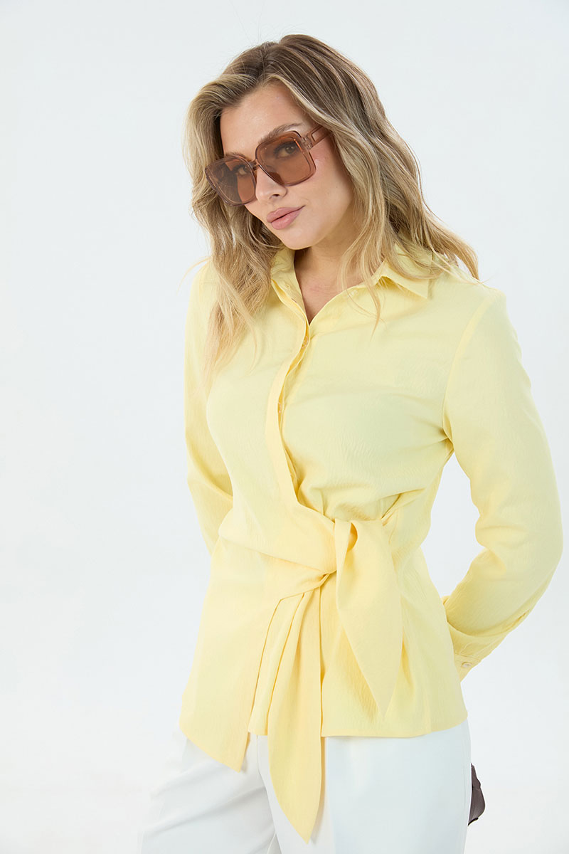 Блузка из лёгкой ткани с застёжкой-планкой на петли и пуговицы и завязкой на запах. Воротник блузки отложкой. Манжеты на пуговицах. По бокам блузки разрезы.