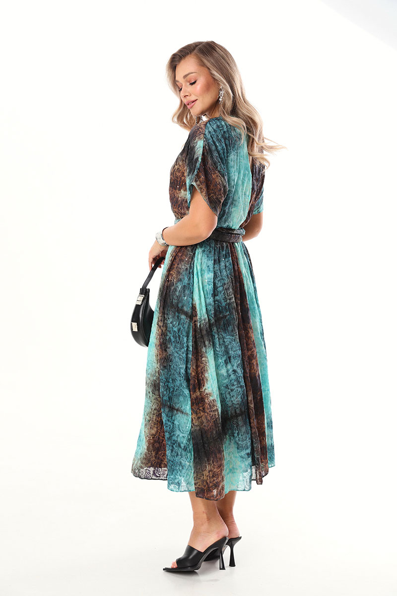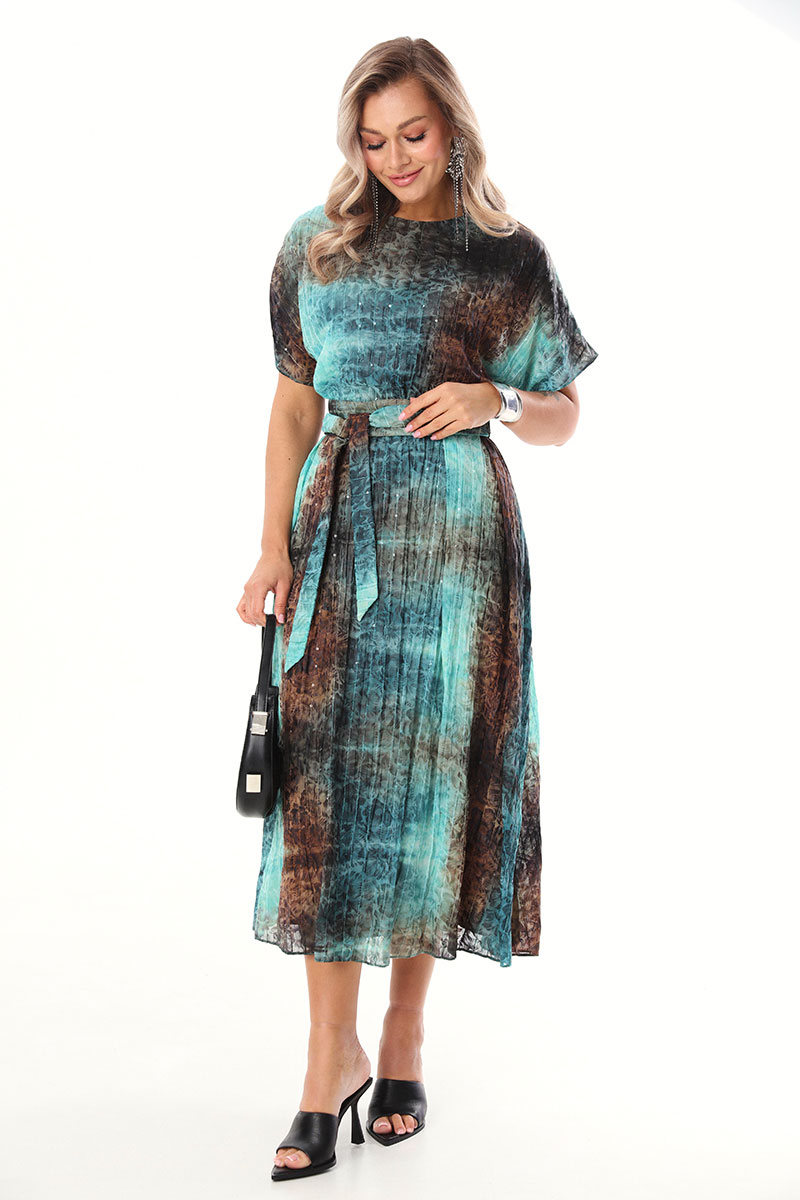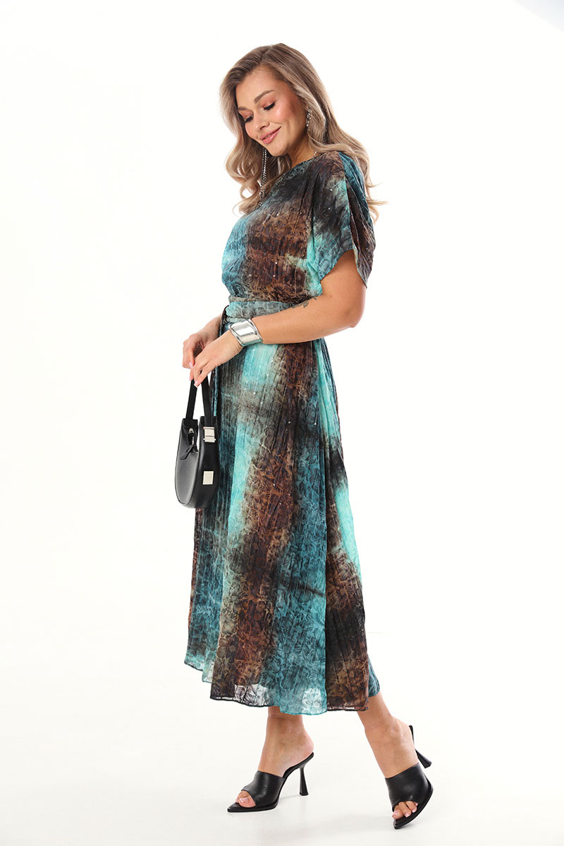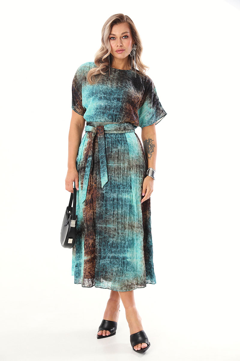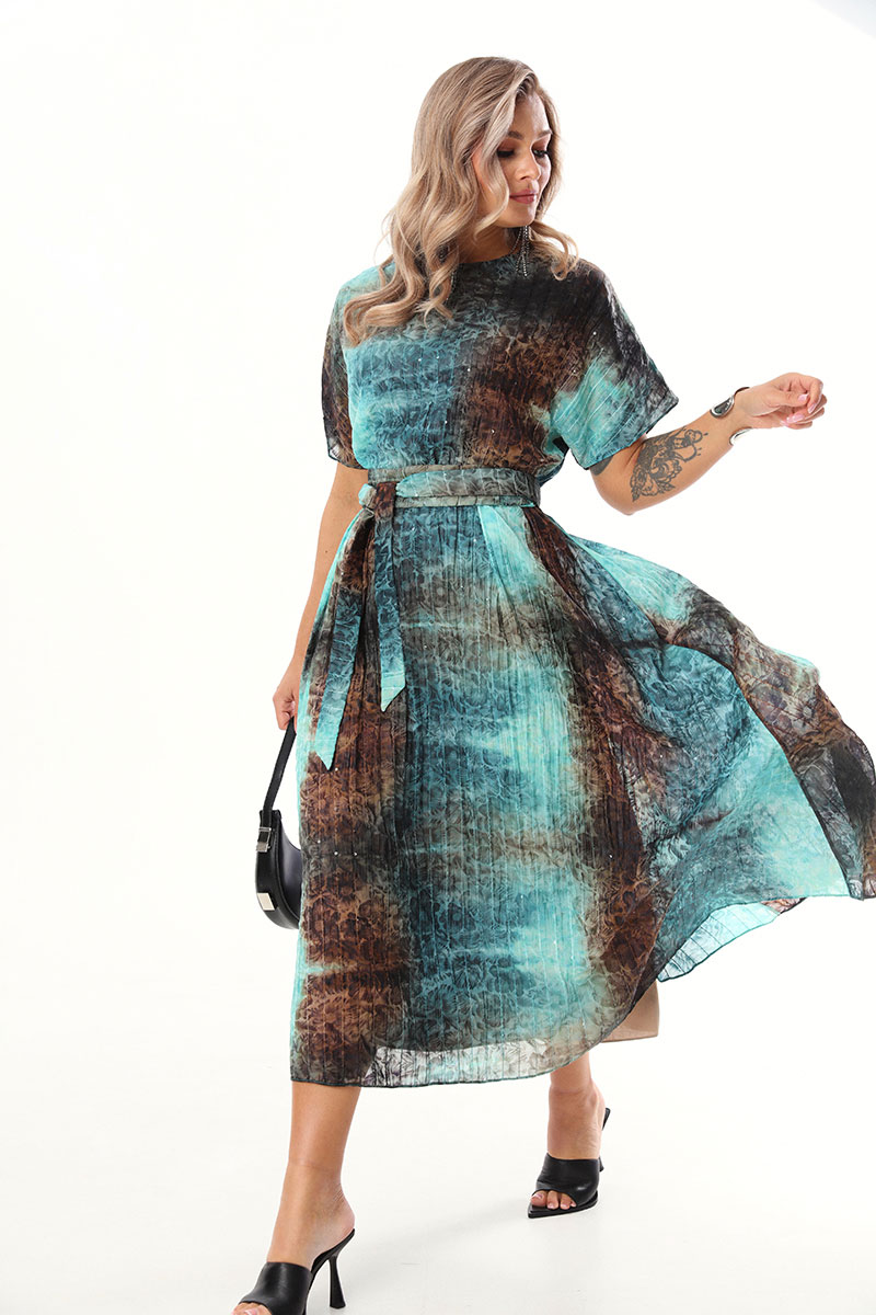 Платье из лёгкой ткани с ярким принтом. Застежка на потайную молнию по среднему шву спинки. В комплекте идет длинный съемный пояс. На юбке по линии талии заложены складки.