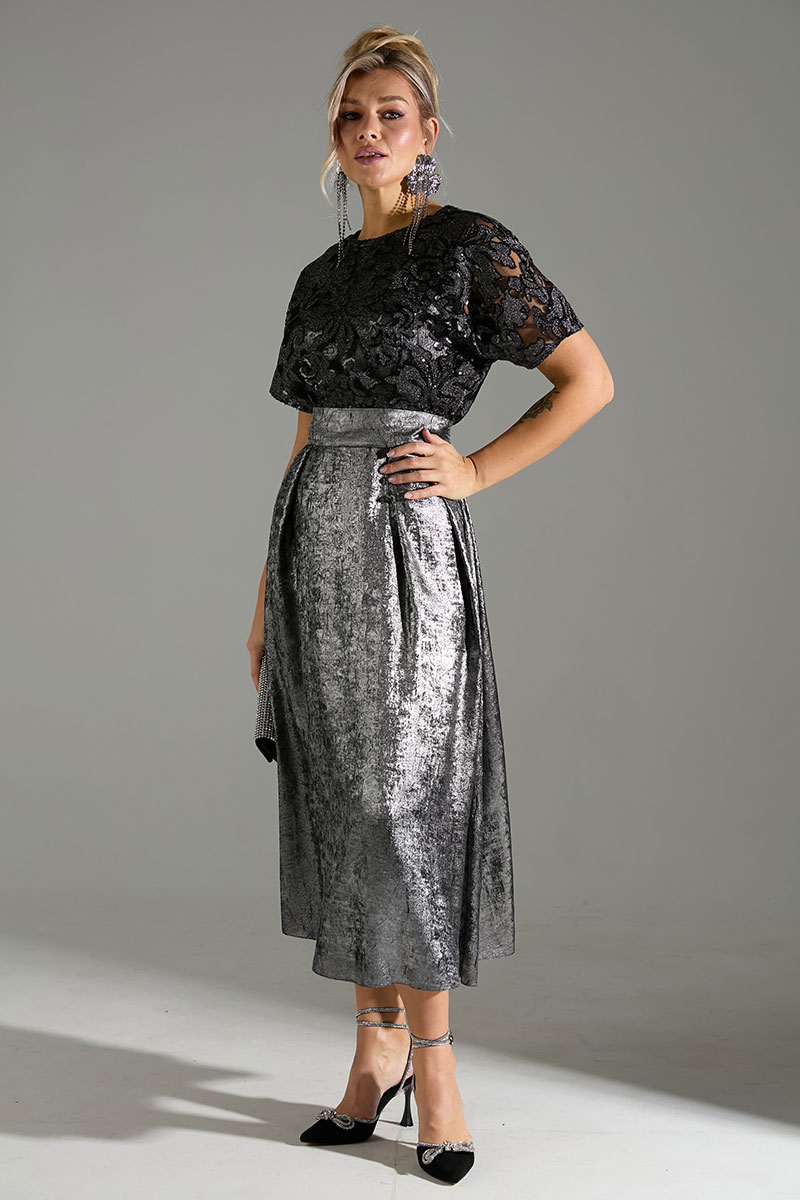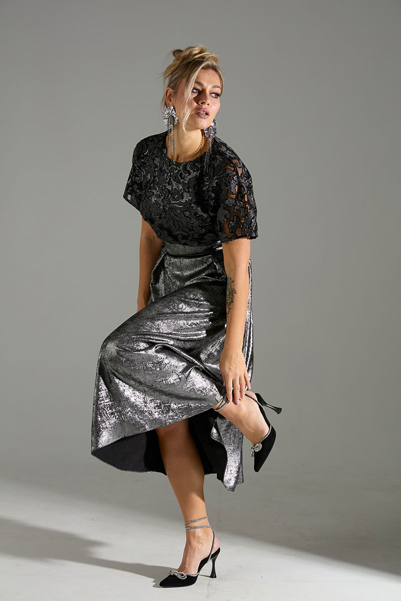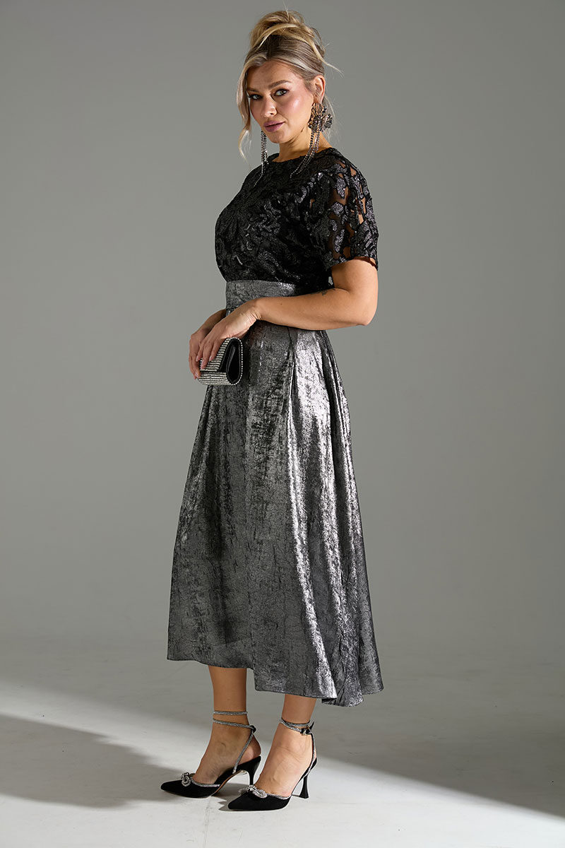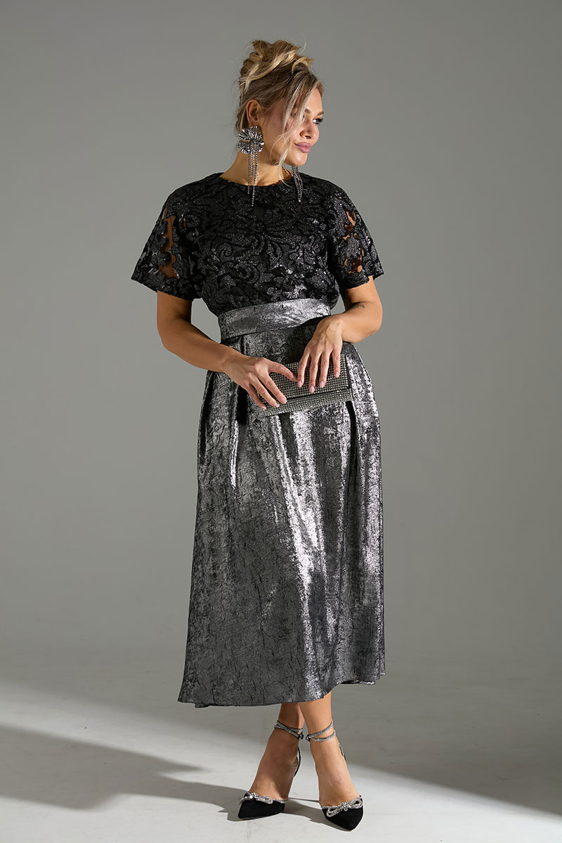 Платье длины "миди" с объёмной юбкой. Верх платья выполнен из ткани расшитой пайетками. Застежка на потайную молнию по среднему шву спинки. В комплекте идет длинный съемный пояс. На юбке по линии талии заложены складки.