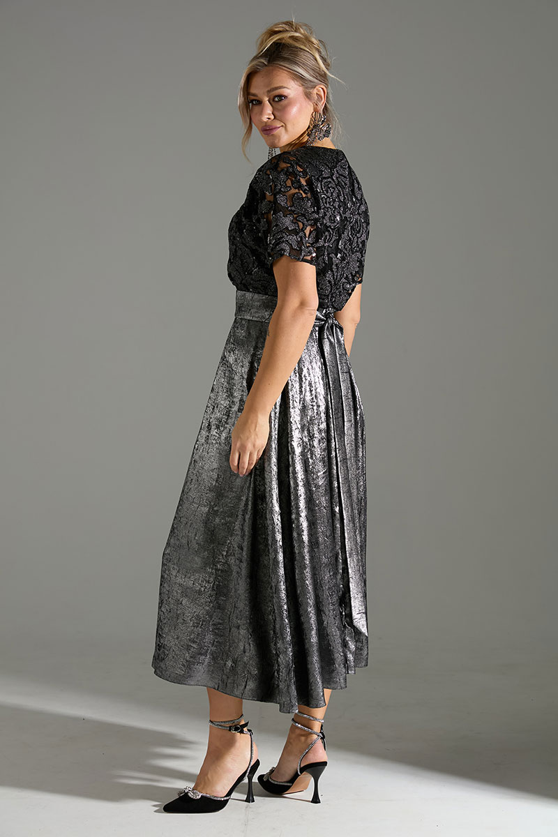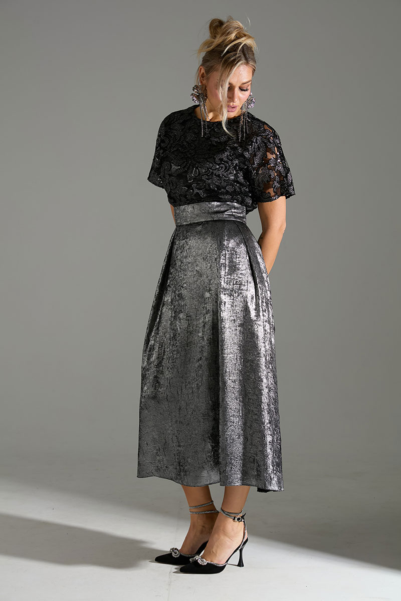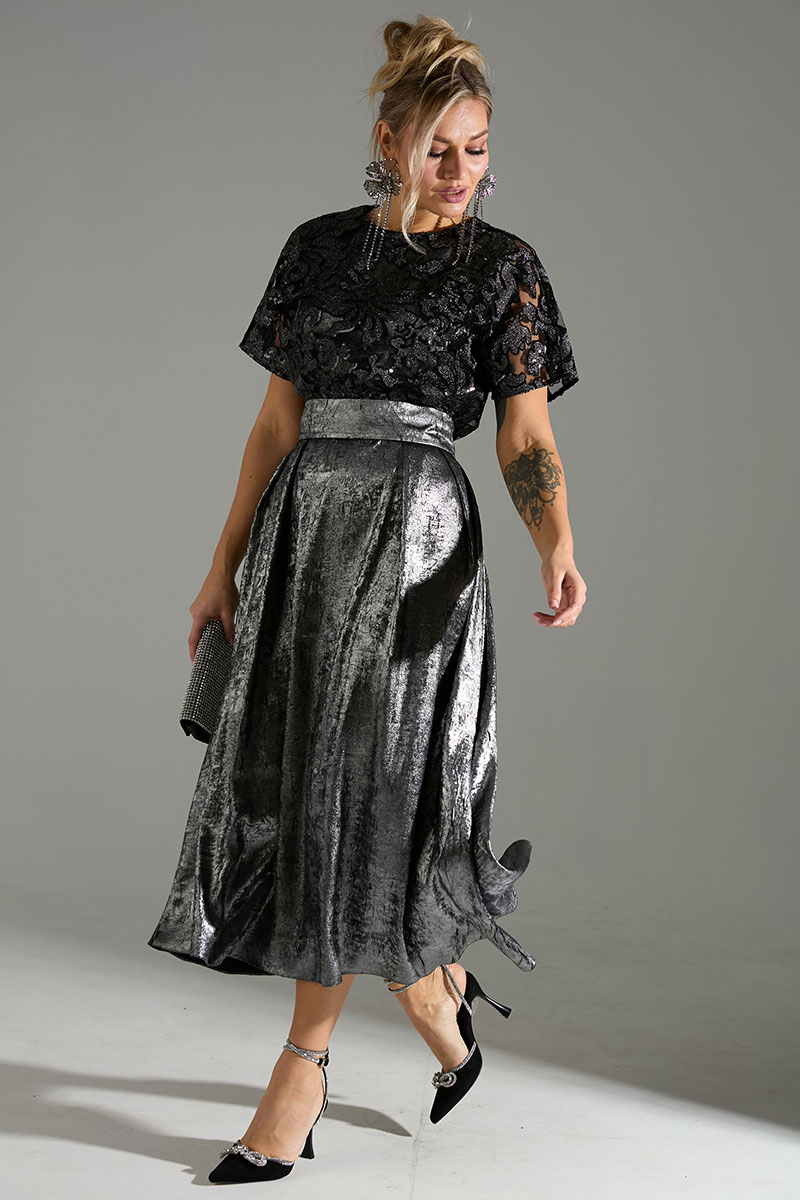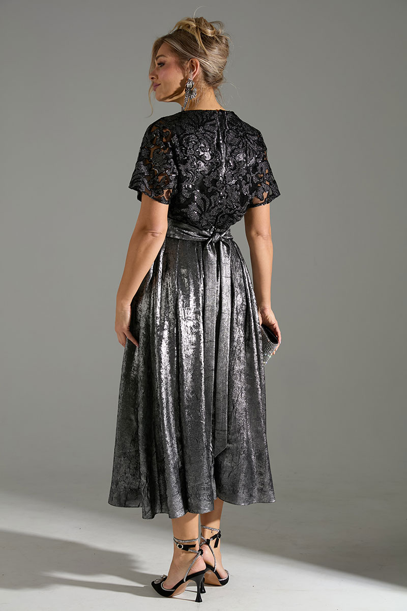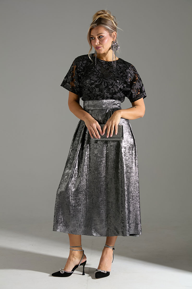 Платье длины "миди" с объёмной юбкой. Верх платья выполнен из ткани расшитой пайетками. Застежка на потайную молнию по среднему шву спинки. В комплекте идет длинный съемный пояс. На юбке по линии талии заложены складки.