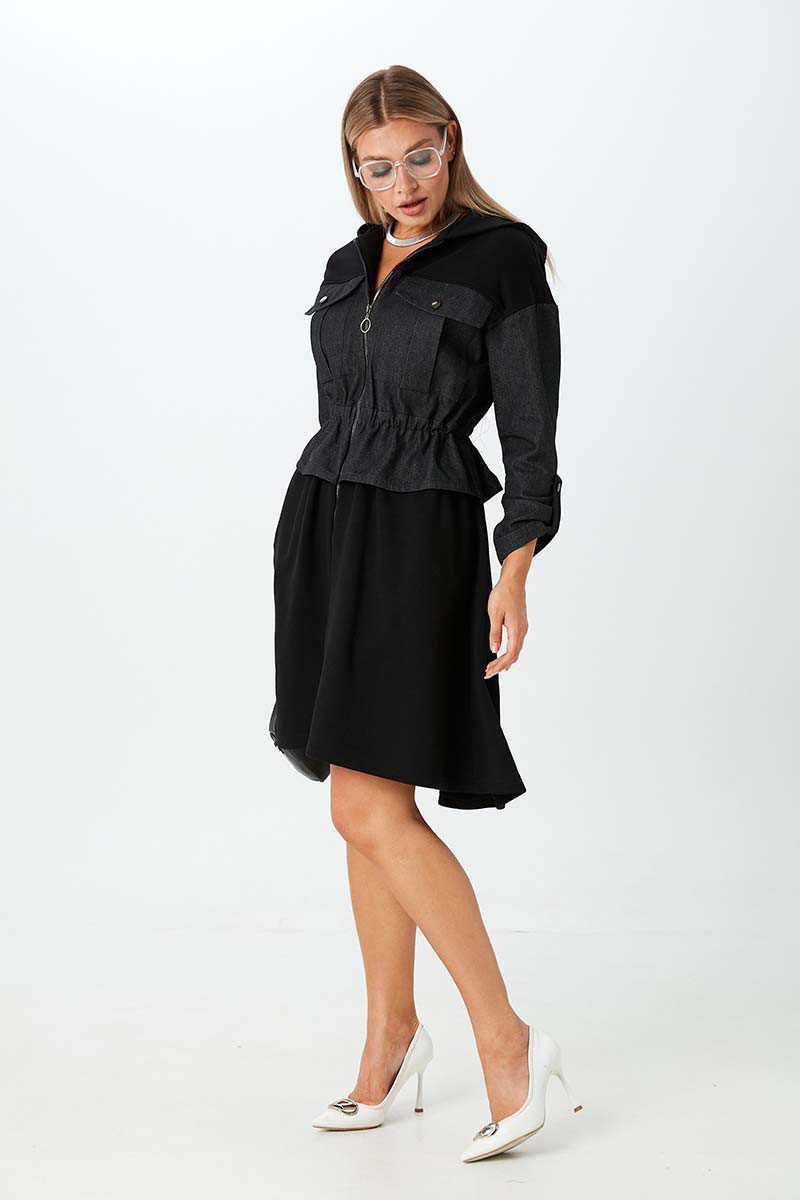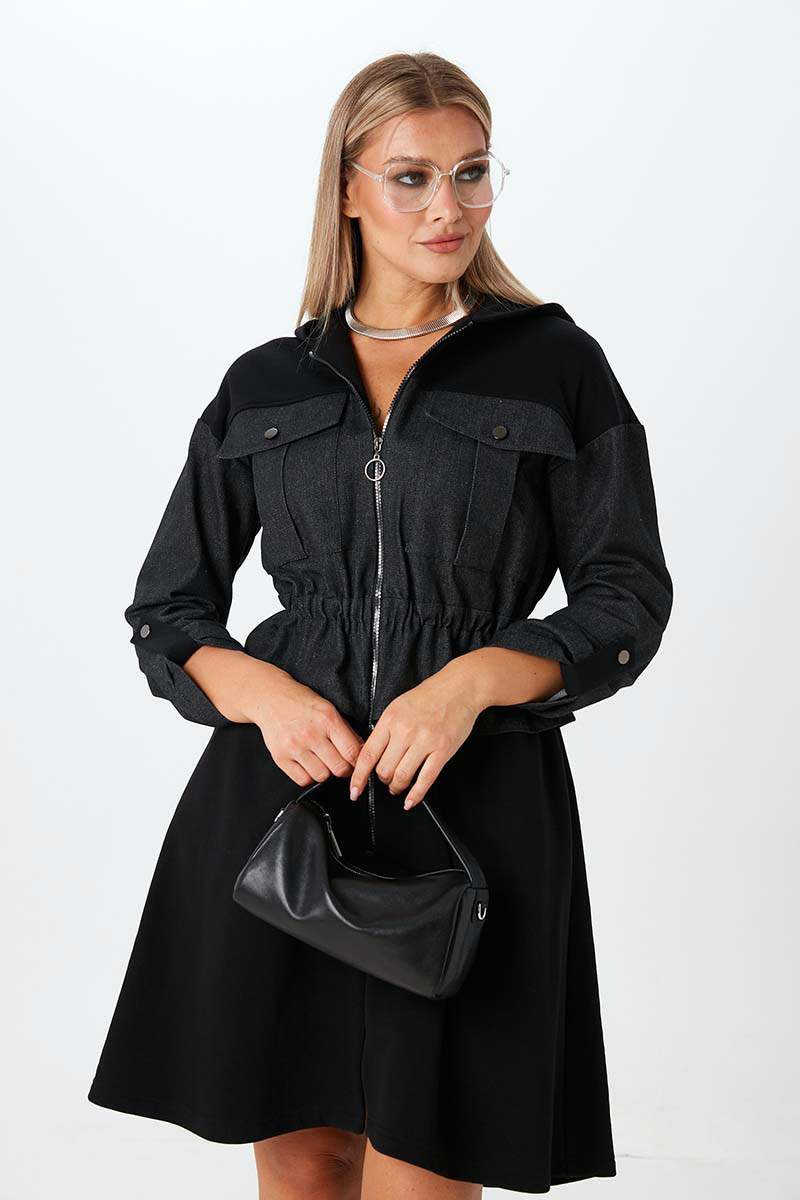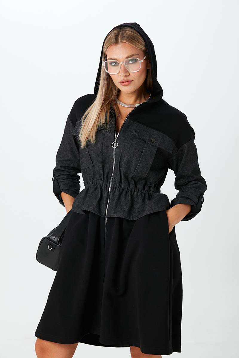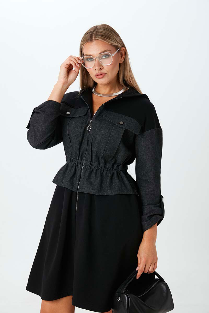 Платье в спортивном стиле длины до колена с застёжкой на молнию. Верх платья как иммитация куртки с капюшоном. По переду выше груди расположены клапаны. По талии вставлена резинка. Рукава дополнены патой с застёжкой на пуговицу для сборки. По бокам карманы.