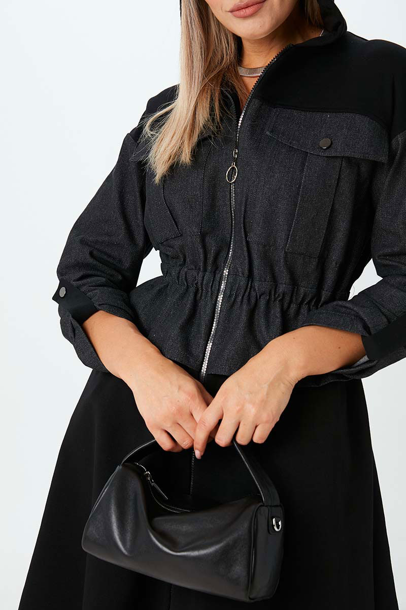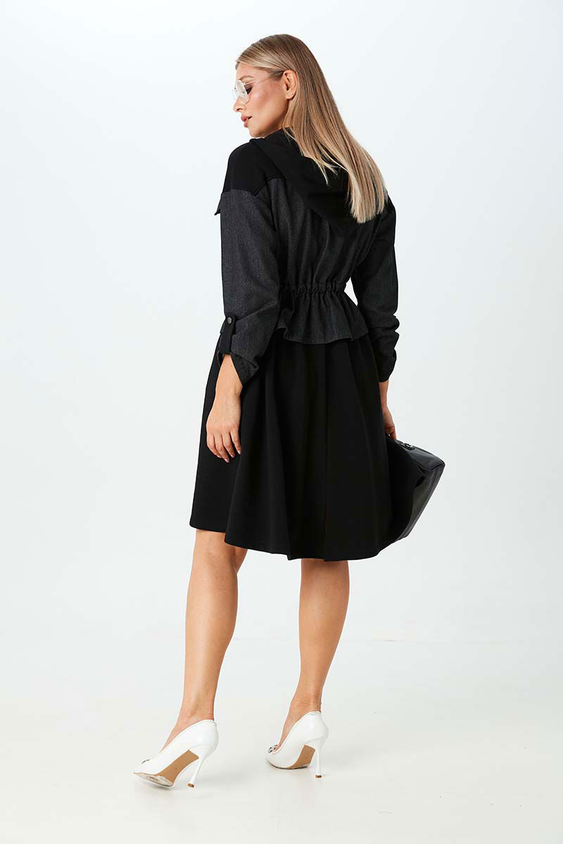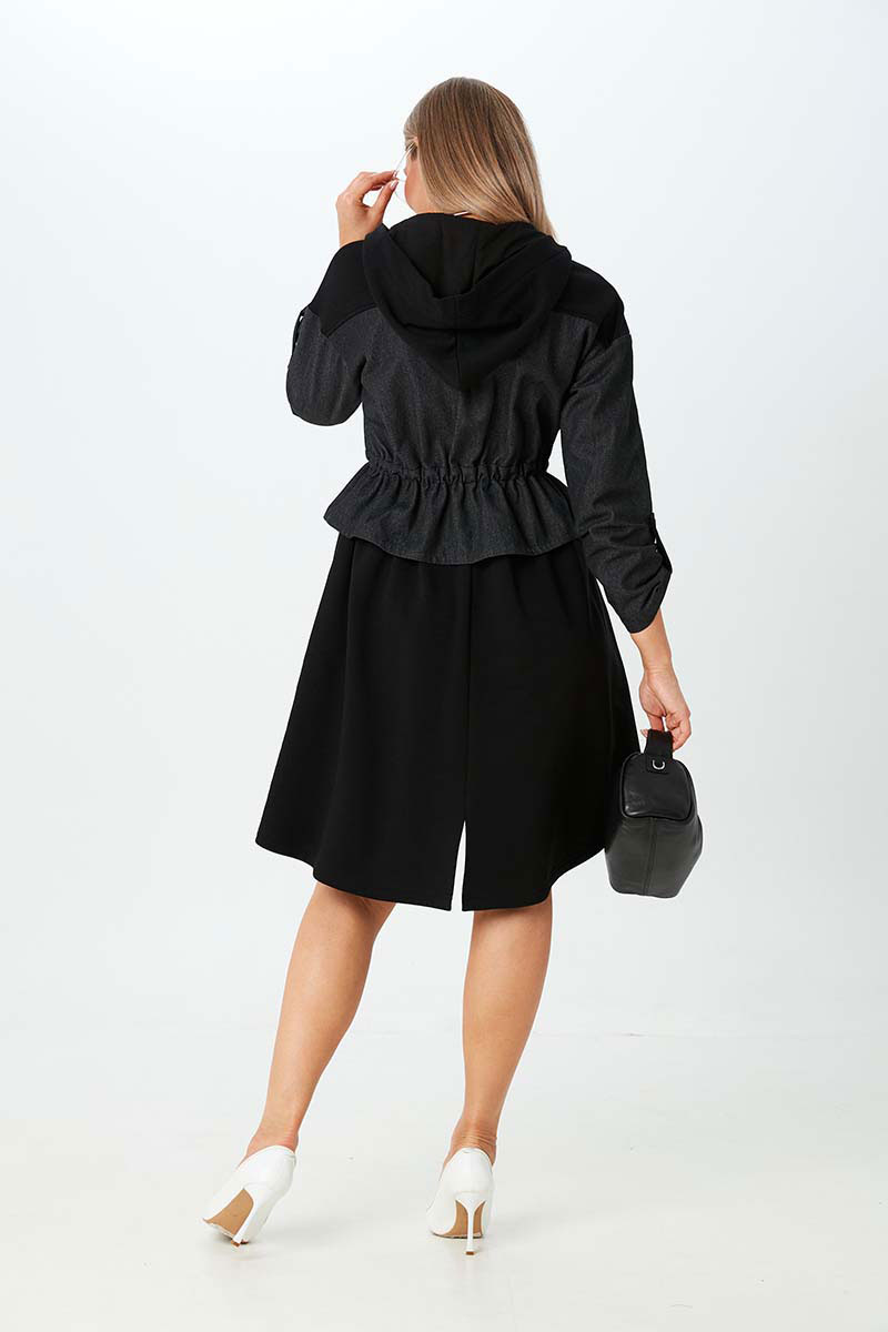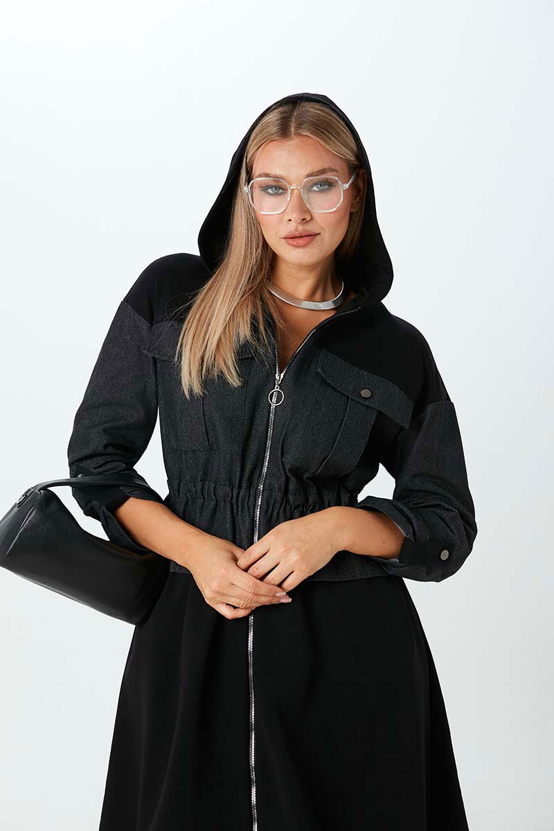 Платье в спортивном стиле длины до колена с застёжкой на молнию. Верх платья как иммитация куртки с капюшоном. По переду выше груди расположены клапаны. По талии вставлена резинка. Рукава дополнены патой с застёжкой на пуговицу для сборки. По бокам карманы.