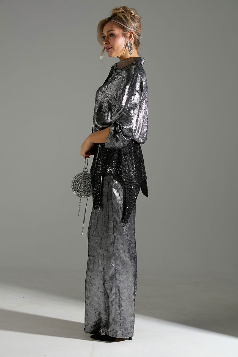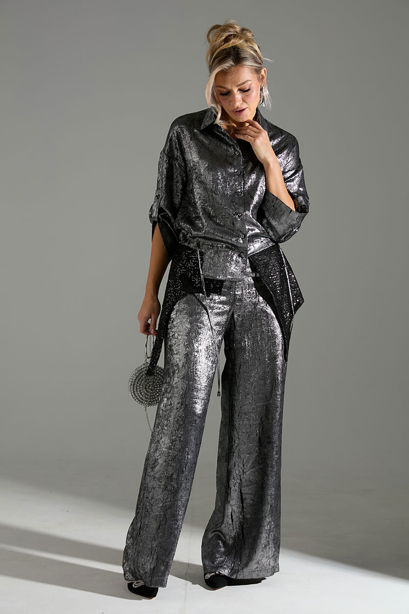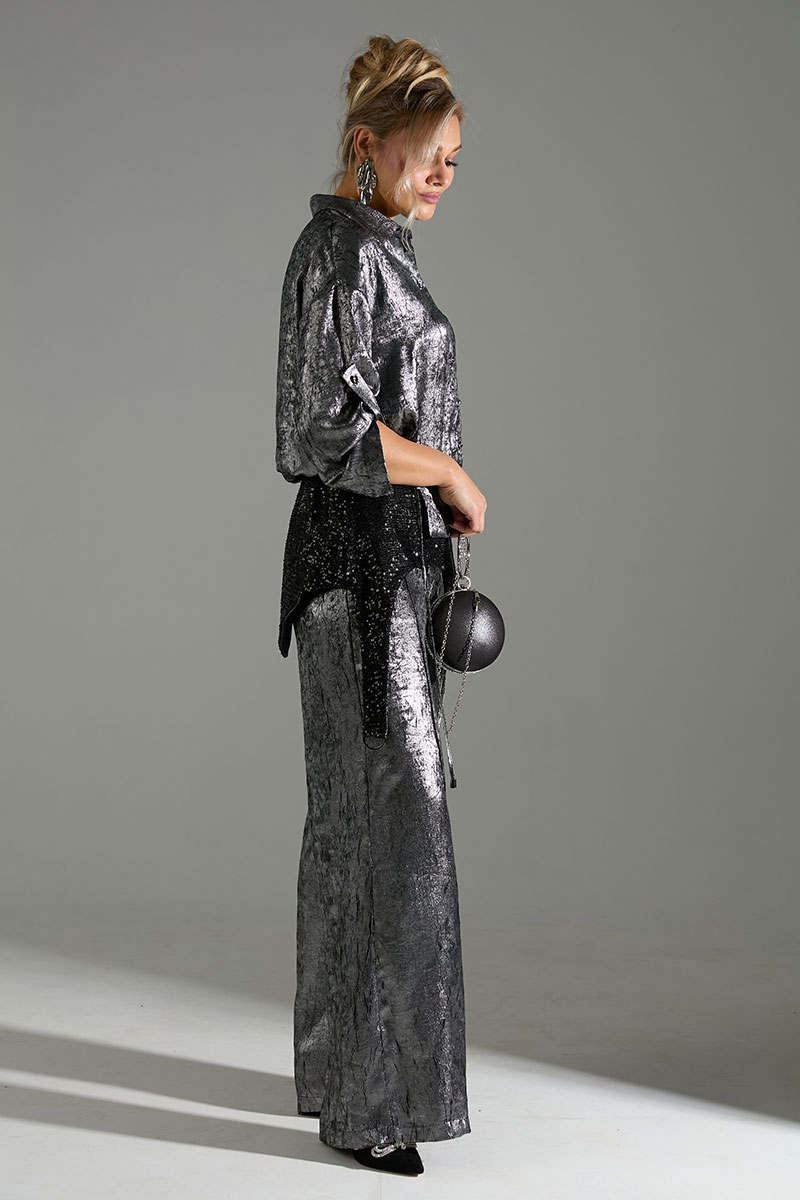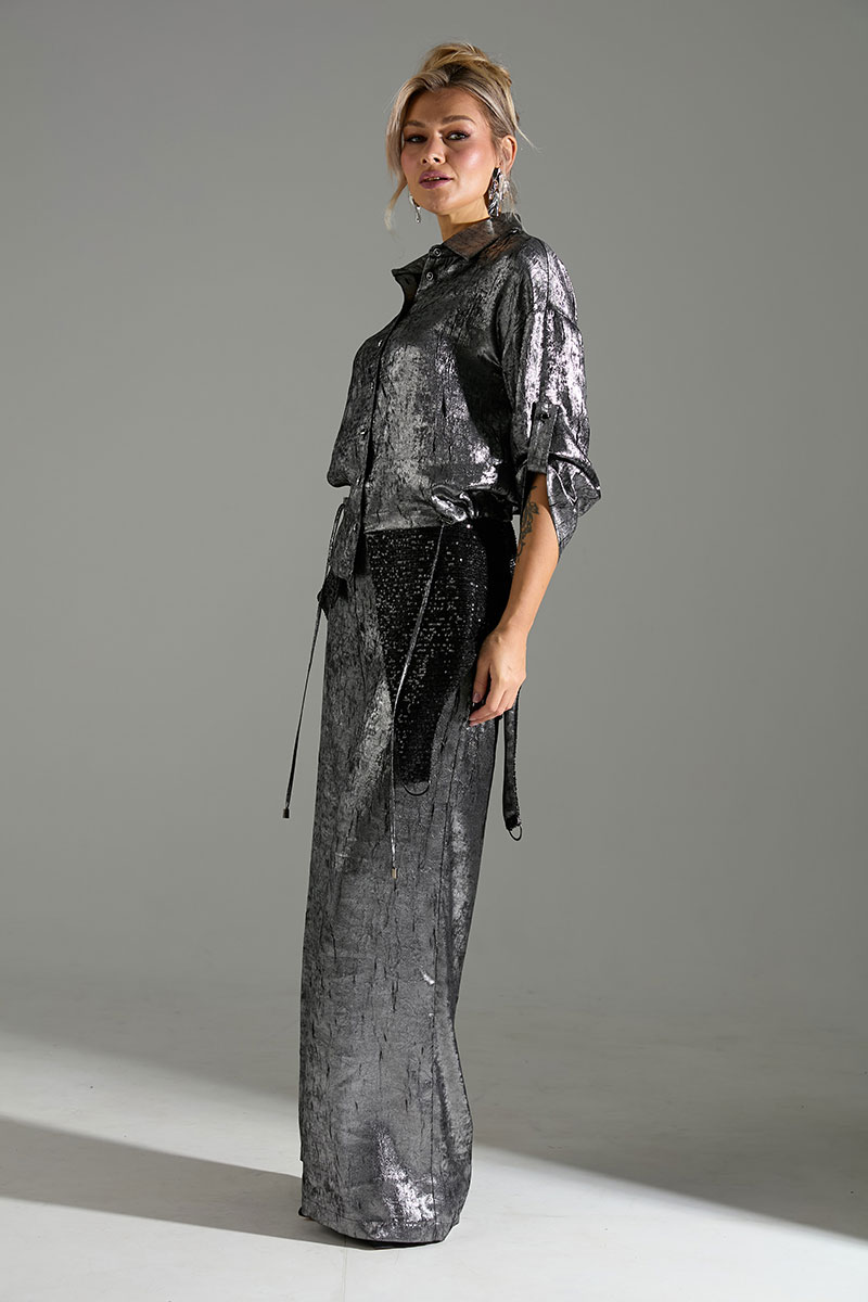 Костюм 2ка, состоящий из рубашки и брюк. Рубашка на пуговицах объёмного силуэта. Рукава дополнены шлейкой с застёжкой на пуговицу для сборки. Брюки широкого объема, прямого силуэта. В комплект входит съёмный пояс из пайеток.