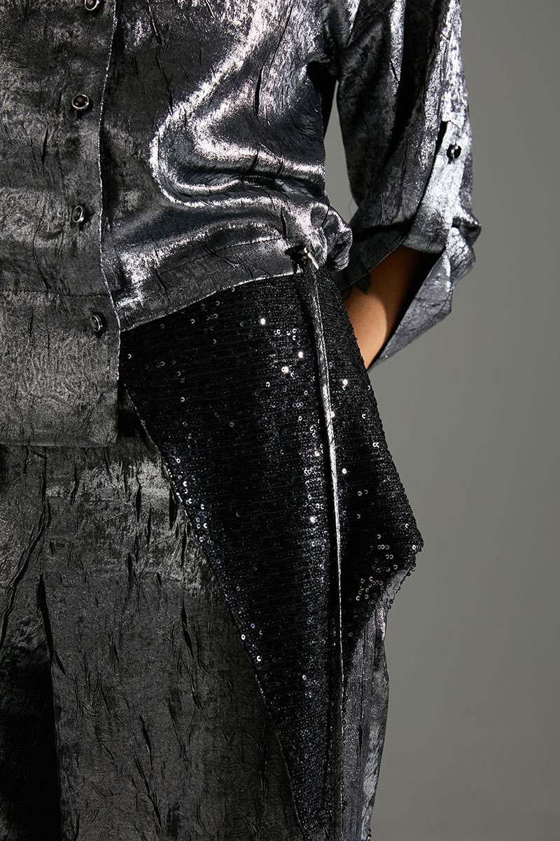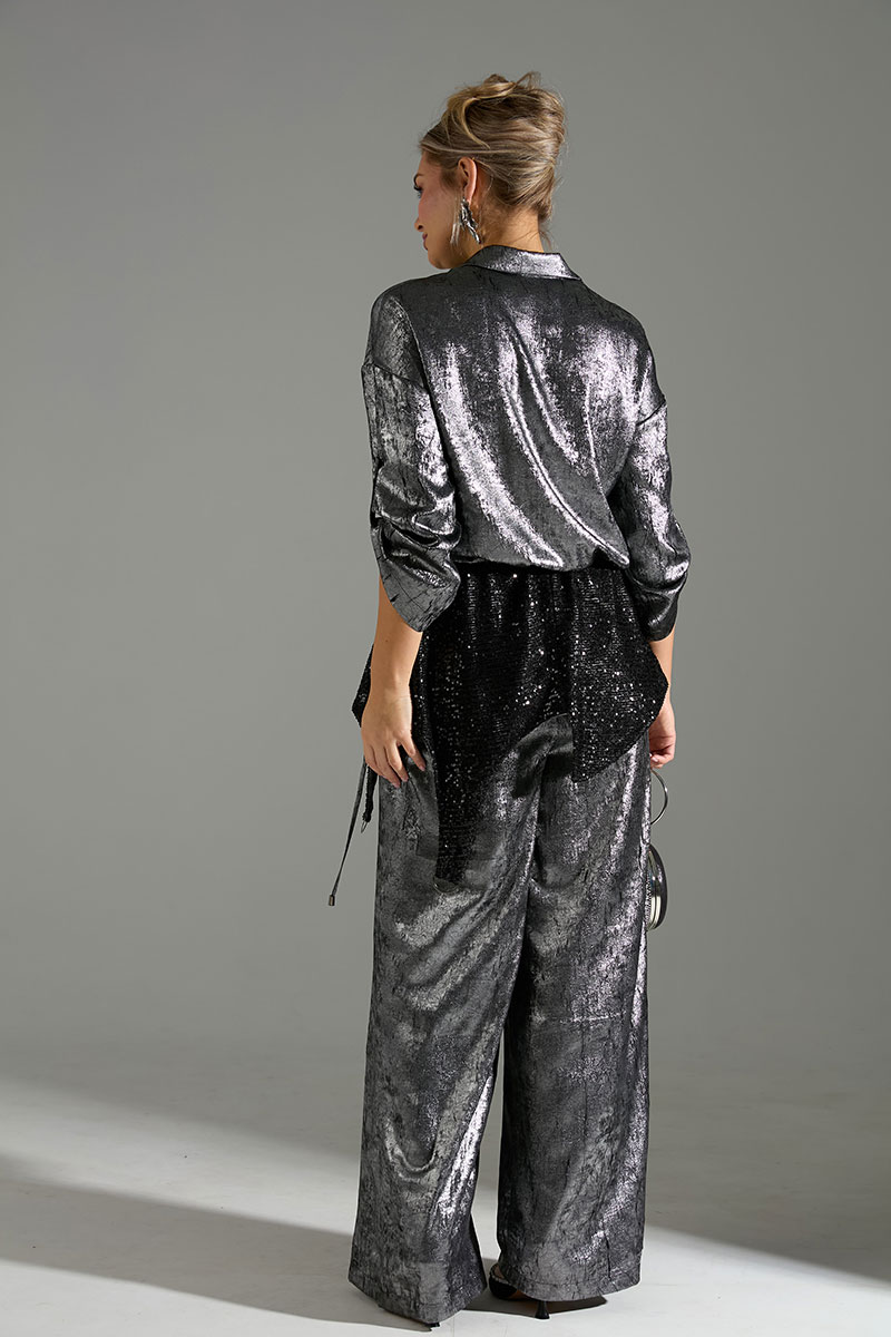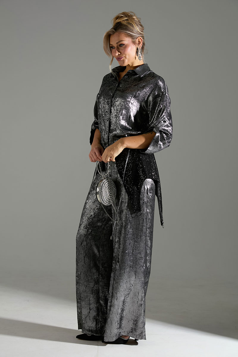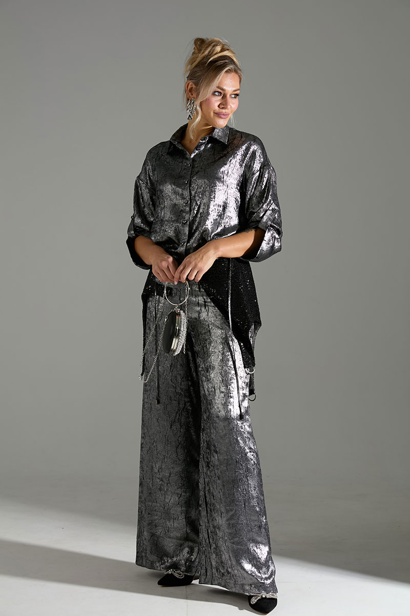 Костюм 2ка, состоящий из рубашки и брюк. Рубашка на пуговицах объёмного силуэта. Рукава дополнены шлейкой с застёжкой на пуговицу для сборки. Брюки широкого объема, прямого силуэта. В комплект входит съёмный пояс из пайеток.