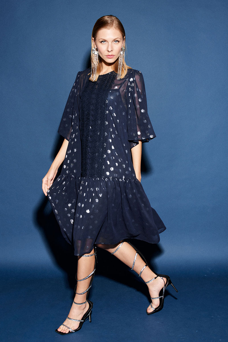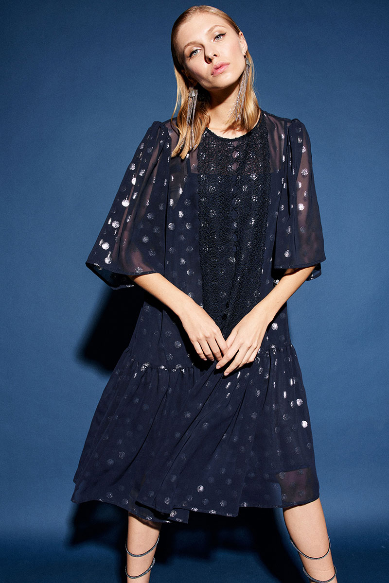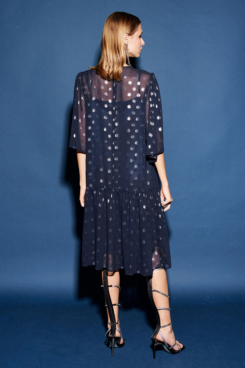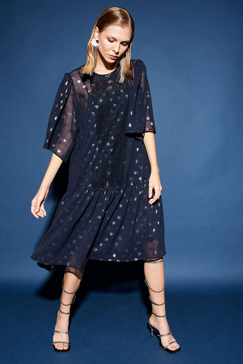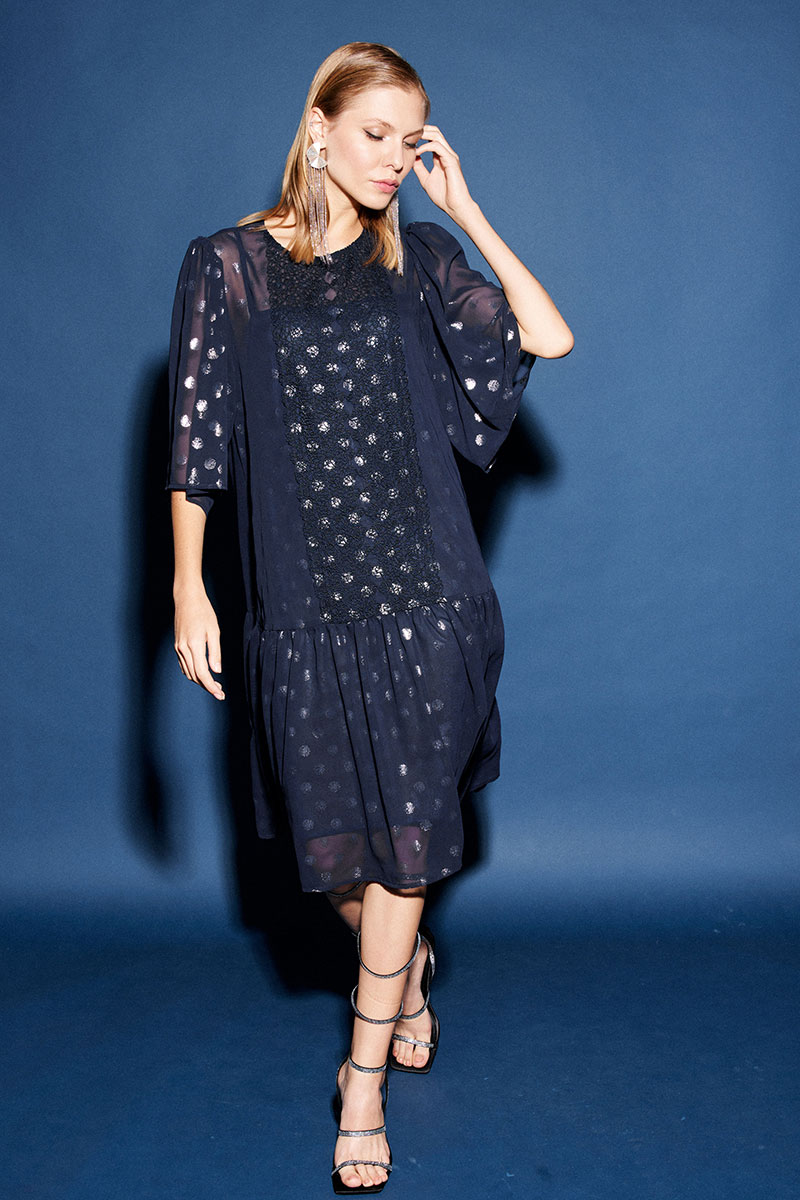 Платье свободного кроя, двух предметное, и выполнено из двух видов ткани: шифона и лёгкой трикотажной подкладки. По переду округлый вырез горловины и по центру настрочное французское кружево. По спинке застёжка на навесную петлю и пуговицу. К верхней части платья притачивается волан в сборку. Рукав втачной «колокол», верхняя часть со сборкой. Нижний слой – комбинация, выполненная из трикотажной подкладки. Платье прямое, свободное, на бретелях. По переду и спинке фигурный вырез горловины.