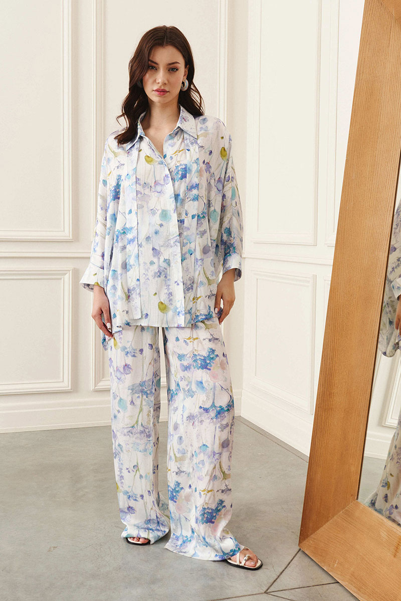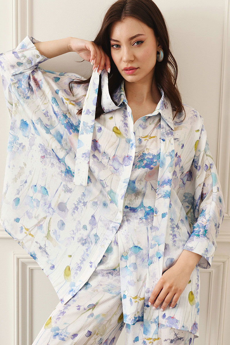 Рубашка свободного, широкого силуэта (оверсайз). Рукав цельновыкроеный, длина ¾ с манжетой. Воротник рубашечного типа, застёжка на петлю и пуговицу.