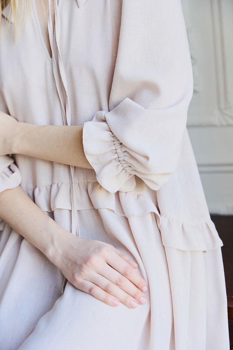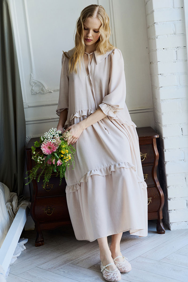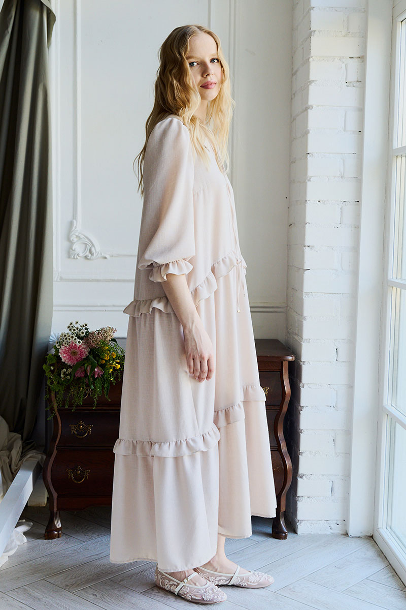 Платье свободного кроя, А силуэта. Рукав втачной ¾, по низу рукава резинка. Воротник плосколежащий, у основания горловины – вырез, застежка на завязку. По переду и спинке подрезы с отделочными рюшами на сборку.