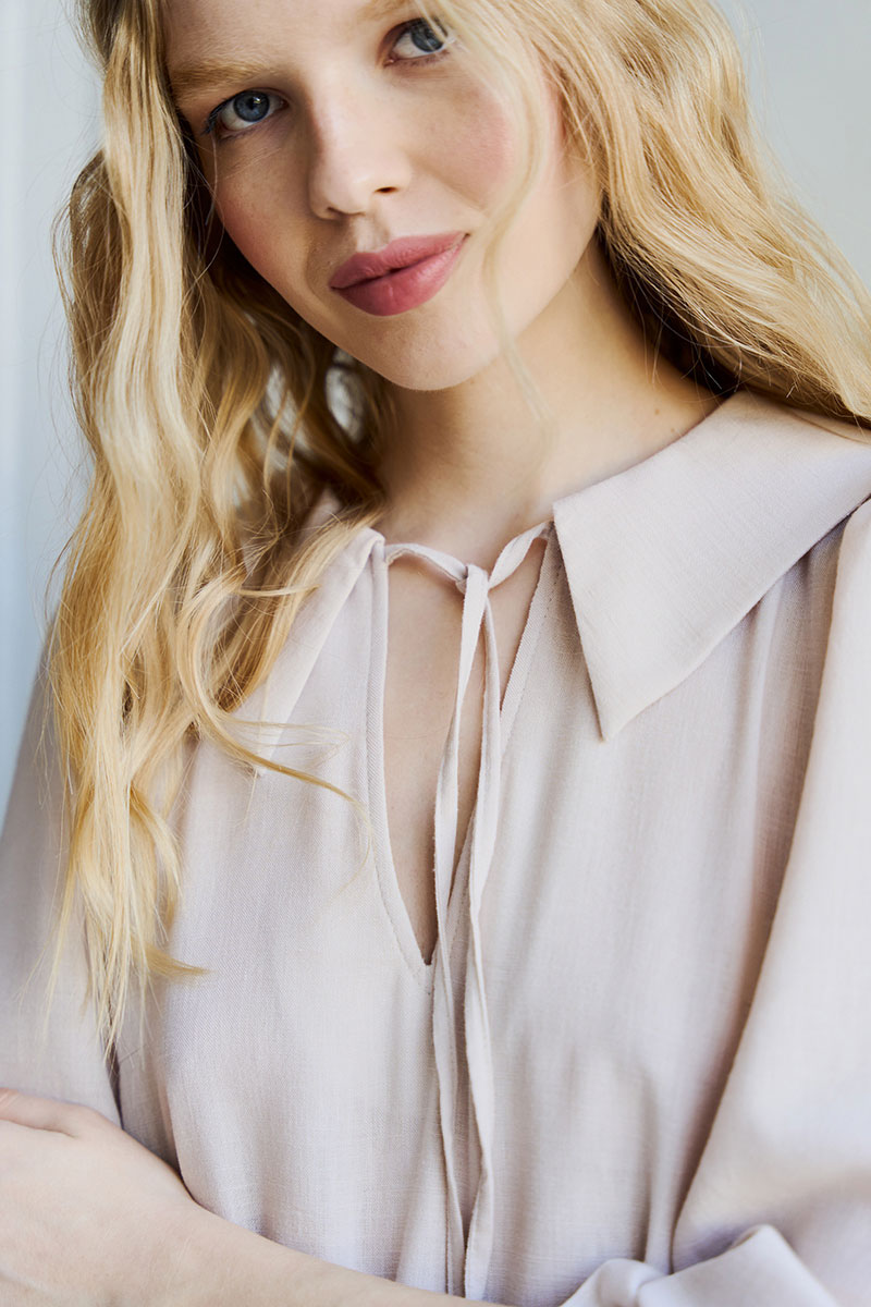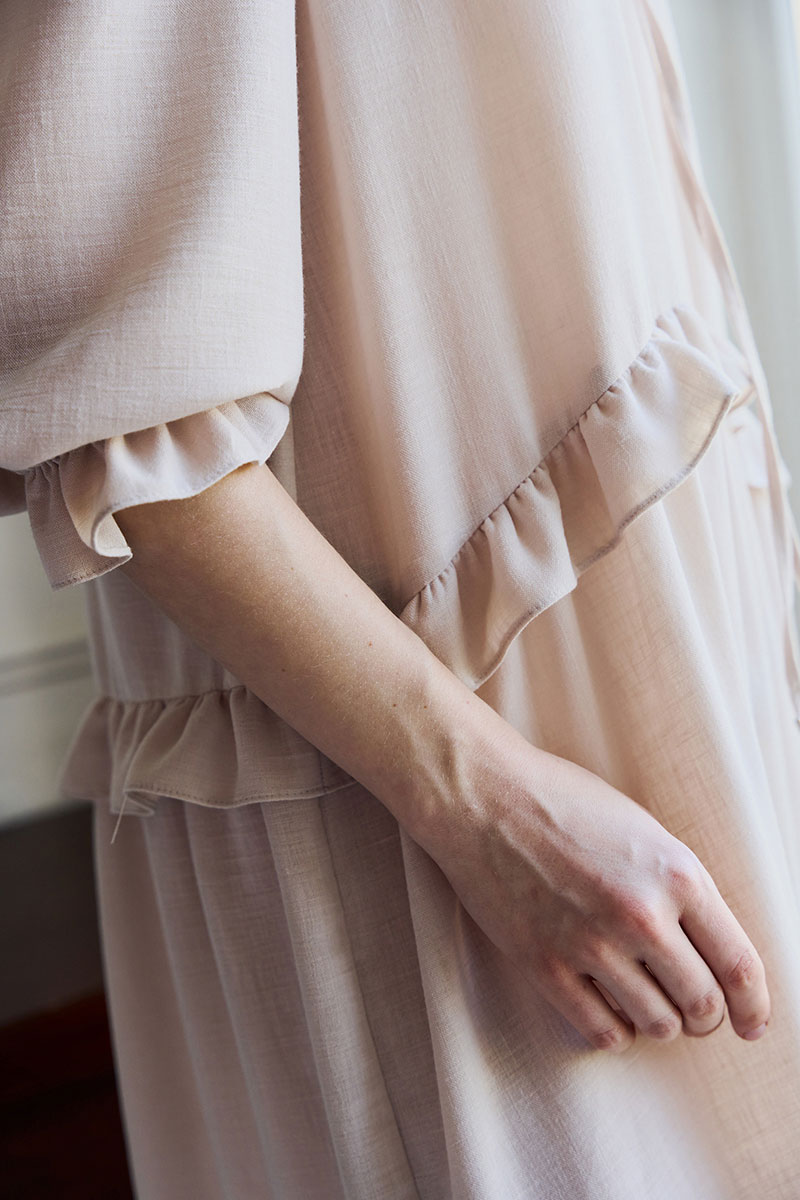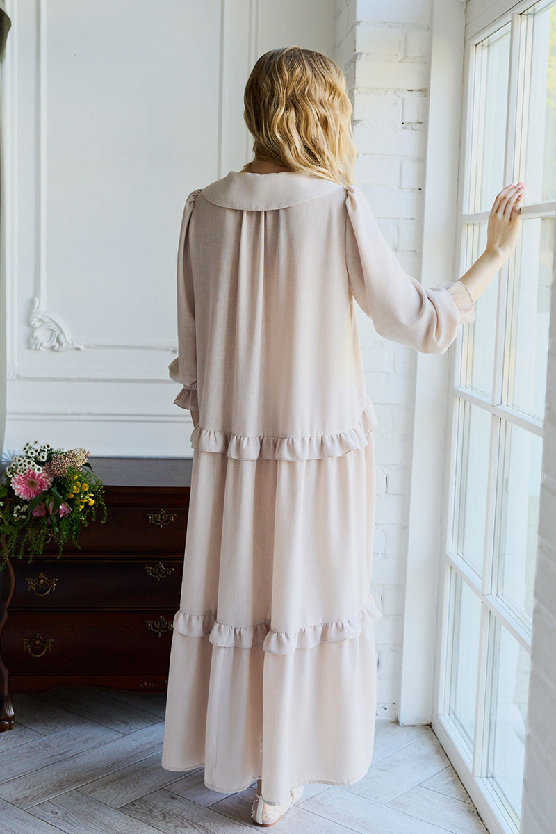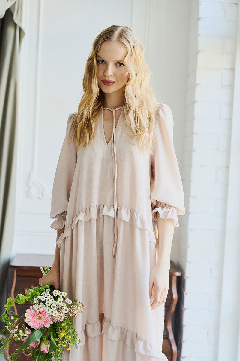 Платье свободного кроя, А силуэта. Рукав втачной ¾, по низу рукава резинка. Воротник плосколежащий, у основания горловины – вырез, застежка на завязку. По переду и спинке подрезы с отделочными рюшами на сборку.