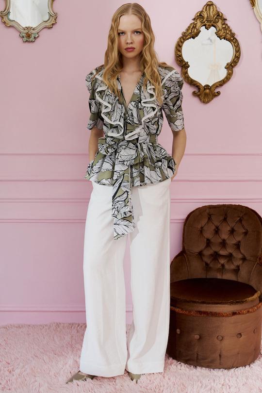 Блуза полуприлегающего силуэта, выполнена из хлопковой ткани. Рукав втачной, по верхней части рукава сборка. По переду притачная планка с воланом, по отлету волана вшито кружевная тесьма. У-образный вырез горловины, застёжка центральная на петли и пуговицы. Линия талии отрезная, в шов подреза вшит отлетной пояс. Нижняя часть блуза- "баска", по талии собрана на сборку.