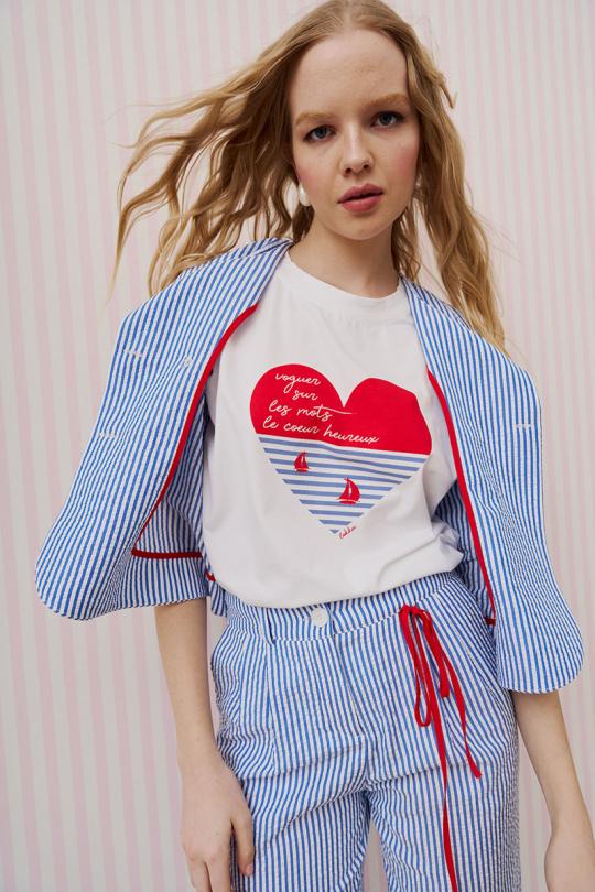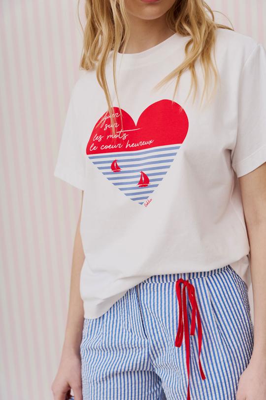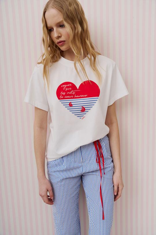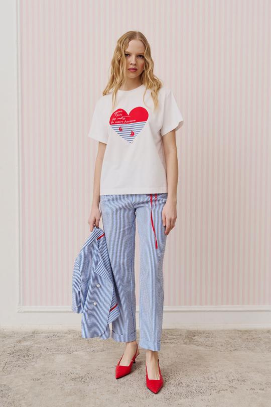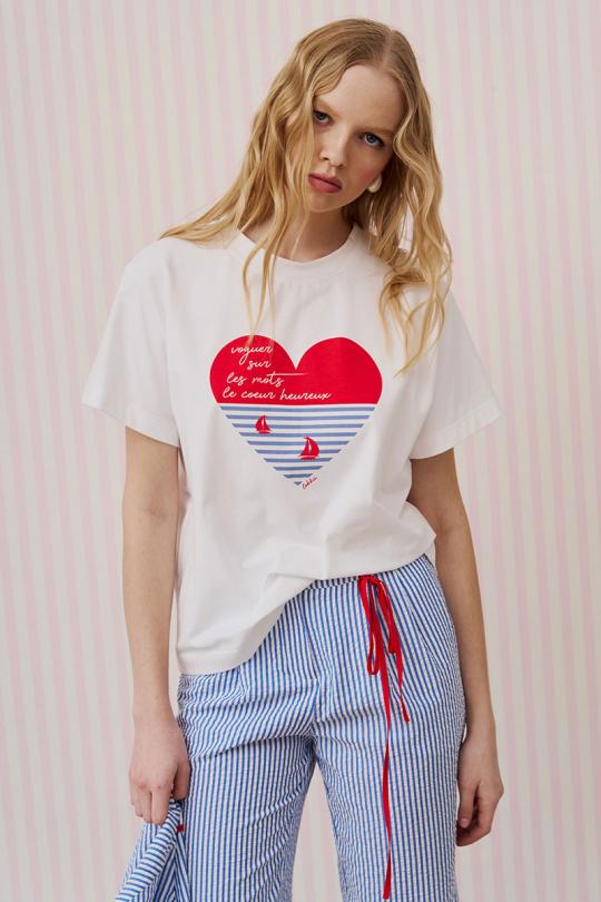 Футболка свободного кроя прямого силуэта, линия плеча спущена, рукав короткий, округлый вырез горловины обработан бейкой, по центру печать.