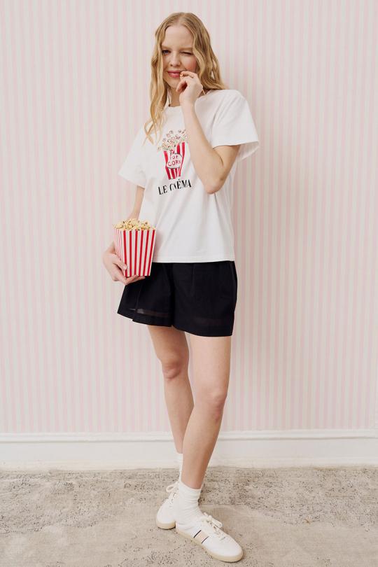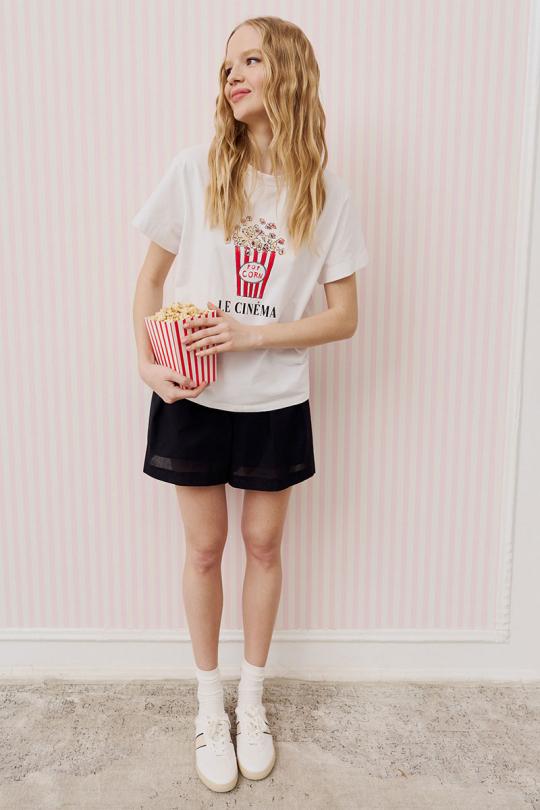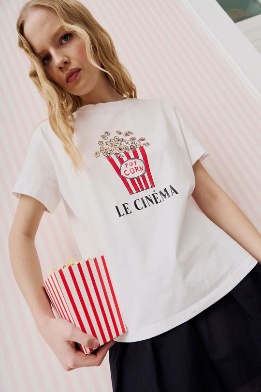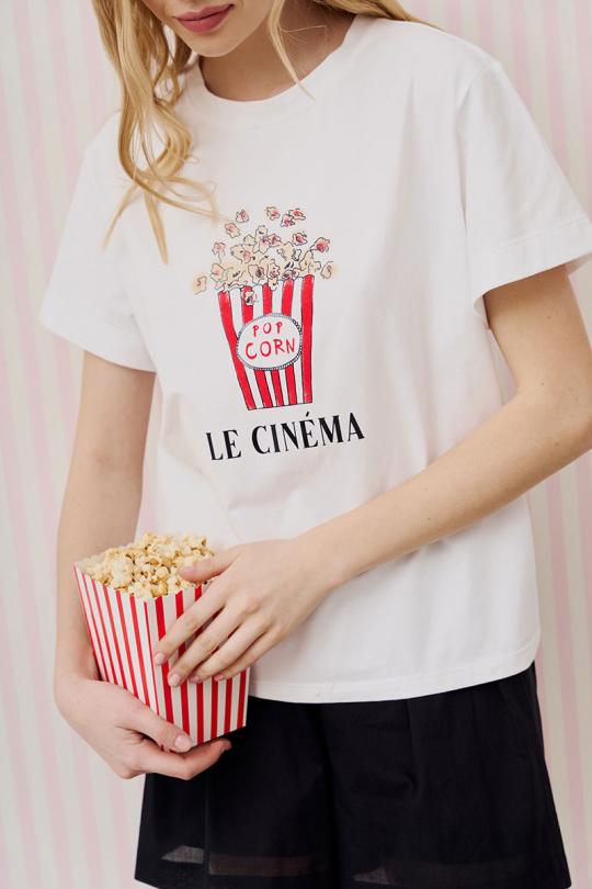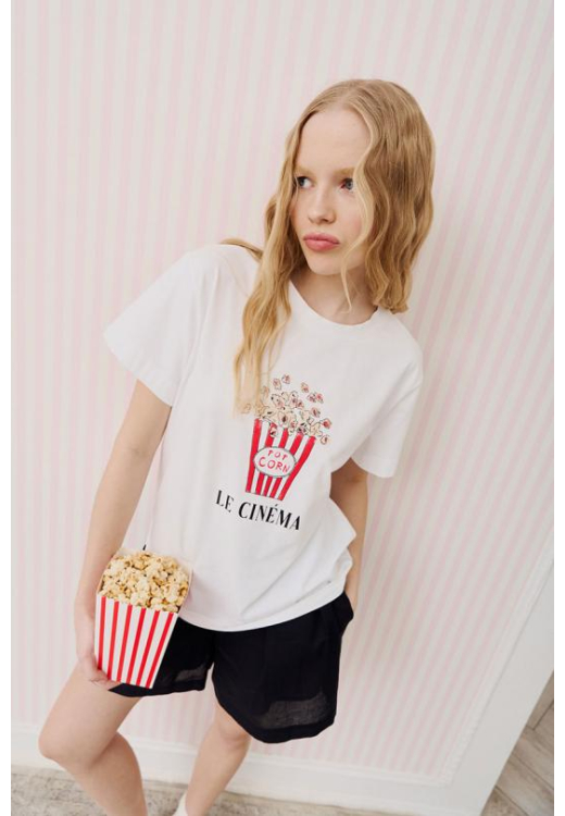 Футболка свободного кроя прямого силуэта, линия плеча спущена, рукав короткий, округлый вырез горловины обработан бейкой, по центру печать.